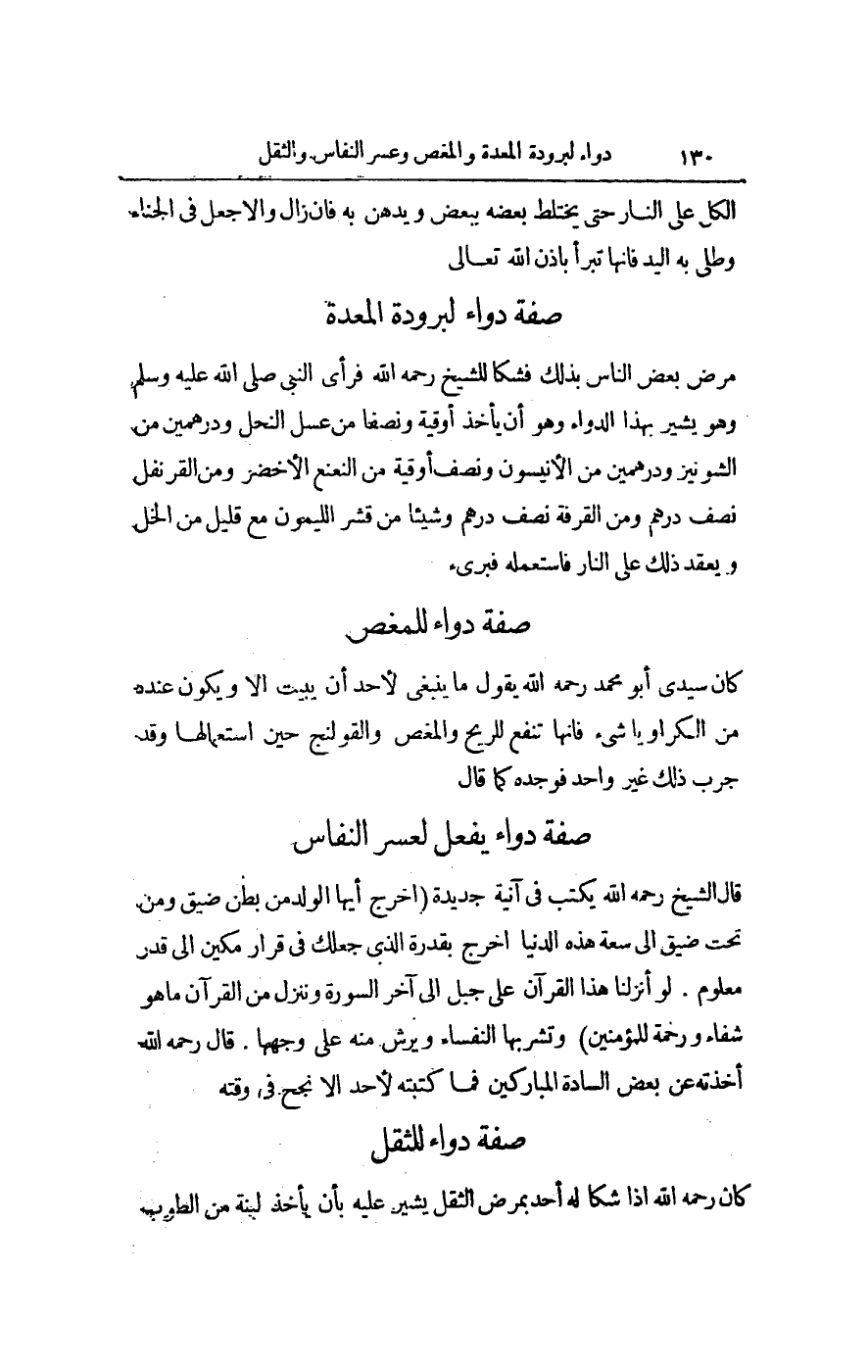 ِ مَرِضَ بَعْضُ النَّاسِ بِذَلِكَ فَشَكَا لِلشَّيْخِ - رَحِمَهُ اللَّهُ - فَرَأَى النَّبِيَّ - صَلَّى اللَّهُ عَلَيْهِ وَسَلَّمَ - وَهُوَ يُشِيرُ بِهَذَا الدَّوَاءِ وَهُوَ أَنْ يَأْخُذَ أُوقِيَّةً وَنِصْفًا مِنْ عَسَلِ النَّحْلِ وَدِرْهَمَيْنِ مِنْ الشُّونِيزِ وَدِرْهَمَيْنِ مِنْ الْأَنِيسُونِ وَنِصْفَ أُوقِيَّةٍ مِنْ النُّعْنُعِ الْأَخْضَرِ وَمِنْ الْقُرُنْفُلِ نِصْفَ دِرْهَمٍ وَمِنْ الْقِرْفَةِ نِصْفَ دِرْهَمٍ وَشَيْئًا مِنْ قِشْرِ اللَّيْمُونِ مَعَ قَلِيلٍ مِنْ الْخَلِّ وَيَعْقِدَ ذَلِكَ عَلَى النَّارِ فَاسْتَعْمَلَهُ فَبَرِئَ