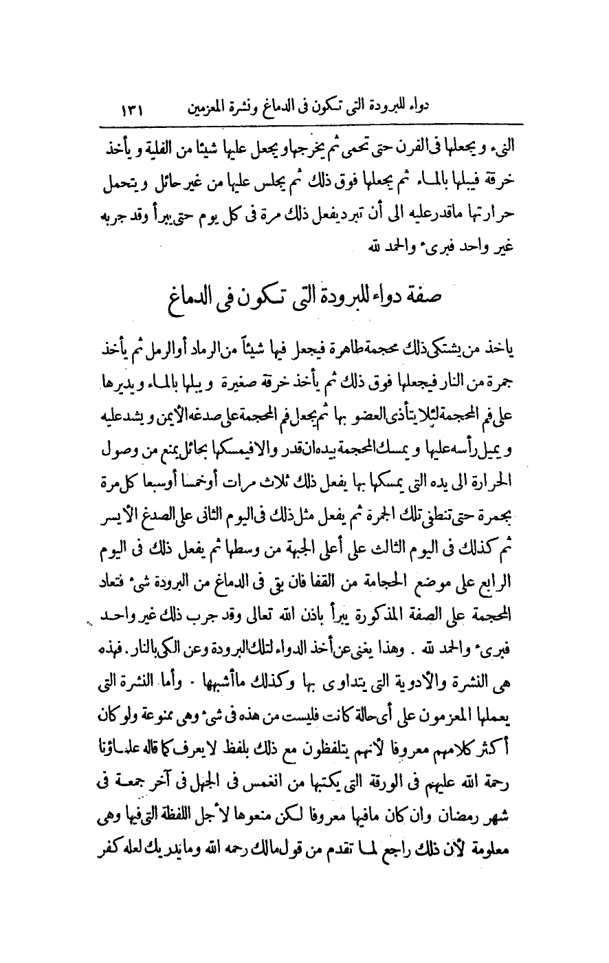 ِ يَأْخُذُ مَنْ يَشْتَكِي ذَلِكَ مِحْجَمَةً طَاهِرَةً فَيَجْعَلُ فِيهَا شَيْئًا مِنْ الرَّمَادِ أَوْ الرَّمْلِ ثُمَّ يَأْخُذَ جَمْرَةً مِنْ النَّارِ فَيَجْعَلَهَا فَوْقَ ذَلِكَ ثُمَّ يَأْخُذَ خِرْقَةً صَغِيرَةً وَيَبُلَّهَا بِالْمَاءِ وَيُدِيرَهَا عَلَى فَمِ الْمِحْجَمَةِ لِئَلَّا يَتَأَذَّى الْعُضْوُ بِهَا ثُمَّ يَجْعَلَ فَمَ الْمِحْجَمَةِ عَلَى صُدْغِهِ الْأَيْمَنِ وَيَشُدَّ عَلَيْهِ وَيُمِيلَ رَأْسَهُ عَلَيْهَا وَيُمْسِكَ الْمِحْجَمَةَ بِيَدِهِ إنْ قَدَرَ وَإِلَّا فَيُمْسِكَهَا بِحَائِلٍ يَمْنَعُ مِنْ وُصُولِ الْحَرَارَةِ إلَى يَدِهِ الَّتِي يُمْسِكُهَا بِهَا يَفْعَلُ ذَلِكَ ثَلَاثَ مَرَّاتٍ أَوْ خَمْسًا أَوْ سَبْعًا كُلَّ مَرَّةٍ بِجَمْرَةٍ حَتَّى تَنْطَفِئَ تِلْكَ الْجَمْرَةُ ثُمَّ يَفْعَلَ مِثْلَ ذَلِكَ فِي الْيَوْمِ الثَّانِي عَلَى الصُّدْغِ الْأَيْسَرِ ثُمَّ كَذَلِكَ فِي الْيَوْمِ الثَّالِثِ عَلَى أَعْلَى الْجَبْهَةِ مِنْ وَسَطِهَا ثُمَّ يَفْعَلَ ذَلِكَ فِي الْيَوْمِ الرَّابِعِ عَلَى مَوْضِعِ الْحِجَامَةِ مِنْ الْقَفَا، فَإِنْ بَقِيَ فِي الدِّمَاغِ مِنْ الْبُرُودَةِ شَيْءٌ فَتُعَادُ الْمِحْجَمَةُ عَلَى الصِّفَةِ الْمَذْكُورَةِ يَبْرَأُ بِإِذْنِ اللَّهِ تَعَالَى وَقَدْ جَرَّبَ ذَلِكَ غَيْرُ وَاحِدٍ فَبَرِئَ وَالْحَمْدُ لِلَّهِ.