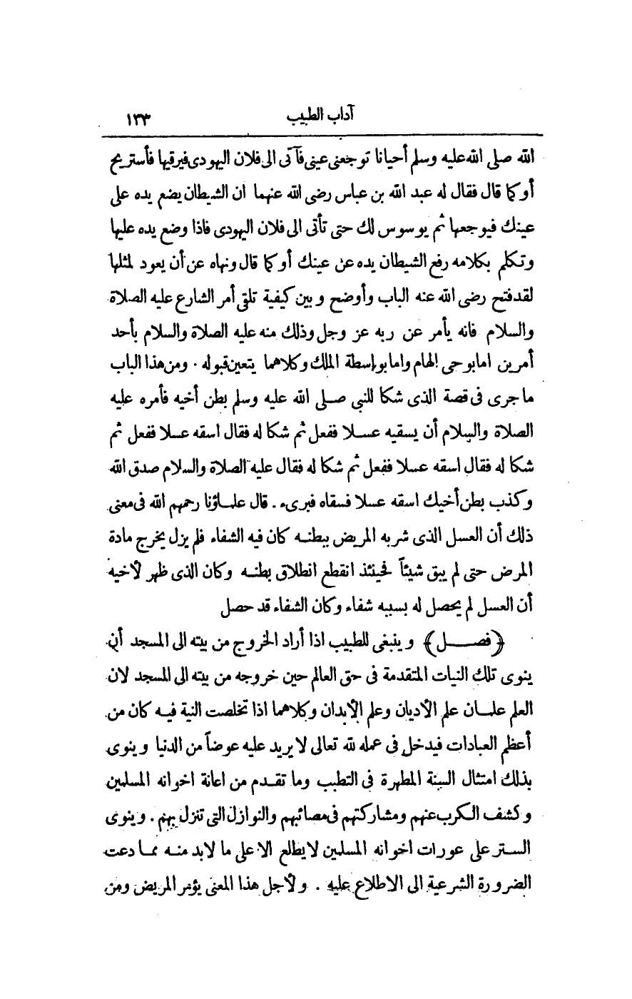 (فَصْلٌ) وَيَنْبَغِي لِلطَّبِيبِ إذَا أَرَادَ الْخُرُوجَ مِنْ بَيْتِهِ إلَى الْمَسْجِدِ أَنْ يَنْوِيَ تِلْكَ النِّيَّاتِ الْمُتَقَدِّمَةِ فِي حَقِّ الْعَالِمِ حِينَ خُرُوجِهِ مِنْ بَيْتِهِ إلَى الْمَسْجِدِ؛ لِأَنَّ الْعِلْمَ عِلْمَانِ: عِلْمُ الْأَدْيَانِ وَعِلْمُ الْأَبَدَانِ، وَكِلَاهُمَا إذَا تَخَلَّصَتْ النِّيَّةُ فِيهِ كَانَ مِنْ أَعْظَمِ الْعِبَادَاتِ فَيَدْخُلُ فِي عَمَلِهِ لِلَّهِ تَعَالَى لَا يُرِيدُ عَلَيْهِ عِوَضًا مِنْ الدُّنْيَا وَيَنْوِي بِذَلِكَ امْتِثَالَ السُّنَّةِ الْمُطَهَّرَةِ فِي التَّطَبُّبِ وَمَا تَقَدَّمَ مِنْ إعَانَةِ إخْوَانِهِ الْمُسْلِمِينَ وَكَشْفِ الْكَرْبِ عَنْهُمْ وَمُشَارَكَتِهِمْ فِي مَصَائِبِهِمْ وَالنَّوَازِلِ الَّتِي تَنْزِلُ بِهِمْ.