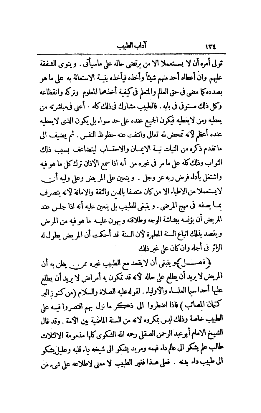 وَيَتَعَيَّنُ عَلَى الْمَرِيضِ وَعَلَى وَلِيِّهِ أَنْ لَا يَسْتَعْمِلَا مِنْ الْأَطِبَّاءِ إلَّا مَنْ كَانَ مُتَّصِفًا بِالدِّينِ وَالثِّقَةِ وَالْأَمَانَةِ؛ لِأَنَّهُ يَتَصَرَّفُ بِمَا يَصِفُهُ فِي مُهَجِ الْمَرْضَى. وَيَنْبَغِي لِلطَّبِيبِ بَلْ يَتَعَيَّنُ عَلَيْهِ أَنَّهُ إذَا جَلَسَ عِنْدَ الْمَرِيضِ أَنْ يُؤْنِسَهُ بِبَشَاشَةِ الْوَجْهِ وَطَلَاقَتِهِ وَيُهَوِّنَ عَلَيْهِ مَا هُوَ فِيهِ مِنْ الْمَرَضِ وَيَقْصِدَ بِذَلِكَ اتِّبَاعَ السُّنَّةِ الْمُطَهَّرَةِ؛ لِأَنَّ السُّنَّةَ قَدْ أَحْكَمَتْ أَنَّ الْمَرِيضَ يُطَوِّلُ لَهُ الزَّائِرُ فِي أَجَلِهِ وَإِنْ كَانَ عَلَى غَيْرِ ذَلِكَ