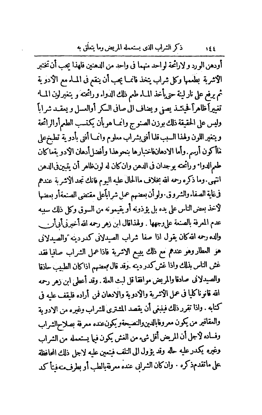 أَوْ دُهْنَ الْوَرْدِ، وَلَا رَائِحَةَ لِوَاحِدٍ مِنْهُمَا فِي وَاحِدٍ مِنْ الدُّهْنَيْنِ فَلِهَذَا يَجِبُ أَنْ تُخْتَبَرَ الْأَشْرِبَةُ بِطَعْمِهَا وَكُلُّ شَرَابٍ يُتَّخَذُ فَإِنَّمَا يَجِبُ أَنْ يُنْقَعَ فِي الْمَاءِ مَعَ الْأَدْوِيَةِ ثُمَّ يُرْفَعَ عَلَى نَارٍ لَيِّنَةٍ حَتَّى يَأْخُذَ الْمَاءُ طَعْمَ ذَلِكَ الدَّوَاءِ وَرَائِحَتَهُ وَيَتَغَيَّرَ لَوْنُ الْمَاءِ تَغْيِيرًا ظَاهِرًا، فَحِينَئِذٍ يُصَفَّى وَيُضَافُ إلَى صَافِي السُّكَّرِ أَوْ الْعَسَلِ وَيُعْقَدُ شَرَابًا وَلَيْسَ عَلَى الْحَقِيقَةِ ذَلِكَ بِوَزْنِ الصُّنُوجِ وَإِنَّمَا هُوَ بِأَنْ يَكْتَسِبَ الطَّعْمَ أَوْ الرَّائِحَةَ وَيَتَغَيَّرَ اللَّوْنُ وَلِهَذَا السَّبَبِ قَلَّمَا أُفْتِي بِشَرَابٍ مَعْلُومٍ وَإِنَّمَا أُفْتِي بِأَدْوِيَةٍ تُطْبَخُ عَلَى مَا أَكُونُ أَرْسُمُ. وَأَمَّا الْأَدْهَانُ فَاخْتِبَارُهَا بِنَحْوِ هَذَا، وَأَفْضَلُ أَدْهَانِ الْأَدْوِيَةِ مَا كَانَ طَعْمُ الدَّوَاءِ وَرَائِحَتُهُ يُوجَدَانِ فِي الدُّهْنِ وَإِنْ كَانَ لَهُ لَوْنٌ ظَاهِرٌ أَنْ يَتَبَيَّنَ فِي الدُّهْنِ انْتَهَى.