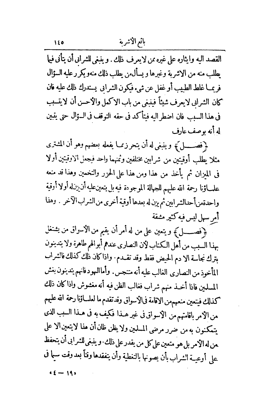 (فَصْلٌ) وَيَتَعَيَّنُ عَلَى مَنْ لَهُ أَمْرٌ أَنْ يُقِيمَ مِنْ الْأَسْوَاقِ مَنْ يَشْتَغِلُ بِهَذَا السَّبَبِ مِنْ أَهْلِ الْكِتَابِ؛ لِأَنَّ النَّصَارَى عِنْدَهُمْ أَبْوَالُهُمْ طَاهِرَةٌ، وَلَا يَتَدَيَّنُونَ بِتَرْكِ نَجَاسَةٍ إلَّا دَمَ الْحَيْضِ فَقَطْ وَقَدْ تَقَدَّمَ. وَإِذَا كَانَ ذَلِكَ كَذَلِكَ فَالشَّرَابُ الْمَأْخُوذُ مِنْ النَّصَارَى الْغَالِبُ عَلَيْهِ أَنَّهُ مُتَنَجِّسٌ.