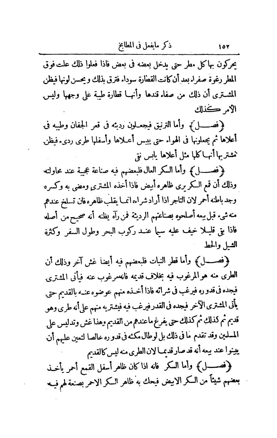 (فَصْلٌ) وَأَمَّا السُّكَّرُ فَإِنَّهُ إذَا كَانَ ظَاهِرُ أَسْفَلِ الْقِمْعِ أَحْمَرَ يَأْخُذُ بَعْضُهُمْ شَيْئًا مِنْ السُّكَّرِ الْأَبْيَضِ فَيَحُكُّ بِهِ ظَاهِرَ السُّكَّرِ الْأَحْمَرِ بِصَنْعَةٍ لَهُمْ فِيهِ