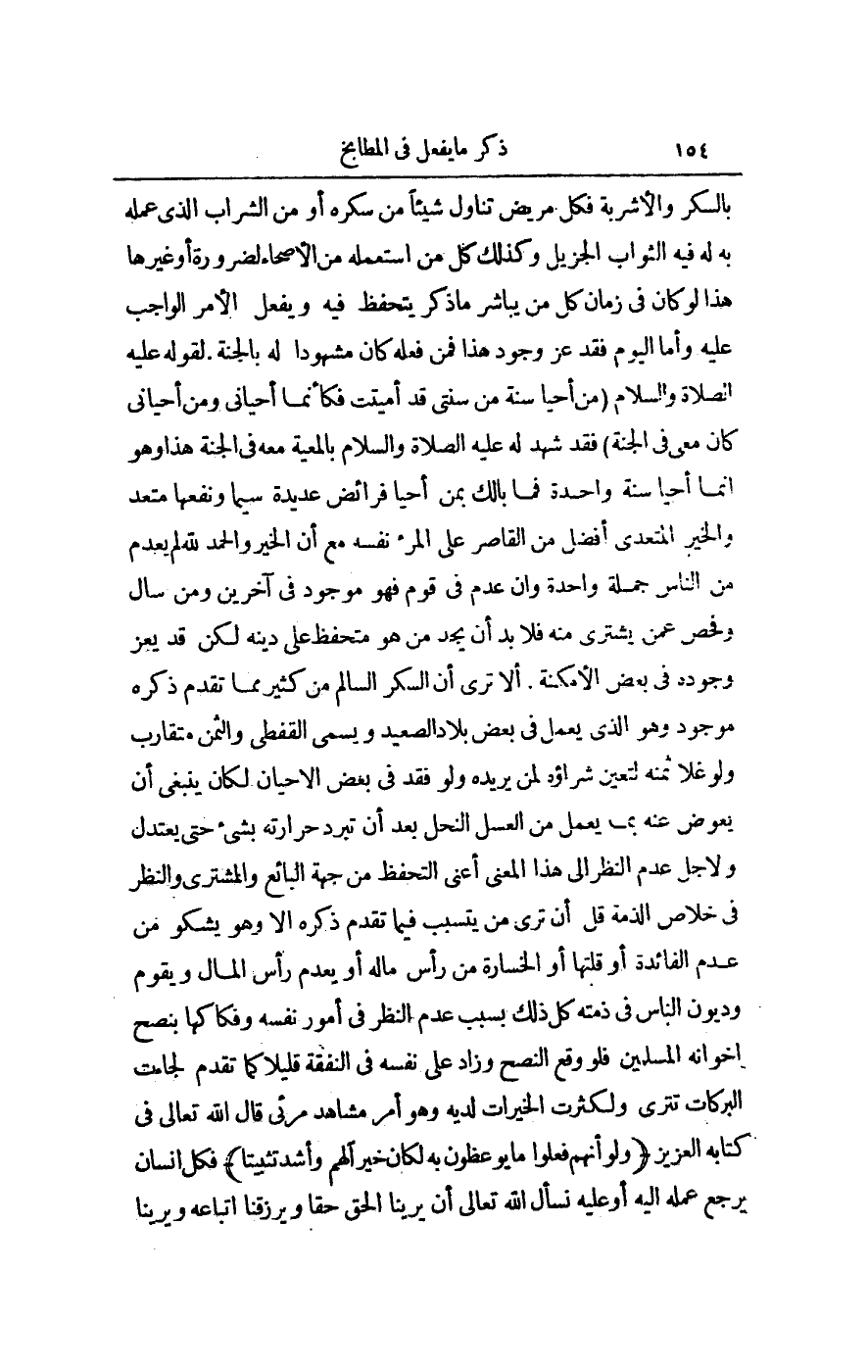 أَلَا تَرَى أَنَّ السُّكَّرَ السَّالِمَ مِنْ كَثِيرٍ مِمَّا تَقَدَّمَ ذِكْرُهُ مَوْجُودٌ وَهُوَ الَّذِي يُعْمَلُ فِي بَعْضِ بِلَادِ الصَّعِيدِ وَيُسَمَّى الْقِفْطِيَّ وَالثَّمَنُ مُتَقَارِبٌ، وَلَوْ غَلَا ثَمَنُهُ لَتَعَيَّنَ شِرَاؤُهُ لِمَنْ يُرِيدُهُ، وَلَوْ فُقِدَ فِي بَعْضِ الْأَحْيَانِ لَكَانَ يَنْبَغِي أَنْ يُعَوَّضَ عَنْهُ بِمَا يُعْمَلُ مِنْ عَسَلِ النَّحْلِ بَعْدَ أَنْ تَبْرُدَ حَرَارَتُهُ بِشَيْءٍ حَتَّى يَعْتَدِلَ وَلِأَجْلِ عَدَمِ النَّظَرِ إلَى هَذَا الْمَعْنَى أَعْنِي التَّحَفُّظَ مِنْ جِهَةِ الْبَائِعِ وَالْمُشْتَرِي وَالنَّظَرُ فِي خَلَاصِ الذِّمَّةِ قَلَّ أَنْ تَرَى مَنْ يَتَسَبَّبُ فِيمَا تَقَدَّمَ ذِكْرُهُ إلَّا وَهُوَ يَشْكُو مِنْ عَدَمِ الْفَائِدَةِ أَوْ قِلَّتِهَا أَوْ الْخَسَارَةِ مِنْ رَأْسِ مَالِهِ أَوْ يُعْدَمُ رَأْسُ الْمَالِ وَيُقَوَّمُ وَدُيُونُ النَّاسِ فِي ذِمَّتِهِ؛ كُلُّ ذَلِكَ بِسَبَبِ عَدَمِ النَّظَرِ فِي أُمُورِ نَفْسِهِ وَفِكَاكِهَا بِنُصْحِ إخْوَانِهِ الْمُسْلِمِينَ فَلَوْ وَقَعَ النُّصْحُ وَزَادَ عَلَى نَفْسِهِ فِي النَّفَقَةِ قَلِيلًا كَمَا تَقَدَّمَ لَجَاءَتْ الْبَرَكَاتُ تَتْرَى وَلَكَثُرَتْ الْخَيْرَاتُ لَدَيْهِ وَهُوَ أَمْرٌ مُشَاهَدٌ مَرْئِيٌّ، قَالَ اللَّهُ تَعَالَى فِي كِتَابِهِ الْعَزِيزِ {وَلَوْ أَنَّهُمْ فَعَلُوا مَا يُوعَظُونَ بِهِ لَكَانَ خَيْرًا لَهُمْ وَأَشَدَّ تَثْبِيتًا} [النساء: 66] فَكُلُّ إنْسَانٍ يَرْجِعُ عَمَلُهُ إلَيْهِ أَوْ عَلَيْهِ نَسْأَلُ اللَّهَ تَعَالَى أَنْ يُرِيَنَا الْحَقَّ حَقًّا وَيَرْزُقَنَا اتِّبَاعَهُ وَيُرِيَنَا