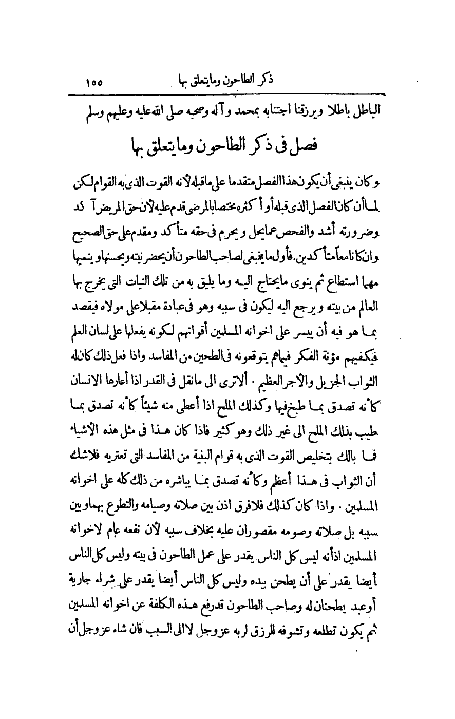 وَكَانَ يَنْبَغِي أَنْ يَكُونَ هَذَا الْفَصْلُ مُتَقَدِّمًا عَلَى مَا قَبْلَهُ؛ لِأَنَّهُ الْقُوتُ الَّذِي بِهِ الْقَوَامُ لَكِنْ لَمَّا أَنْ كَانَ الْفَصْلُ الَّذِي قَبْلَهُ أَوْ أَكْثُرُهُ مُخْتَصًّا بِالْمَرْضَى قُدِّمَ عَلَيْهِ؛ لِأَنَّ حَقَّ الْمَرِيضِ آكَدُ وَضَرُورَتَهُ أَشَدُّ وَالْفَحْصُ عَمَّا يَحِلُّ وَيَحْرُمُ فِي حَقِّهِ مُتَأَكِّدٌ وَمُقَدَّمٌ عَلَى حَقِّ الصَّحِيحِ وَإِنْ كَانَا مَعًا مُتَأَكِّدَيْنِ. فَأَوَّلُ مَا يَنْبَغِي لِصَاحِبِ الطَّاحُونِ أَنْ يُحْضِرَ نِيَّتَهُ وَيُحْسِنَهَا وَيُنَمِّيَهَا مَهْمَا اسْتَطَاعَ ثُمَّ يَنْوِيَ مَا يَحْتَاجُ إلَيْهِ وَمَا يَلِيقُ بِهِ مِنْ تِلْكَ النِّيَّاتِ الَّتِي يَخْرُجُ بِهَا الْعَالِمُ مِنْ بَيْتِهِ وَيَرْجِعُ إلَيْهِ لِيَكُونَ فِي سَبَبِهِ وَهُوَ فِي عِبَادَةٍ مُقْبِلًا عَلَى مَوْلَاهُ فَيَقْصِدُ بِمَا هُوَ فِيهِ أَنْ يُيَسِّرَ عَلَى إخْوَانِهِ الْمُسْلِمِينَ أَقْوَاتَهُمْ لِكَوْنِهِ يَفْعَلُهَا عَلَى لِسَانِ الْعِلْمِ فَيَكْفِيهِمْ مُؤْنَةَ الْفِكْرِ فِيمَا هُمْ يَتَوَقَّعُونَهُ فِي الطَّحِينِ مِنْ الْمَفَاسِدِ وَإِذَا فَعَلَ ذَلِكَ كَانَ لَهُ الثَّوَابُ الْجَزِيلُ وَالْأَجْرُ الْعَظِيمُ.