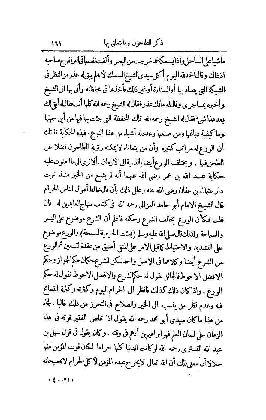 مَاشِيًا عَلَى السَّاحِلِ وَإِذَا بِسَمَكَةٍ قَدْ خَرَجَتْ مِنْ الْبَحْرِ وَأَلْقَتْ نَفْسَهَا فِي الْبَرِّ فَفَرِحَ صَاحِبُهُ إذْ ذَاكَ وَقَالَ: الْحَمْدُ لِلَّهِ الْيَوْمَ يَأْكُلُ سَيِّدِي الشَّيْخُ السَّمَكَ؛ لِأَنَّهُ لَمْ يَبْقَ لَهُ عُذْرٌ مِنْ النَّظَرِ فِي الشَّبَكَةِ الَّتِي يُصَادُ بِهَا أَوْ السِّنَّارَةِ أَوْ غَيْرِ ذَلِكَ فَأَخَذَهَا فِي مِحْفَظَتِهِ وَأَتَى بِهَا إلَى الشَّيْخِ وَأَخْبَرَهُ بِمَا جَرَى وَقَالَ لَهُ مَا لَك عُذْرٌ فَقَالَ لَهُ الشَّيْخُ - رَحِمَهُ اللَّهُ -: كُلْهَا أَنْتَ، فَقَالَ لَهُ: أَبَقِيَ لَك بَعْدَ هَذَا شَيْءٌ؟ فَقَالَ لَهُ الشَّيْخُ - رَحِمَهُ اللَّهُ -: تِلْكَ الْمِحْفَظَةُ الَّتِي جِئْت بِهَا فِيهَا مِنْ أَيْنَ جِهَتُهَا وَمَا كَيْفِيَّةُ دِبَاغِهَا وَمَنْ صَنَعَهَا وَعَدَّدَ لَهُ أَشْيَاءَ مِنْ هَذَا النَّوْعِ.