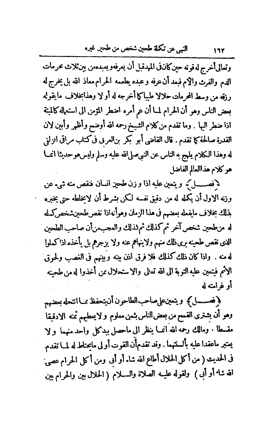 (فَصْلٌ) وَيَتَعَيَّنُ عَلَيْهِ إذَا وَزَنَ طَحِينَ إنْسَانٍ فَنَقَصَ مِنْهُ شَيْءٌ عَنْ وَزْنِهِ الْأَوَّلِ أَنْ يُكْمِلَهُ لَهُ مِنْ دَقِيقِ نَفْسِهِ لَكِنْ بِشَرْطِ أَنْ لَا يَخْلِطَهُ حَتَّى يُخْبِرَهُ بِذَلِكَ بِخِلَافِ مَا يَفْعَلُهُ بَعْضُهُمْ فِي هَذَا الزَّمَانِ وَهُوَ أَنَّهُ إذَا نَقَصَ طَحِينُ شَخْصٍ كَمَّلَهُ لَهُ مِنْ طَحِينِ شَخْصٍ آخَرَ ثُمَّ كَذَلِكَ ثُمَّ كَذَلِكَ، وَالْعَجَبُ مِنْ أَنَّ صَاحِبَ الطَّحِينِ الَّذِي نَقَصَ طَحِينُهُ يَرَى ذَلِكَ مِنْهُمْ، وَلَا يَنْهَاهُمْ عَنْهُ، وَلَا يَزْجُرُهُمْ بَلْ يَأْخُذُهُ إذَا كَمَّلُوا لَهُ مِنْهُ. وَإِذَا كَانَ ذَلِكَ كَذَلِكَ فَلَا فَرْقَ إذَنْ بَيْنَهُ وَبَيْنَهُمْ فِي الْغَصْبِ وَلُحُوقِ الْإِثْمِ فَيَتَعَيَّنُ عَلَيْهِ التَّوْبَةُ إلَى اللَّهِ تَعَالَى وَالِاسْتِحْلَالُ مِمَّنْ أَخَذُوا لَهُ مِنْ طَحِينِهِ أَوْ غَرَامَتُهُ لَهُ