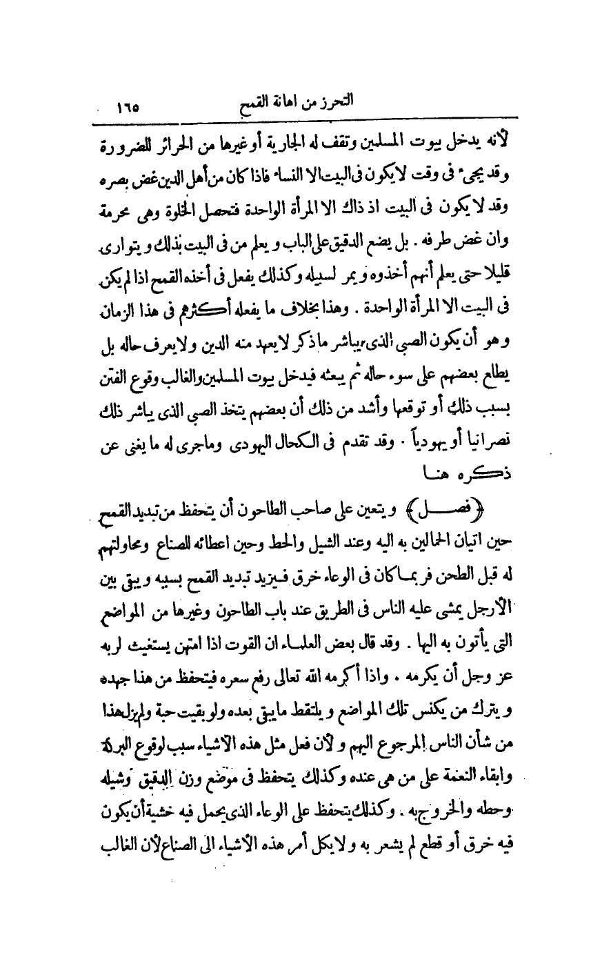 لِأَنَّهُ يَدْخُلُ بُيُوتَ الْمُسْلِمِينَ وَتَقِفُ لَهُ الْجَارِيَةُ أَوْ غَيْرُهَا مِنْ الْحَرَائِرِ لِلضَّرُورَةِ وَقَدْ يَجِيءُ فِي وَقْتٍ لَا يَكُونُ فِي الْبَيْتِ إلَّا النِّسَاءُ فَإِذَا كَانَ مِنْ أَهْلِ الدِّينِ غَضَّ بَصَرَهُ وَقَدْ لَا يَكُونُ فِي الْبَيْتِ إذْ ذَاكَ إلَّا الْمَرْأَةُ الْوَاحِدَةُ فَتَحْصُلُ الْخَلْوَةُ وَهِيَ مُحَرَّمَةٌ وَإِنْ غَضَّ طَرْفَهُ. بَلْ يَضَعُ الدَّقِيقَ عَلَى الْبَابِ وَيُعْلِمُ مَنْ فِي الْبَيْتِ بِذَلِكَ وَيَتَوَارَى قَلِيلًا حَتَّى يَعْلَمَ أَنَّهُمْ أَخَذُوهُ وَيَمُرُّ لِسَبِيلِهِ، وَكَذَلِكَ يَفْعَلُ فِي أَخْذِهِ الْقَمْحَ إذَا لَمْ يَكُنْ فِي الْبَيْتِ إلَّا الْمَرْأَةُ الْوَاحِدَةُ. وَهَذَا بِخِلَافِ مَا يَفْعَلُهُ أَكْثَرُهُمْ فِي هَذَا الزَّمَانِ وَهُوَ أَنْ يَكُونَ الصَّبِيُّ الَّذِي يُبَاشِرُ مَا ذُكِرَ لَا يُعْهَدُ مِنْهُ الدِّينُ، وَلَا يُعْرَفُ حَالُهُ بَلْ يَطَّلِعُ بَعْضُهُمْ عَلَى سُوءِ حَالِهِ ثُمَّ يَبْعَثُهُ فَيَدْخُلُ بُيُوتَ الْمُسْلِمِينَ وَالْغَالِبُ وُقُوعُ الْفِتَنِ بِسَبَبِ ذَلِكَ أَوْ تَوَقُّعُهَا وَأَشَدُّ مِنْ ذَلِكَ أَنَّ بَعْضَهُمْ يَتَّخِذُ الصَّبِيَّ الَّذِي يُبَاشِرُ ذَلِكَ نَصْرَانِيًّا أَوْ يَهُودِيًّا.