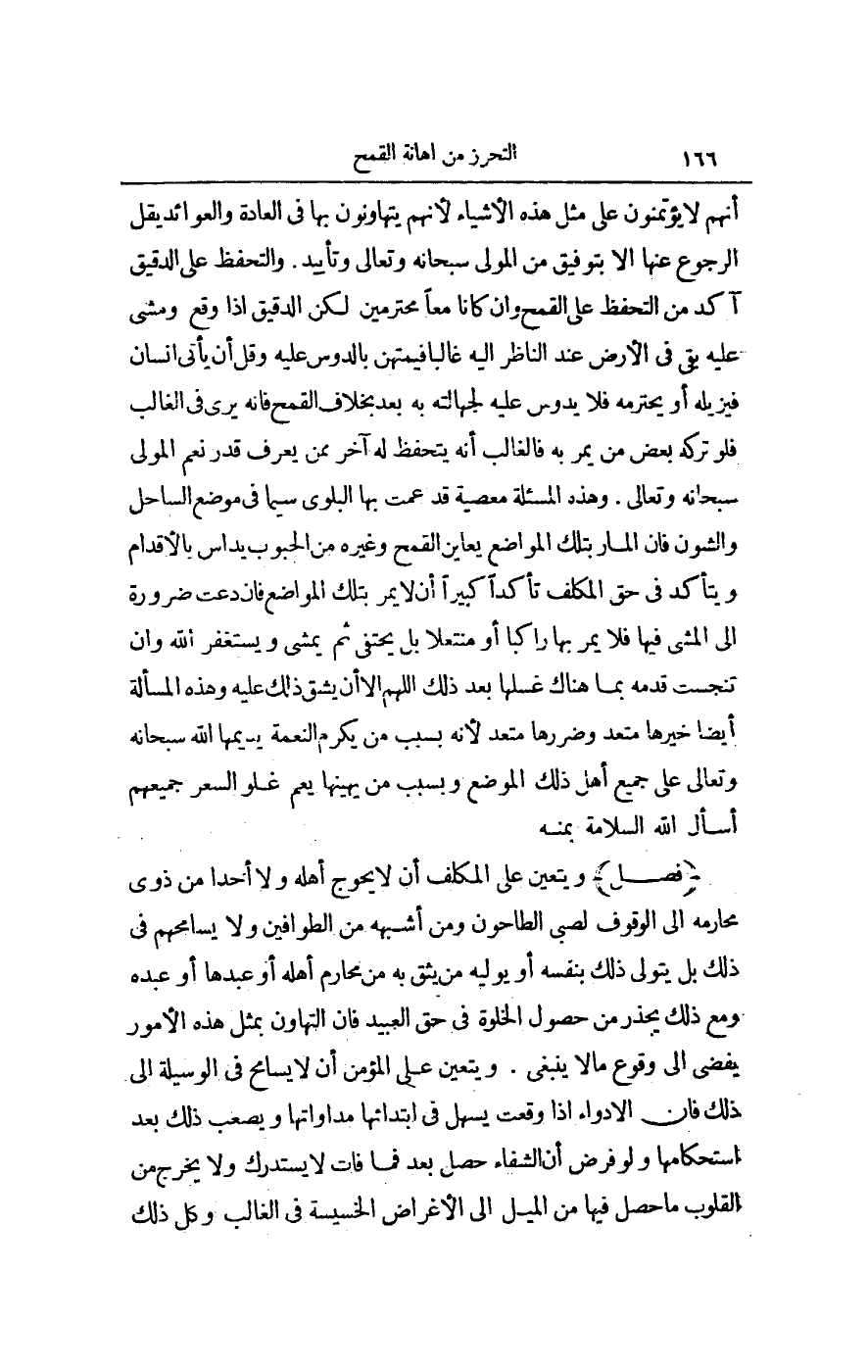 وَالتَّحَفُّظُ عَلَى الدَّقِيقِ آكَدُ مِنْ التَّحَفُّظِ عَلَى الْقَمْحِ وَإِنْ كَانَا مَعًا مُحْتَرَمَيْنِ لَكِنَّ الدَّقِيقَ إذَا وَقَعَ وَمَشَى عَلَيْهِ بَقِيَ فِي الْأَرْضِ عِنْدَ النَّاظِرِ إلَيْهِ غَالِبًا فَيُمْتَهَنُ بِالدَّوْسِ عَلَيْهِ وَقَلَّ أَنْ يَأْتِيَ إنْسَانٌ فَيُزِيلَهُ أَوْ يَحْتَرِمَهُ فَلَا يَدُوسَ عَلَيْهِ لِجَهَالَتِهِ بِهِ بَعْدُ بِخِلَافِ الْقَمْحِ فَإِنَّهُ يُرَى فِي الْغَالِبِ فَلَوْ تَرَكَهُ بَعْضُ مَنْ يَمُرُّ بِهِ فَالْغَالِبُ أَنَّهُ يَتَحَفَّظُ لَهُ آخَرُ مِمَّنْ يَعْرِفُ قَدْرَ نِعَمِ الْمَوْلَى سُبْحَانَهُ وَتَعَالَى. وَهَذِهِ الْمَسْأَلَةُ مَعْصِيَةٌ قَدْ عَمَّتْ بِهَا الْبَلْوَى سِيَّمَا فِي مَوْضِعِ السَّاحِلِ وَالْشُّوَنِ فَإِنَّ الْمَارَّ بِتِلْكَ الْمَوَاضِعِ يُعَايِنُ الْقَمْحَ وَغَيْرَهُ مِنْ الْحُبُوبِ يُدَاسُ بِالْأَقْدَامِ وَيَتَأَكَّدُ فِي حَقِّ الْمُكَلَّفِ تَأَكُّدًا كَبِيرًا أَنْ لَا يَمُرَّ بِتِلْكَ الْمَوَاضِعِ فَإِنْ دَعَتْ ضَرُورَةٌ إلَى الْمَشْيِ فِيهَا فَلَا يَمُرُّ بِهَا رَاكِبًا أَوْ مُنْتَعِلًا بَلْ يَحْتَفِي ثُمَّ يَمْشِي وَيَسْتَغْفِرُ اللَّهَ وَإِنْ تَنَجَّسَتْ قَدَمُهُ بِمَا هُنَاكَ غَسَلَهَا بَعْدَ ذَلِكَ اللَّهُمَّ إلَّا أَنْ يَشُقَّ ذَلِكَ عَلَيْهِ وَهَذِهِ الْمَسْأَلَةُ أَيْضًا خَيْرُهَا مُتَعَدٍّ وَضَرَرُهَا مُتَعَدٍّ؛ لِأَنَّهُ بِسَبَبِ مَنْ يُكْرِمُ النِّعْمَةَ يُدِيمُهَا اللَّهُ سُبْحَانَهُ وَتَعَالَى عَلَى جَمِيعِ أَهْلِ ذَلِكَ الْمَوْضِعِ وَبِسَبَبِ مَنْ يُهِينُهَا يَعُمُّ غُلُوُّ السِّعْرِ جَمِيعَهُمْ أَسْأَلُ اللَّهَ السَّلَامَةَ بِمَنِّهِ