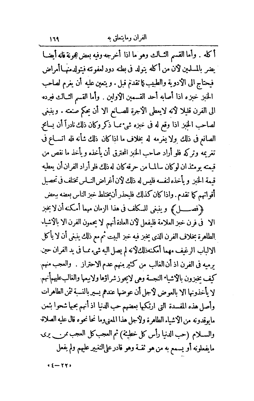 (فَصْلٌ) وَيَنْبَغِي لِلْمُكَلَّفِ فِي هَذَا الزَّمَانِ مَهْمَا أَمْكَنَهُ أَنْ لَا يَخْبِزَ إلَّا فِي فُرْنِ خُبْزِ الْعَلَّامَةِ فَلْيَفْعَلْ؛ لِأَنَّ الْعَادَةَ أَنَّهُمْ لَا يُحْمُونَ الْفُرْنَ إلَّا بِالْأَشْيَاءِ الطَّاهِرَةِ بِخِلَافِ الْفُرْنِ الَّذِي يُخْبَزُ فِيهِ خُبْزُ الْبَيْتِ ثُمَّ مَعَ ذَلِكَ يَنْبَغِي أَنْ لَا يَأْكُلَ إلَّا لُبَابَ الرَّغِيفِ مَهْمَا أَمْكَنَهُ ذَلِكَ؛ لِأَنَّهُ لَمْ يَصِلْ إلَيْهِ شَيْءٌ مِمَّا فِي يَدِ الْفَرَّانِ حِينَ يَرْمِيهِ فِي الْفُرْنِ إذْ إنَّ الْغَالِبَ مِنْ كَثِيرٍ مِنْهُمْ عَدَمُ الِاحْتِرَازِ.