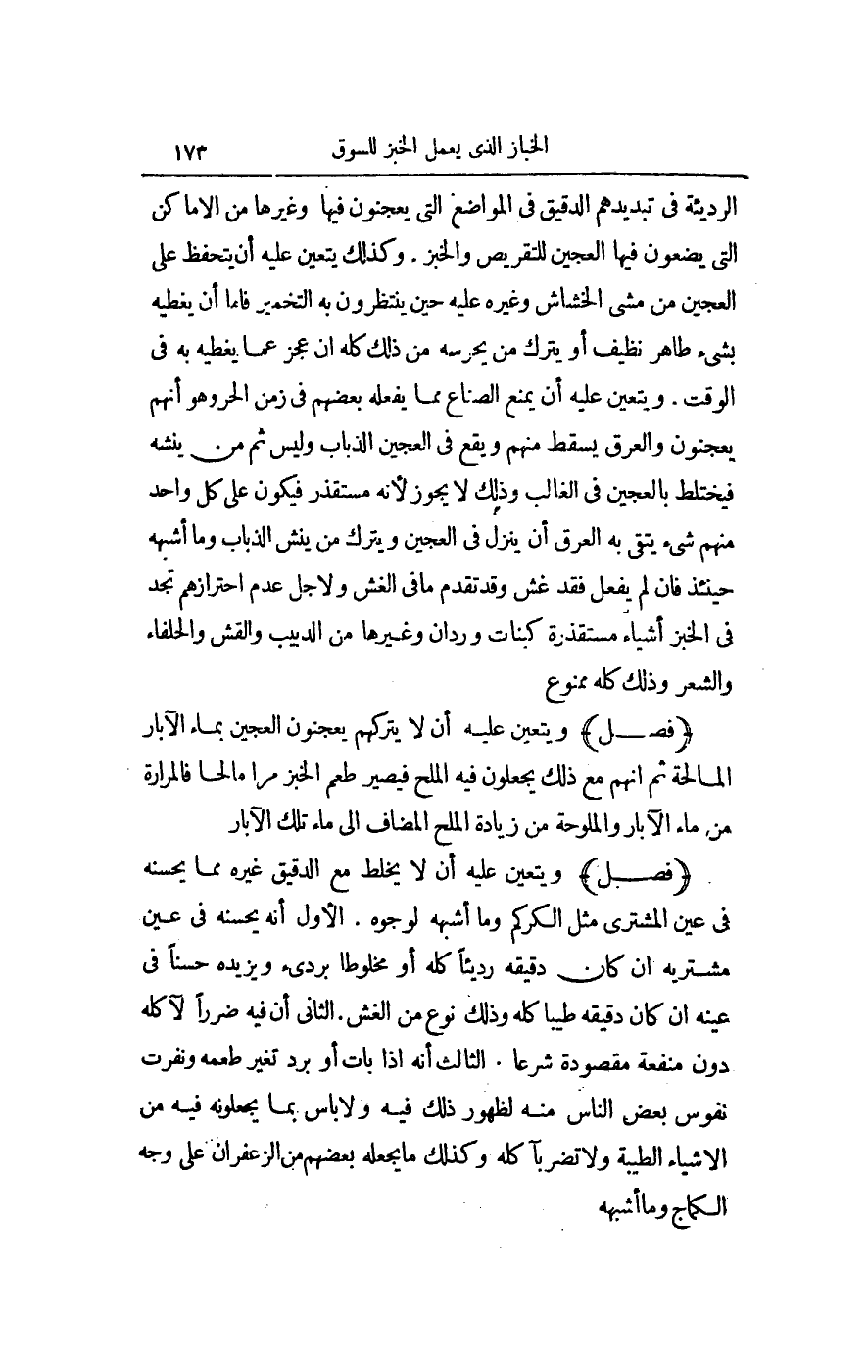 فَصْلٌ وَيَتَعَيَّنُ عَلَيْهِ أَنْ لَا يَتْرُكَهُمْ يَعْجِنُونَ الْعَجِينَ بِمَاءِ الْآبَارِ الْمَالِحَةِ، ثُمَّ إنَّهُمْ مَعَ ذَلِكَ يَجْعَلُونَ فِيهِ الْمِلْحَ فَيَصِيرُ طَعْمُ الْخُبْزِ مُرًّا مَالِحًا فَالْمَرَارَةُ مِنْ مَاءِ الْآبَارِ وَالْمُلُوحَةُ مِنْ زِيَادَةِ الْمِلْحِ الْمُضَافِ إلَى مَاءِ تِلْكَ الْآبَارِ