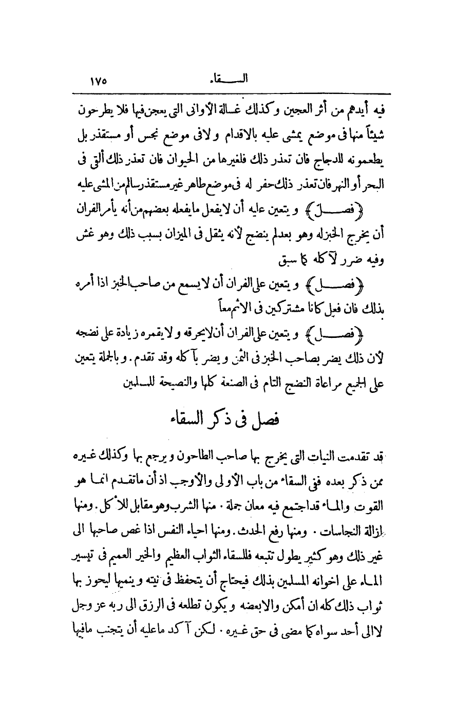 (فَصْلٌ) وَيَتَعَيَّنُ عَلَيْهِ أَنْ لَا يَفْعَلَ مَا يَفْعَلُهُ بَعْضُهُمْ مِنْ أَنَّهُ يَأْمُرُ الْفَرَّانَ أَنْ يُخْرِجَ الْخُبْزَ لَهُ وَهُوَ بَعْدُ لَمْ يَنْضَجْ؛ لِأَنَّهُ يَثْقُلُ فِي الْمِيزَانِ بِسَبَبِ ذَلِكَ وَهُوَ غِشٌّ وَفِيهِ ضَرَرٌ لِآكِلِهِ كَمَا سَبَقَ (فَصْلٌ) وَيَتَعَيَّنُ عَلَى الْفَرَّانِ أَنْ لَا يَسْمَعَ مِنْ صَاحِبِ الْخُبْزِ إذَا أَمَرَهُ بِذَلِكَ فَإِنْ فَعَلَ كَانَا مُشْتَرِكَيْنِ فِي الْإِثْمِ مَعًا