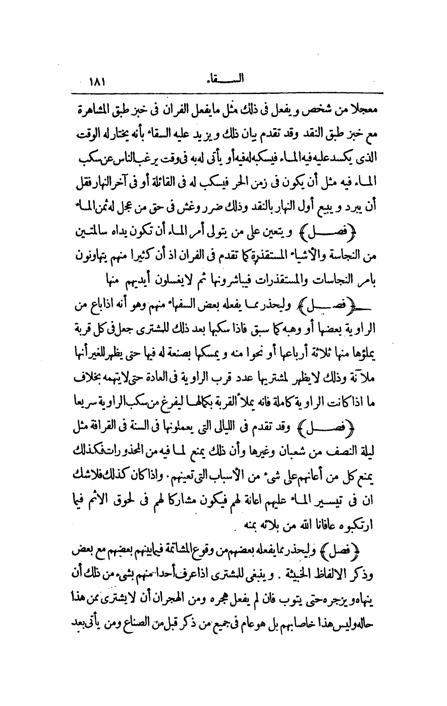 (فَصْلٌ) وَيَتَعَيَّنُ عَلَى مَنْ يَتَوَلَّى أَمْرَ الْمَاءِ أَنْ تَكُونَ يَدَاهُ سَالِمَتَيْنِ مِنْ النَّجَاسَةِ وَالْأَشْيَاءِ الْمُسْتَقْذَرَةِ كَمَا تَقَدَّمَ فِي الْفَرَّانِ إذْ أَنَّ كَثِيرًا مِنْهُمْ يَتَهَاوَنُونَ بِأَمْرِ النَّجَاسَاتِ وَالْمُسْتَقْذِرَات فَيُبَاشِرُونَهَا ثُمَّ لَا يَغْسِلُونَ أَيْدِيَهُمْ مِنْهَا
