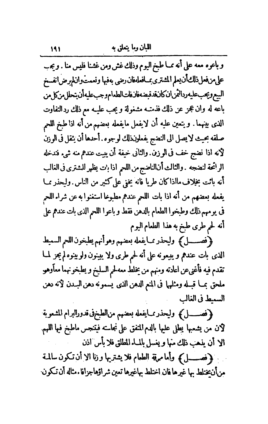 (فَصْلٌ) وَلْيَحْذَرْ مِمَّا يَفْعَلُهُ بَعْضُهُمْ وَهُوَ أَنَّهُمْ يَطْبُخُونَ اللَّحْمَ السَّمِيطَ الَّذِي بَاتَ عِنْدَهُمْ وَيَبِيعُونَهُ عَلَى أَنَّهُ لَحْمٌ طَرِيٌّ، وَلَا يُبَيِّنُونَ، وَلَوْ بَيَّنُوهُ لَمْ يَجُزْ لِمَا تَقَدَّمَ فِيهِ فَأَغْنَى عَنْ إعَادَتِهِ وَمِنْهُمْ مَنْ يَخْلِطُ مَعَهُ لَحْمَ السَّلِيخِ وَيَطْبُخُونَهُمَا مَعًا وَهُوَ مُلْحَقٌ بِمَا قَبْلَهُ وَمِثْلُهُمَا فِي الْمَنْعِ الدُّهْنُ الَّذِي يُسَمُّونَهُ دُهْنَ الْبُدْنِ؛ لِأَنَّهُ دُهْنُ السَّمِيطِ فِي الْغَالِبِ