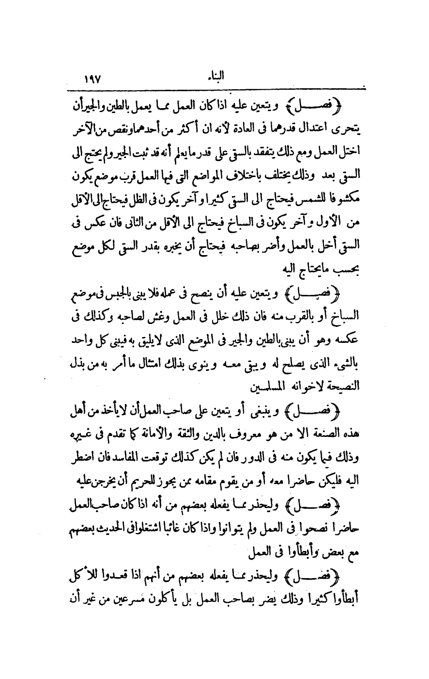(فَصْلٌ) وَيَتَعَيَّنُ عَلَيْهِ أَنْ يَنْصَحَ فِي عَمَلِهِ فَلَا يَبْنِي بِالْجِبْسِ فِي مَوْضِعِ السِّبَاخِ أَوْ بِالْقُرْبِ مِنْهُ فَإِنَّ ذَلِكَ خَلَلٌ فِي الْعَمَلِ وَغِشٌّ لِصَاحِبِهِ، وَكَذَلِكَ فِي عَكْسِهِ وَهُوَ أَنْ يَبْنِيَ بِالطِّينِ وَالْجِيرِ فِي الْمَوْضِعِ الَّذِي لَا يَلِيقُ بِهِ فَيَبْنِي كُلَّ وَاحِدٍ بِالشَّيْءِ الَّذِي يَصْلُحُ لَهُ وَيَبْقَى مَعَهُ وَيَنْوِي بِذَلِكَ امْتِثَالَ مَا أُمِرَ بِهِ مِنْ بَذْلِ النَّصِيحَةِ لِإِخْوَانِهِ الْمُسْلِمِينَ