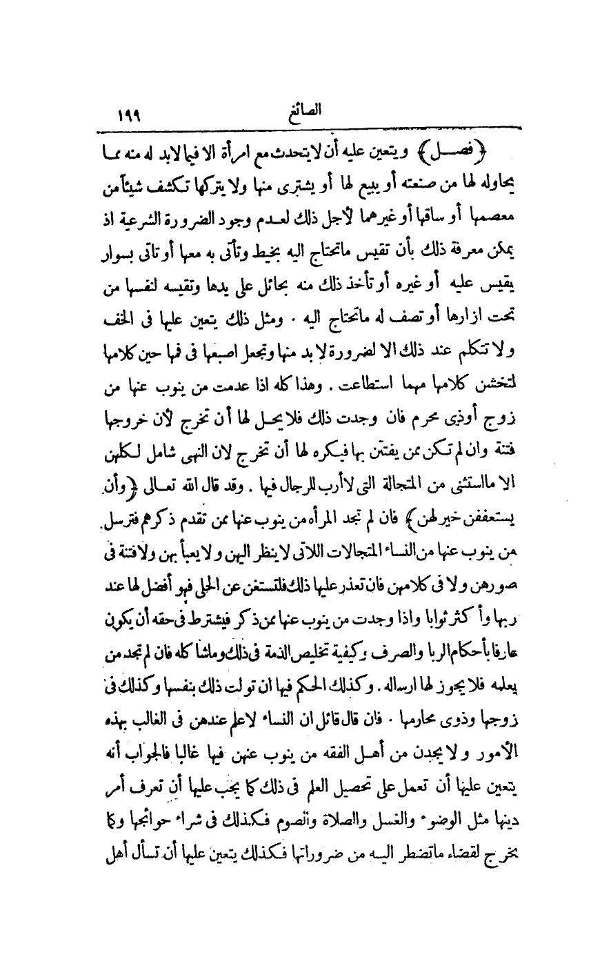 فَإِنْ قَالَ قَائِلٌ: إنَّ النِّسَاءَ لَا عِلْمَ عِنْدَهُنَّ فِي الْغَالِبِ بِهَذِهِ الْأُمُورِ، وَلَا يَجِدْنَ مِنْ أَهْلِ الْفِقْهِ مَنْ يَنُوبُ عَنْهُنَّ فِيهَا غَالِبًا فَالْجَوَابُ أَنَّهُ يَتَعَيَّنُ عَلَيْهَا أَنْ تَعْمَلَ عَلَى تَحْصِيلِ الْعِلْمِ فِي ذَلِكَ كَمَا يَجِبُ عَلَيْهَا أَنْ تَعْرِفَ أَمْرَ دِينِهَا مِثْلَ الْوُضُوءِ وَالْغُسْلِ وَالصَّلَاةِ وَالصَّوْمِ فَكَذَلِكَ فِي شِرَاءِ حَوَائِجِهَا وَكَمَا تَخْرُجُ لِقَضَاءِ مَا تُضْطَرُّ إلَيْهِ مِنْ ضَرُورَاتِهَا فَكَذَلِكَ يَتَعَيَّنُ عَلَيْهَا أَنْ تَسْأَلَ أَهْلَ