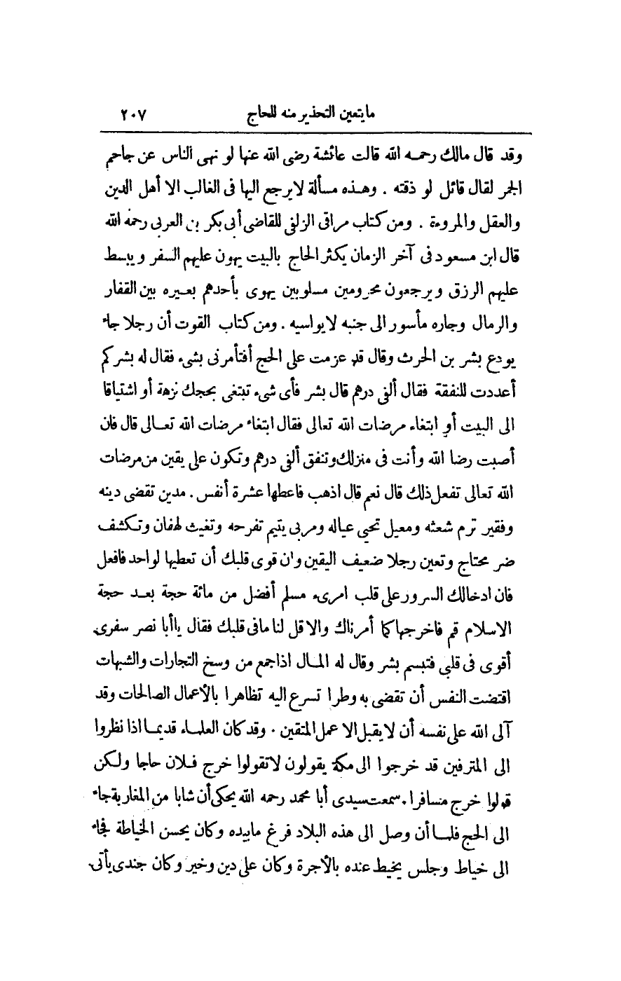 وَقَدْ كَانَ الْعُلَمَاءُ قَدِيمًا إذَا نَظَرُوا إلَى الْمُتْرَفِينَ قَدْ خَرَجُوا إلَى مَكَّةَ يَقُولُونَ لَا تَقُولُوا خَرَجَ فُلَانٌ حَاجًّا وَلَكِنْ قُولُوا خَرَجَ مُسَافِرًا. سَمِعْت سَيِّدِي أَبَا مُحَمَّدٍ - رَحِمَهُ اللَّهُ - يَحْكِي أَنَّ شَابًّا مِنْ الْمَغَارِبَةِ جَاءَ إلَى الْحَجِّ فَلَمَّا أَنْ وَصَلَ إلَى هَذِهِ الْبِلَادِ فَرَغَ مَا بِيَدِهِ وَكَانَ يُحْسِنُ الْخِيَاطَةَ فَجَاءَ إلَى خَيَّاطٍ وَجَلَسَ يَخِيطُ عِنْدَهُ بِالْأُجْرَةِ وَكَانَ عَلَى دِينٍ وَخَيْرٍ وَكَانَ جُنْدِيٌّ يَأْتِي