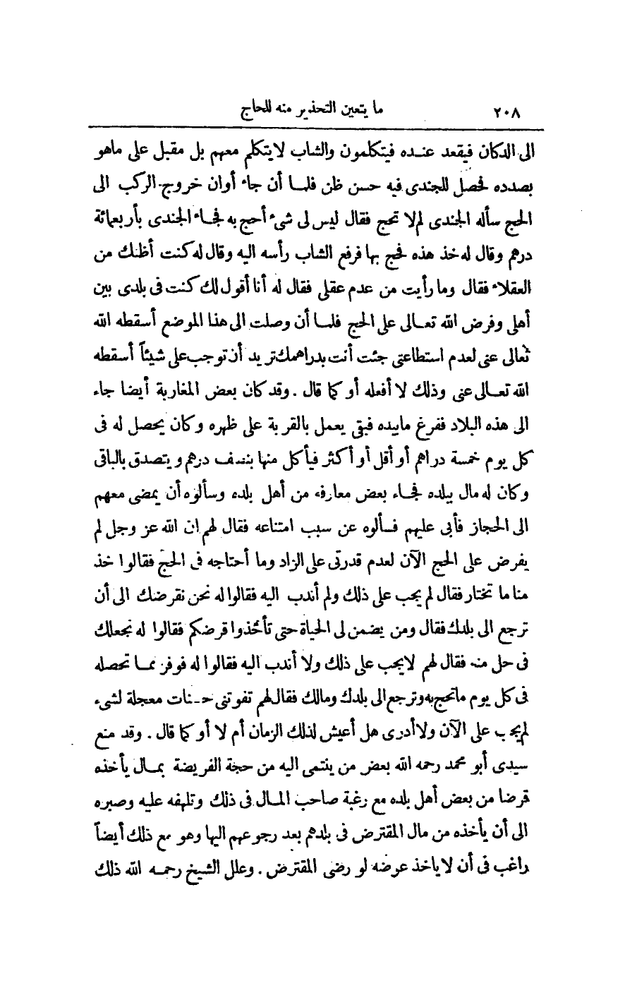 وَقَدْ مَنَعَ سَيِّدِي أَبُو مُحَمَّدٍ - رَحِمَهُ اللَّهُ - بَعْضَ مَنْ يَنْتَمِي إلَيْهِ مِنْ حَجَّةِ الْفَرِيضَةِ بِمَالٍ يَأْخُذُهُ قَرْضًا مِنْ بَعْضِ أَهْلِ بَلَدِهِ مَعَ رَغْبَةِ صَاحِبِ الْمَالِ فِي ذَلِكَ وَتَلَهُّفِهِ عَلَيْهِ وَصَبْرِهِ إلَى أَنْ يَأْخُذَهُ مِنْ مَالِ الْمُقْتَرِضِ فِي بَلَدِهِمْ بَعْدَ رُجُوعِهِمْ إلَيْهَا، وَهُوَ مَعَ ذَلِكَ أَيْضًا رَاغِبٌ فِي أَنْ لَا يَأْخُذَ عَرْضَهُ لَوْ رَضِيَ الْمُقْتَرِضُ. وَعَلَّلَ الشَّيْخُ - رَحِمَهُ اللَّهُ - ذَلِكَ