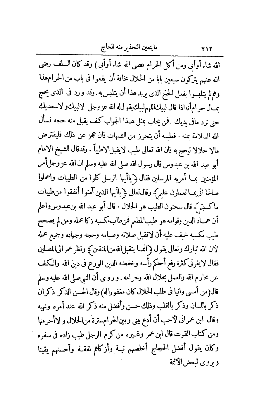 اللَّهَ شَاءَ أَوْ أَبَى وَمَنْ أَكَلَ الْحَرَامَ عَصَى اللَّهَ شَاءَ أَوْ أَبَى» وَقَدْ كَانَ السَّلَفُ - رَضِيَ اللَّهُ عَنْهُمْ - يَتْرُكُونَ سَبْعِينَ بَابًا مِنْ الْحَلَالِ مَخَافَةَ أَنْ يَقَعُوا فِي بَابٍ مِنْ الْحَرَامِ هَذَا وَهُمْ لَمْ يَتَلَبَّسُوا بِفِعْلِ الْحَجِّ الَّذِي يُرِيدُ هَذَا أَنْ يَتَلَبَّسَ بِهِ. وَقَدْ وَرَدَ فِي الَّذِي يَحُجُّ بِمَالٍ حَرَامٍ أَنَّهُ إذَا قَالَ لَبَّيْكَ اللَّهُمَّ لَبَّيْكَ يَقُولُ لَهُ اللَّهُ عَزَّ وَجَلَّ لَا لَبَّيْكَ وَلَا سَعْدَيْكَ حَتَّى تَرُدَّ مَا فِي يَدَيْك. فَمَنْ يُجَابُ بِمِثْلِ هَذَا الْجَوَابِ كَيْفَ يُقْبَلُ مِنْهُ حَجُّهُ نَسْأَلُ اللَّهَ السَّلَامَةَ بِمَنِّهِ. فَعَلَيْهِ أَنْ يَتَحَرَّزَ مِنْ الشُّبُهَاتِ فَإِنْ عَجَزَ عَنْ ذَلِكَ فَلْيَقْتَرِضْ مَالًا حَلَالًا لِيَحُجَّ بِهِ، فَإِنَّ اللَّهَ تَعَالَى طَيِّبٌ لَا يَقْبَلُ إلَّا طَيِّبًا. وَقَدْ قَالَ الشَّيْخُ الْإِمَامُ: أَبُو عَبْدِ اللَّهِ بْنُ عَبْدُوسٍ قَالَ رَسُولُ اللَّهِ - صَلَّى اللَّهُ عَلَيْهِ وَسَلَّمَ - «إنَّ اللَّهَ عَزَّ وَجَلَّ أَمَرَ الْمُؤْمِنِينَ بِمَا أَمَرَ بِهِ الْمُرْسَلِينَ فَقَالَ {يَا أَيُّهَا الرُّسُلُ كُلُوا مِنَ الطَّيِّبَاتِ وَاعْمَلُوا صَالِحًا إِنِّي بِمَا تَعْمَلُونَ عَلِيمٌ} [المؤمنون: 51] وَقَالَ تَعَالَى {يَا أَيُّهَا الَّذِينَ آمَنُوا أَنْفِقُوا مِنْ طَيِّبَاتِ مَا كَسَبْتُمْ} [البقرة: 267] » قَالَ سَحْنُونَ الطَّيِّبُ هُوَ الْحَلَالُ. قَالَ أَبُو عَبْدِ اللَّهِ بْنُ عَبْدُوسٍ: وَاعْلَمْ أَنَّ عِمَادَ الدِّينِ وَقِوَامَهُ هُوَ طَيِّبُ الْمَطْعَمِ فَمَنْ طَابَ مَكْسَبُهُ زَكَا عَمَلُهُ وَمَنْ لَمْ يُصَحِّحْ طَيِّبَ مَكْسَبِهِ خِيفَ عَلَيْهِ أَنْ لَا تُقْبَلَ صَلَاتُهُ وَصِيَامُهُ وَحَجُّهُ وَجِهَادُهُ وَجَمِيعُ عَمَلِهِ؛ لِأَنَّ اللَّهَ تَبَارَكَ وَتَعَالَى يَقُولُ {إِنَّمَا يَتَقَبَّلُ اللَّهُ مِنَ الْمُتَّقِينَ} [المائدة: 27] وَنَظَرَ عُمَرُ إلَى الْمُصَلِّينَ فَقَالَ: لَا يَغُرُّنِي كَثْرَةُ رَفْعِ أَحَدِكُمْ رَأْسِهِ وَخَفْضِهِ الدِّينُ الْوَرَعُ فِي دِينِ اللَّهِ وَالْكَفُّ عَنْ مَحَارِمِ اللَّهِ وَالْعَمَلُ بِحَلَالِ اللَّهِ وَحَرَامِهِ. وَرُوِيَ أَنَّ النَّبِيَّ - صَلَّى اللَّهُ عَلَيْهِ وَسَلَّمَ - قَالَ «مَنْ أَمْسَى وَانِيًا فِي طَلَبِ الْحَلَالِ كَانَ مَغْفُورًا لَهُ» وَقَالَ الْحَسَنُ الذِّكْرُ ذِكْرَانِ ذِكْرٌ بِاللِّسَانِ وَذِكْرٌ بِالْقَلْبِ وَذَلِكَ حَسَنٌ وَأَفْضَلُ مِنْهُ ذِكْرُ اللَّهِ عِنْدَ أَمْرِهِ وَنَهْيِهِ فَقَالَ ابْنُ عُمَرَ إنِّي لَأُحِبُّ أَنْ أَدَعَ بَيْنِي وَبَيْنَ الْحَرَامِ سُتْرَةً مِنْ الْحَلَالِ وَلَا أُحَرِّمُهَا وَمِنْ كِتَابِ الْقُوتِ قَالَ ابْنُ عُمَرَ وَغَيْرُهُ مِنْ كَرَمِ الرَّجُلِ طِيبُ زَادِهِ فِي سَفَرِهِ وَكَانَ يَقُولُ أَفْضَلُ الْحُجَّاجِ أَخْلَصُهُمْ نِيَّةً وَأَزْكَاهُمْ نَفَقَةً وَأَحْسَنُهُمْ يَقِينًا وَيُرْوَى لِبَعْضِ الْأَئِمَّةِ