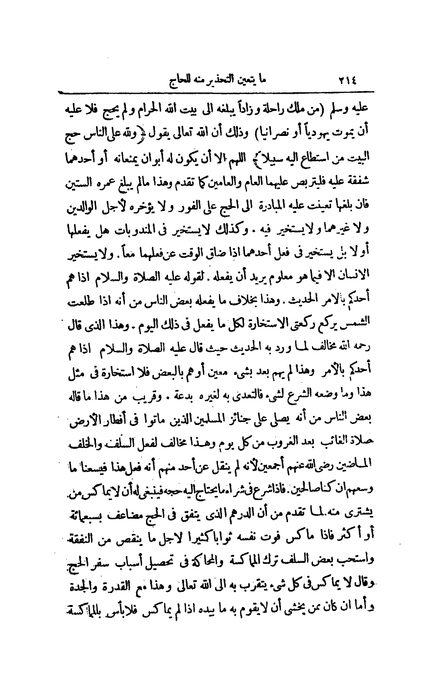 «مَنْ مَلَكَ رَاحِلَةً وَزَادًا يُبَلِّغُهُ إلَى بَيْتِ اللَّهِ الْحَرَامِ وَلَمْ يَحُجَّ فَلَا عَلَيْهِ أَنْ يَمُوتَ يَهُودِيًّا أَوْ نَصْرَانِيًّا» وَذَلِكَ أَنَّ اللَّهَ تَعَالَى يَقُولُ {وَلِلَّهِ عَلَى النَّاسِ حِجُّ الْبَيْتِ مَنِ اسْتَطَاعَ إِلَيْهِ سَبِيلا} [آل عمران: 97] اللَّهُمَّ إلَّا أَنْ يَكُونَ لَهُ أَبَوَانِ يَمْنَعَانِهِ أَوْ أَحَدُهُمَا شَفَقَةً عَلَيْهِ فَلْيَتَرَبَّصْ عَلَيْهِمَا الْعَامَ وَالْعَامَيْنِ كَمَا تَقَدَّمَ، وَهَذَا مَا لَمْ يَبْلُغْ عُمُرُهُ السِّتِّينَ فَإِنْ بَلَغَهَا تَعَيَّنَتْ عَلَيْهِ الْمُبَادَرَةُ إلَى الْحَجِّ عَلَى الْفَوْرِ وَلَا يُؤَخِّرُهُ لِأَجْلِ الْوَالِدَيْنِ وَلَا غَيْرِهِمَا وَلَا يَسْتَخِيرُ فِيهِ. وَكَذَلِكَ لَا يَسْتَخِيرُ فِي الْمَنْدُوبَاتِ هَلْ يَفْعَلُهَا أَوْ لَا، بَلْ يَسْتَخِيرُ فِي فِعْلِ أَحَدِهِمَا إذَا ضَاقَ الْوَقْتُ عَنْ فِعْلِهِمَا مَعًا. وَلَا يَسْتَخِيرُ الْإِنْسَانُ إلَّا فِيمَا هُوَ مَعْلُومٌ يُرِيدُ أَنْ يَفْعَلَهُ. لِقَوْلِهِ - عَلَيْهِ الصَّلَاةُ وَالسَّلَامُ - «إذَا هَمَّ أَحَدُكُمْ بِالْأَمْرِ» الْحَدِيثَ، وَهَذَا بِخِلَافِ مَا يَفْعَلُهُ بَعْضُ النَّاسِ مِنْ أَنَّهُ إذَا طَلَعَتْ الشَّمْسُ يَرْكَعُ رَكْعَتَيْ الِاسْتِخَارَةِ لِكُلِّ مَا يَفْعَلُ فِي ذَلِكَ الْيَوْمِ، وَهَذَا الَّذِي قَالَ - رَحِمَهُ اللَّهُ - مُخَالِفٌ لِمَا وَرَدَ بِهِ الْحَدِيثُ حَيْثُ قَالَ - عَلَيْهِ الصَّلَاةُ وَالسَّلَامُ - «إذَا هَمَّ أَحَدُكُمْ بِالْأَمْرِ» ، وَهَذَا لَمْ يَهُمَّ بَعْدُ بِشَيْءٍ مُعَيَّنٍ أَوْ هَمَّ بِالْبَعْضِ فَلَا اسْتِخَارَةَ فِي مِثْلِ هَذَا وَمَا وَضَعَهُ الشَّرْعُ لِشَيْءٍ فَالتَّعَدِّي بِهِ لِغَيْرِهِ بِدْعَةٌ. وَقَرِيبٌ مِنْ هَذَا مَا قَالَهُ بَعْضُ النَّاسِ مِنْ أَنَّهُ يُصَلِّي عَلَى جَنَائِزِ الْمُسْلِمِينَ الَّذِينَ مَاتُوا فِي أَقْطَارِ الْأَرْضِ صَلَاةَ الْغَائِبِ بَعْدَ الْغُرُوبِ مِنْ كُلِّ يَوْمٍ، وَهَذَا مُخَالِفٌ لِفِعْلِ السَّلَفِ وَالْخَلَفِ الْمَاضِينَ - رَضِيَ اللَّهُ عَنْهُمْ أَجْمَعِينَ -؛ لِأَنَّهُ لَمْ يُنْقَلْ عَنْ أَحَدٍ مِنْهُمْ أَنَّهُ فَعَلَ هَذَا فَيَسَعُنَا مَا وَسِعَهُمْ إنْ كُنَّا صَالِحِينَ.