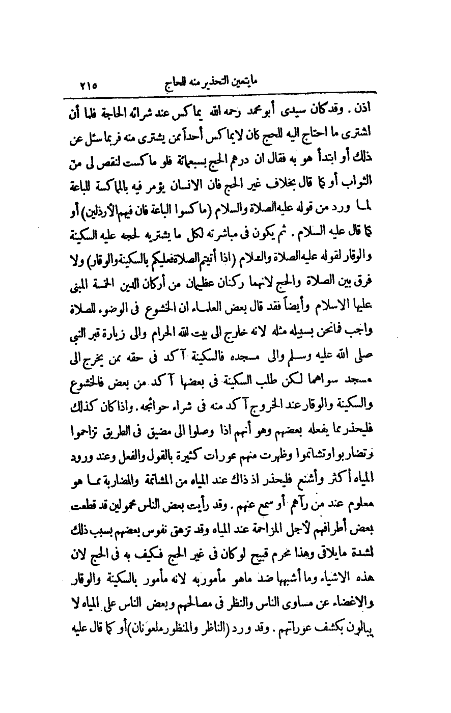 وَقَدْ رَأَيْت بَعْضَ النَّاسِ مَحْمُولِينَ قَدْ قُطِعَتْ بَعْضُ أَطْرَافِهِمْ لِأَجْلِ الْمُزَاحَمَةِ عِنْدَ الْمِيَاهِ وَقَدْ تُزْهَقُ نُفُوسُ بَعْضِهِمْ بِسَبَبِ ذَلِكَ لِشِدَّةِ مَا يُلَاقِي، وَهَذَا مُحَرَّمٌ قَبِيحٌ لَوْ كَانَ فِي غَيْرِ الْحَجِّ فَكَيْفَ بِهِ فِي الْحَجِّ؛ لِأَنَّ هَذِهِ الْأَشْيَاءَ وَمَا أَشْبَهَهَا ضِدُّ مَا هُوَ مَأْمُورٌ بِهِ؛ لِأَنَّهُ مَأْمُورٌ بِالسَّكِينَةِ وَالْوَقَارِ وَالْإِغْضَاءِ عَنْ مَسَاوِئِ النَّاسِ وَالنَّظَرِ فِي مَصَالِحِهِمْ وَبَعْضُ النَّاسِ عَلَى الْمِيَاهِ لَا يُبَالُونَ بِكَشْفِ عَوْرَاتِهِمْ.