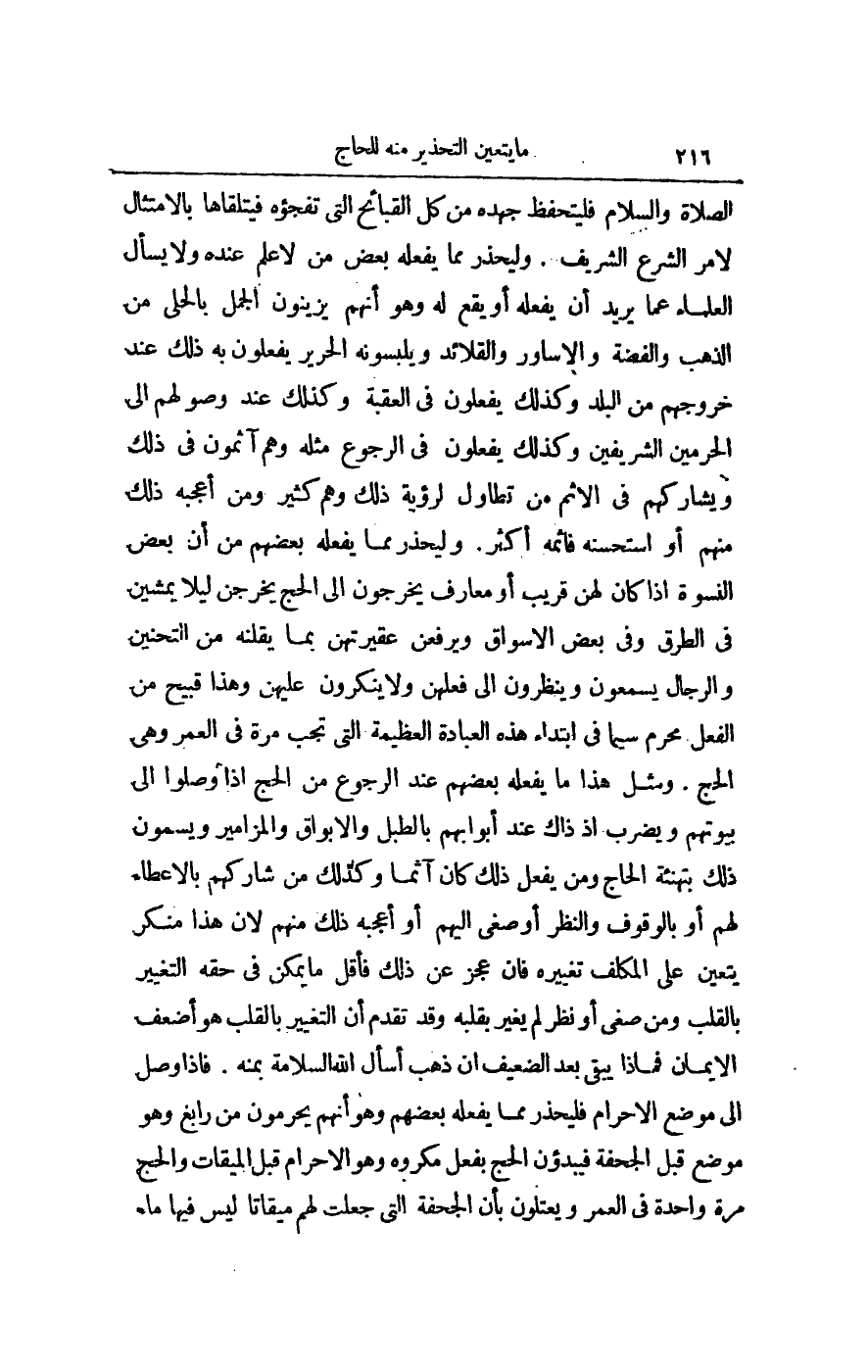- عَلَيْهِ الصَّلَاةُ وَالسَّلَامُ - فَلْيَتَحَفَّظْ جَهْدَهُ مِنْ كُلِّ الْقَبَائِحِ الَّتِي تَفْجَؤُهُ فَيَتَلَقَّاهَا بِالِامْتِثَالِ لِأَمْرِ الشَّرْعِ الشَّرِيفِ. وَلْيَحْذَرْ مِمَّا يَفْعَلُهُ بَعْضُ مَنْ لَا عِلْمَ عِنْدَهُ وَلَا يَسْأَلُ الْعُلَمَاءَ عَمَّا يُرِيدُ أَنْ يَفْعَلَهُ أَوْ يَقَعَ لَهُ، وَهُوَ أَنَّهُمْ يُزَيِّنُونَ الْجَمَلَ بِالْحُلِيِّ مِنْ الذَّهَبِ وَالْفِضَّةِ وَالْأَسَاوِرِ وَالْقَلَائِدِ وَيُلْبِسُونَهُ الْحَرِيرَ يَفْعَلُونَ بِهِ ذَلِكَ عِنْدَ خُرُوجِهِمْ مِنْ الْبَلَدِ وَكَذَلِكَ يَفْعَلُونَ فِي الْعَقَبَةِ وَكَذَلِكَ عِنْدَ وُصُولِهِمْ إلَى الْحَرَمَيْنِ الشَّرِيفَيْنِ وَكَذَلِكَ يَفْعَلُونَ فِي الرُّجُوعِ مِثْلَهُ وَهُمْ آثِمُونَ فِي ذَلِكَ وَيُشَارِكُهُمْ فِي الْإِثْمِ مَنْ تَطَاوَلَ لِرُؤْيَةِ ذَلِكَ وَهُمْ كَثِيرٌ وَمَنْ أَعْجَبَهُ ذَلِكَ مِنْهُمْ أَوْ اسْتَحْسَنَهُ فَإِثْمُهُ أَكْثَرُ.