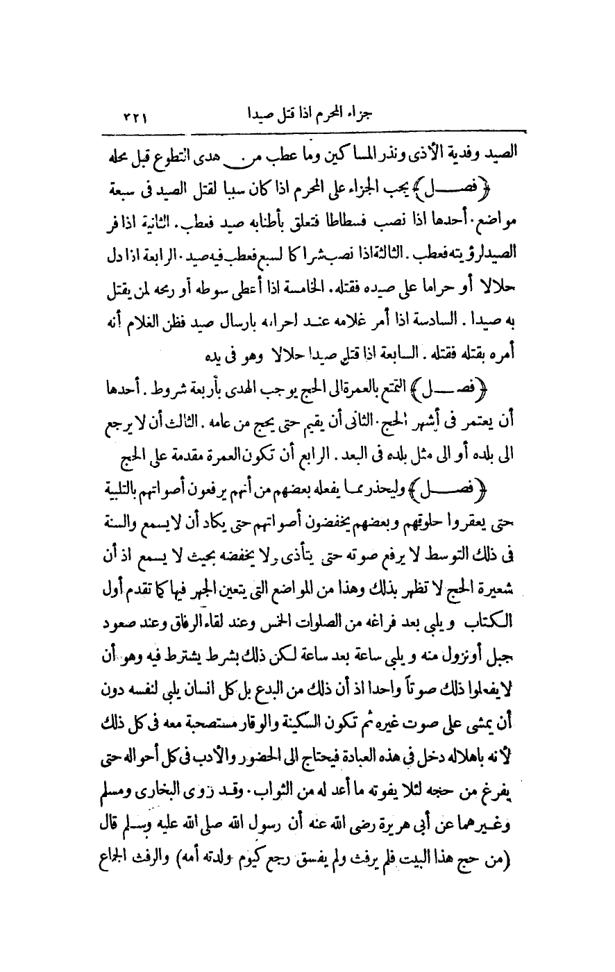 الصَّيْدِ وَفِدْيَةَ الْأَذَى وَنَذْرَ الْمَسَاكِينِ وَمَا عَطِبَ مِنْ هَدْيِ التَّطَوُّعِ قَبْلَ مَحَلِّهِ