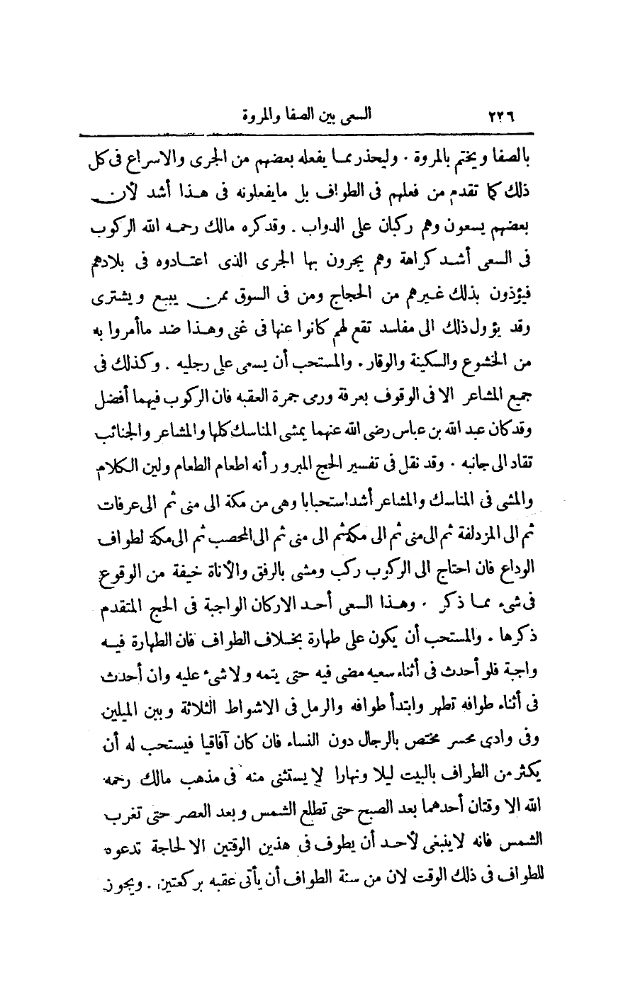 وَالْمُسْتَحَبُّ أَنْ يَكُونَ عَلَى طَهَارَةٍ بِخِلَافِ الطَّوَافِ فَإِنَّ الطَّهَارَةَ فِيهِ وَاجِبَةٌ فَلَوْ أَحْدَثَ فِي أَثْنَاءِ سَعْيِهِ مَضَى فِيهِ حَتَّى يُتِمَّهُ وَلَا شَيْءَ عَلَيْهِ، وَإِنْ أَحْدَثَ فِي أَثْنَاءِ طَوَافِهِ تَطَهَّرَ وَابْتَدَأَ طَوَافَهُ وَالرَّمَلُ فِي الْأَشْوَاطِ الثَّلَاثَةِ وَبَيْنَ الْمِيلَيْنِ وَفِي وَادِي مُحَسِّرٍ مُخْتَصٌّ بِالرِّجَالِ دُونَ النِّسَاءِ فَإِنْ كَانَ آفَاقِيًّا فَيُسْتَحَبُّ لَهُ أَنْ يُكْثِرَ مِنْ الطَّوَافِ بِالْبَيْتِ لَيْلًا وَنَهَارًا لَا يَسْتَثْنِي مِنْهُ فِي مَذْهَبِ مَالِكٍ - رَحِمَهُ اللَّهُ - إلَّا وَقْتَانِ أَحَدُهُمَا بَعْدَ الصُّبْحِ حَتَّى تَطْلُعَ الشَّمْسُ وَبَعْدَ الْعَصْرِ حَتَّى تَغْرُبَ الشَّمْسُ فَإِنَّهُ لَا يَنْبَغِي لِأَحَدٍ أَنْ يَطُوفَ فِي هَذَيْنِ الْوَقْتَيْنِ إلَّا لِحَاجَةٍ تَدْعُوهُ لِلطَّوَافِ فِي ذَلِكَ الْوَقْتِ؛ لِأَنَّ مِنْ سُنَّةِ الطَّوَافِ أَنْ يَأْتِيَ عُقْبَةُ بِرَكْعَتَيْنِ. وَيَجُوزُ