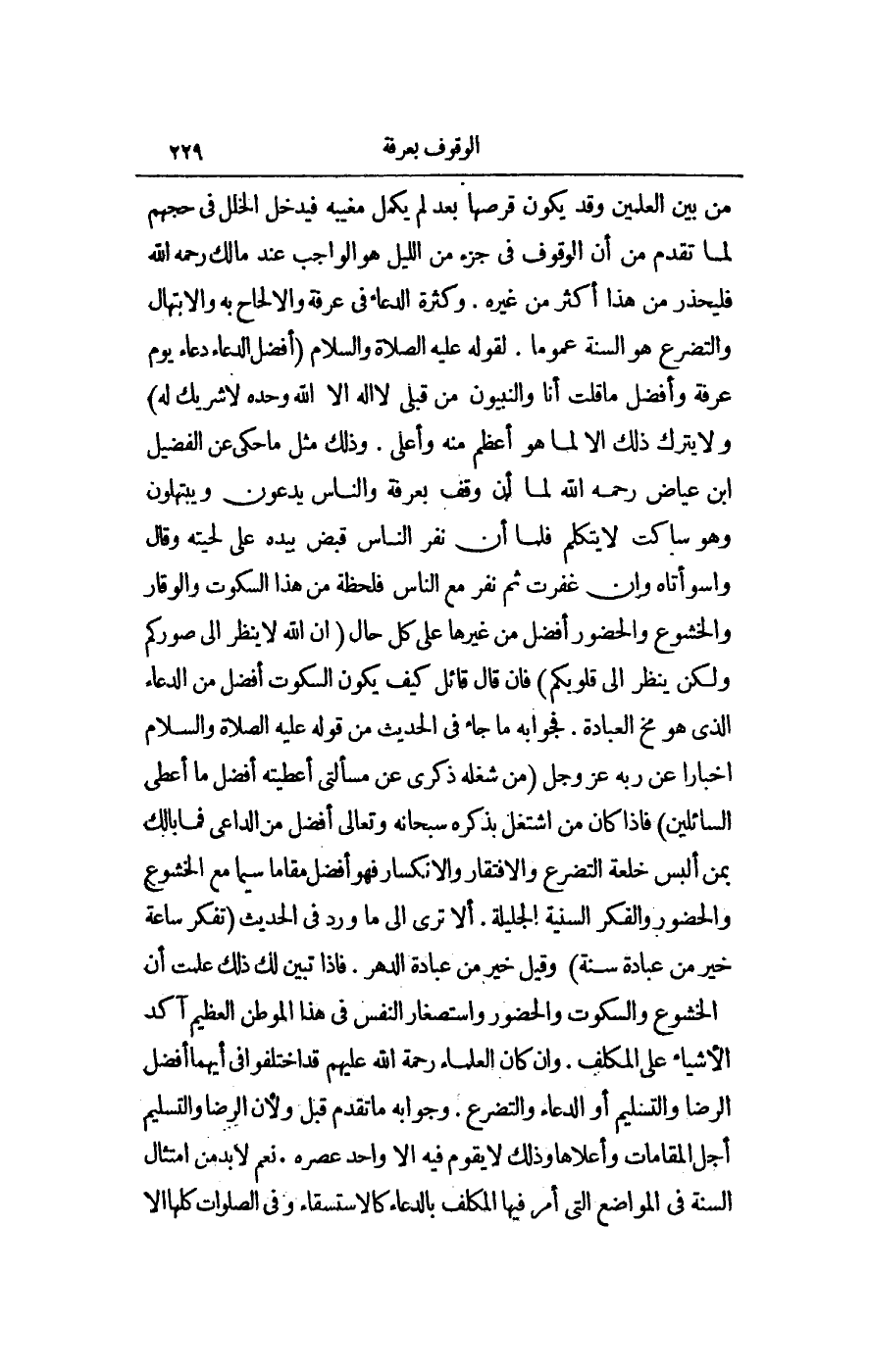 وَكَثْرَةُ الدُّعَاءِ فِي عَرَفَةَ وَالْإِلْحَاحِ بِهِ وَالِابْتِهَالُ وَالتَّضَرُّعُ هُوَ السُّنَّةُ عُمُومًا. لِقَوْلِهِ - عَلَيْهِ الصَّلَاةُ وَالسَّلَامُ - «أَفْضَلُ الدُّعَاءِ دُعَاءُ يَوْمِ عَرَفَةَ وَأَفْضَلُ مَا قُلْت أَنَا وَالنَّبِيُّونَ مِنْ قَبْلِي لَا إلَهَ إلَّا اللَّهُ وَحْدَهُ لَا شَرِيكَ لَهُ» وَلَا يَتْرُكُ ذَلِكَ إلَّا لِمَا هُوَ أَعْظَمُ مِنْهُ وَأَعْلَى. وَذَلِكَ مِثْلُ مَا حُكِيَ عَنْ الْفُضَيْلِ بْنِ عِيَاضٍ - رَحِمَهُ اللَّهُ - لَمَّا أَنْ وَقَفَ بِعَرَفَةَ وَالنَّاسُ يَدْعُونَ وَيَبْتَهِلُونَ، وَهُوَ سَاكِتٌ لَا يَتَكَلَّمُ فَلَمَّا أَنْ نَفَرَ النَّاسُ قَبَضَ بِيَدِهِ عَلَى لِحْيَتِهِ وَقَالَ وَاسَوْأَتَاهُ، وَإِنْ غُفِرَتْ ثُمَّ نَفَرَ مَعَ النَّاسِ فَلَحْظَةٌ مِنْ هَذَا السُّكُوتِ وَالْوَقَارِ وَالْخُشُوعِ وَالْحُضُورِ أَفْضَلُ مِنْ غَيْرِهَا عَلَى كُلِّ حَالٍ «إنَّ اللَّهَ لَا يَنْظُرُ إلَى صُوَرِكُمْ وَلَكِنْ يَنْظُرُ إلَى قُلُوبِكُمْ» فَإِنْ قَالَ قَائِلٌ: كَيْفَ يَكُونُ السُّكُوتُ أَفْضَلَ مِنْ الدُّعَاءِ الَّذِي هُوَ مُخُّ الْعِبَادَةِ؟ فَجَوَابُهُ مَا جَاءَ فِي الْحَدِيثِ مِنْ قَوْلِهِ - عَلَيْهِ الصَّلَاةُ وَالسَّلَامُ - إخْبَارًا عَنْ رَبِّهِ عَزَّ وَجَلَّ «مَنْ شَغَلَهُ ذِكْرِي عَنْ مَسْأَلَتِي أَعْطَيْته أَفْضَلَ مَا أُعْطِي السَّائِلِينَ» فَإِذَا كَانَ مَنْ اشْتَغَلَ بِذِكْرِهِ سُبْحَانَهُ وَتَعَالَى أَفْضَلَ مِنْ الدَّاعِي فَمَا بَالُك بِمَنْ أُلْبِسَ خِلْعَةَ التَّضَرُّعِ وَالِافْتِقَارِ وَالِانْكِسَارِ فَهُوَ أَفْضَلُ مَقَامًا سِيَّمَا مَعَ الْخُشُوعِ وَالْحُضُورِ وَالْفِكَرِ السُّنِّيَّةِ الْجَلِيلَةِ. أَلَا تَرَى إلَى مَا وَرَدَ فِي الْحَدِيثِ «تَفَكُّرُ سَاعَةٍ خَيْرٌ مِنْ عِبَادَةِ سَنَةٍ» وَقِيلَ خَيْرٌ مِنْ عِبَادَةِ الدَّهْرِ. فَإِذَا تَبَيَّنَ لَك ذَلِكَ عَلِمْت أَنَّ الْخُشُوعَ وَالسُّكُوتَ وَالْحُضُورَ وَاسْتِصْغَارَ النَّفْسِ فِي هَذَا الْمَوْطِنِ الْعَظِيمِ آكَدُ الْأَشْيَاءِ عَلَى الْمُكَلَّفِ، وَإِنْ كَانَ الْعُلَمَاءُ رَحْمَةُ اللَّهِ عَلَيْهِمْ قَدْ اخْتَلَفُوا فِي أَيِّهِمَا أَفْضَلُ الرِّضَا وَالتَّسْلِيمُ أَوْ الدُّعَاءُ وَالتَّضَرُّعُ. وَجَوَابُهُ مَا تَقَدَّمَ قَبْلُ؛ وَلِأَنَّ الرِّضَا وَالتَّسْلِيمَ أَجَلُّ الْمَقَامَاتِ وَأَعْلَاهَا وَذَلِكَ لَا يَقُومُ فِيهِ إلَّا وَاحِدُ عَصْرِهِ. نَعَمْ لَا بُدَّ مِنْ امْتِثَالِ السُّنَّةِ فِي الْمَوَاضِعِ الَّتِي أُمِرَ فِيهَا الْمُكَلَّفُ بِالدُّعَاءِ كَالِاسْتِسْقَاءِ وَفِي الصَّلَوَاتِ كُلِّهَا إلَّا