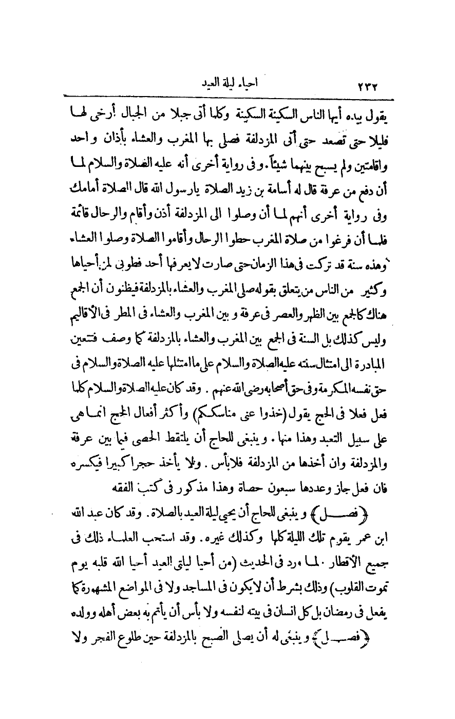 {فَصْلٌ} وَيَنْبَغِي لِلْحَاجِّ أَنْ يُحْيِيَ لَيْلَةَ الْعِيدِ بِالصَّلَاةِ. وَقَدْ كَانَ عَبْدُ اللَّهِ بْنُ عُمَرَ يَقُومُ تِلْكَ اللَّيْلَةَ كُلَّهَا وَكَذَلِكَ غَيْرُهُ. وَقَدْ اسْتَحَبَّ الْعُلَمَاءُ ذَلِكَ فِي جَمِيعِ الْأَقْطَارِ. لِمَا وَرَدَ فِي الْحَدِيثِ «مَنْ أَحْيَا لَيْلَتَيْ الْعِيدِ أَحْيَا اللَّهُ قَلْبَهُ يَوْمَ تَمُوتُ الْقُلُوبُ» وَذَلِكَ بِشَرْطِ أَنْ لَا يَكُونَ فِي الْمَسَاجِدِ وَلَا فِي الْمَوَاضِعِ الْمَشْهُورَةِ كَمَا يَفْعَلُ فِي رَمَضَانَ، بَلْ كُلُّ إنْسَانٍ فِي بَيْتِهِ لِنَفْسِهِ وَلَا بَأْسَ أَنْ يَأْتَمَّ بِهِ بَعْضُ أَهْلِهِ وَوَلَدِهِ