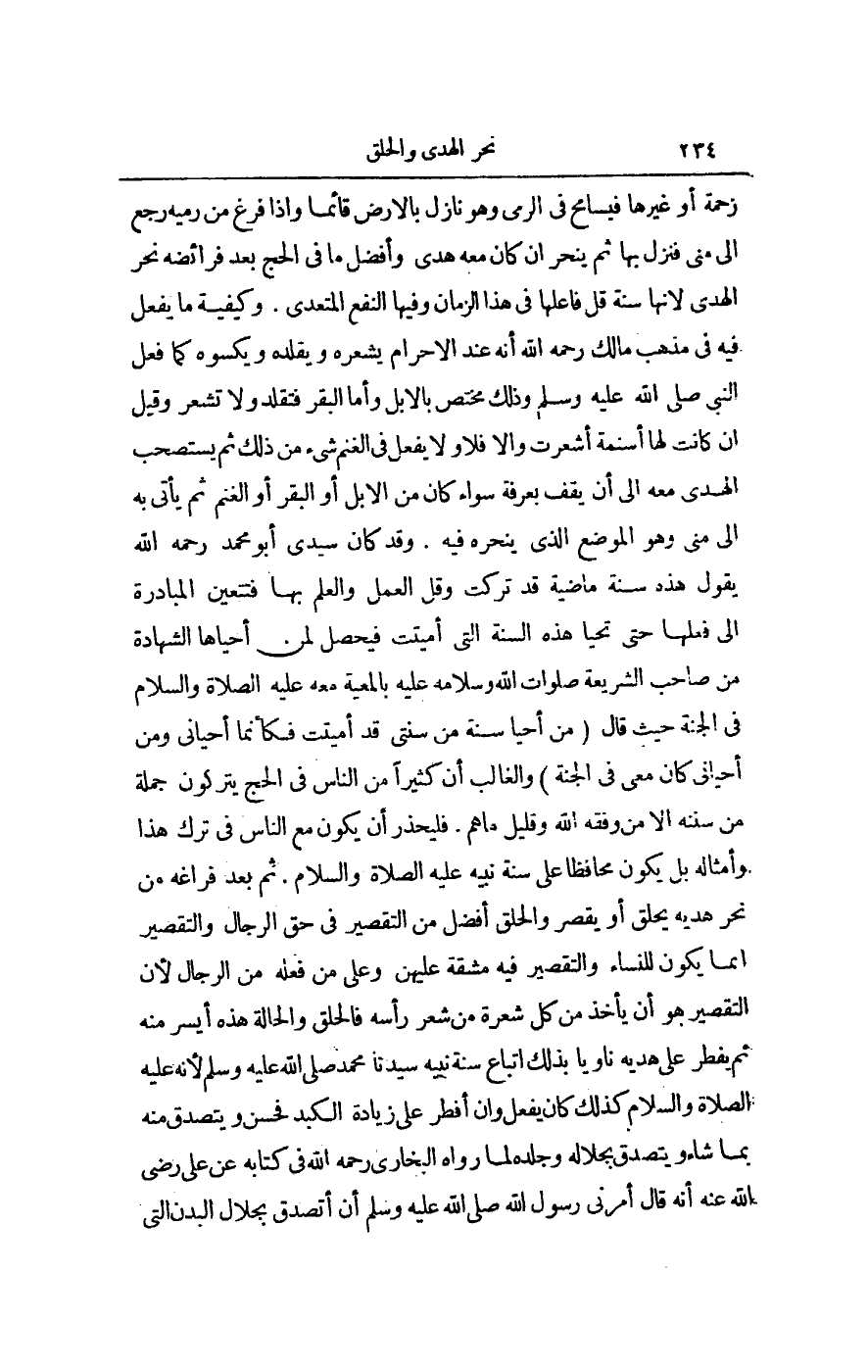 زَحْمَةً أَوْ غَيْرَهَا فَيُسَامَحُ فِي الرَّمْيِ، وَهُوَ نَازِلٌ بِالْأَرْضِ قَائِمًا، وَإِذَا فَرَغَ مِنْ رَمْيِهِ رَجَعَ إلَى مِنًى فَنَزَلَ بِهَا ثُمَّ يَنْحَرُ إنْ كَانَ مَعَهُ هَدْيٌ وَأَفْضَلُ مَا فِي الْحَجِّ بَعْدَ فَرَائِضِهِ نَحْرُ الْهَدْيِ؛ لِأَنَّهَا سُنَّةٌ قَلَّ فَاعِلُهَا فِي هَذَا الزَّمَانِ وَفِيهَا النَّفْعُ الْمُتَعَدِّي. وَكَيْفِيَّةُ مَا يُفْعَلُ فِيهِ فِي مَذْهَبِ مَالِكٍ - رَحِمَهُ اللَّهُ - أَنَّهُ عِنْدَ الْإِحْرَامِ يُشْعِرُهُ وَيُقَلِّدُهُ وَيَكْسُوهُ كَمَا فَعَلَ النَّبِيُّ - صَلَّى اللَّهُ عَلَيْهِ وَسَلَّمَ - وَذَلِكَ مُخْتَصٌّ بِالْإِبِلِ، وَأَمَّا الْبَقَرُ فَتُقَلَّدُ وَلَا تُشْعَرُ وَقِيلَ إنْ كَانَتْ لَهَا أَسْنِمَةٌ أُشْعِرَتْ وَإِلَّا فَلَا وَلَا يُفْعَلُ فِي الْغَنَمِ شَيْءٌ مِنْ ذَلِكَ ثُمَّ يَسْتَصْحِبُ الْهَدْيَ مَعَهُ إلَى أَنْ يَقِفَ بِعَرَفَةَ سَوَاءٌ كَانَ مِنْ الْإِبِلِ أَوْ الْبَقَرِ أَوْ الْغَنَمِ ثُمَّ يَأْتِي بِهِ إلَى مِنًى، وَهُوَ الْمَوْضِعُ الَّذِي يَنْحَرُهُ فِيهِ. وَقَدْ كَانَ سَيِّدِي أَبُو مُحَمَّدٍ - رَحِمَهُ اللَّهُ - يَقُولُ هَذِهِ سُنَّةٌ مَاضِيَةٌ قَدْ تُرِكَتْ وَقَلَّ الْعَمَلُ وَالْعِلْمُ بِهَا فَتَتَعَيَّنُ الْمُبَادَرَةُ إلَى فِعْلِهَا حَتَّى تَحْيَا هَذِهِ السُّنَّةُ الَّتِي أُمِيتَتْ فَيَحْصُلُ لِمَنْ أَحْيَاهَا الشَّهَادَةُ مِنْ صَاحِبِ الشَّرِيعَةِ - صَلَوَاتُ اللَّهِ وَسَلَامُهُ عَلَيْهِ - بِالْمَعِيَّةِ مَعَهُ - عَلَيْهِ الصَّلَاةُ وَالسَّلَامُ - فِي الْجَنَّةِ حَيْثُ قَالَ «مَنْ أَحْيَا سُنَّةً مِنْ سُنَّتِي قَدْ أُمِيتَتْ فَكَأَنَّمَا أَحْيَانِي وَمَنْ أَحْيَانِي كَانَ مَعِي فِي الْجَنَّةِ» وَالْغَالِبُ أَنَّ كَثِيرًا مِنْ النَّاسِ فِي الْحَجِّ يَتْرُكُونَ جُمْلَةً مِنْ سُنَنِهِ إلَّا مَنْ وَفَّقَهُ اللَّهُ وَقَلِيلٌ مَا هُمْ. فَلْيَحْذَرْ أَنْ يَكُونَ مَعَ النَّاسِ فِي تَرْكِ هَذَا وَأَمْثَالِهِ، بَلْ يَكُونُ مُحَافِظًا عَلَى سُنَّةِ نَبِيِّهِ - عَلَيْهِ الصَّلَاةُ وَالسَّلَامُ -.