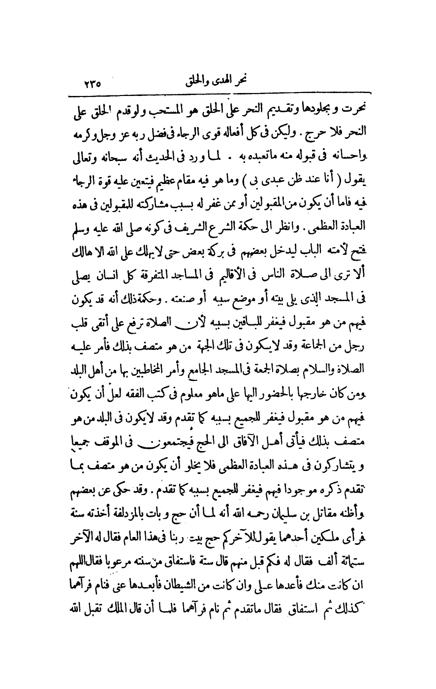 نَحَرْتُ وَبِجُلُودِهَا» وَتَقْدِيمُ النَّحْرِ عَلَى الْحَلْقِ هُوَ الْمُسْتَحَبُّ وَلَوْ قُدِّمَ الْحَلْقُ عَلَى النَّحْرِ فَلَا حَرَجَ. وَلْيَكُنْ فِي كُلِّ أَفْعَالِهِ قَوِيَّ الرَّجَاءِ فِي فَضْلِ رَبِّهِ عَزَّ وَجَلَّ وَكَرْمِهِ وَإِحْسَانِهِ فِي قَبُولِهِ مِنْهُ مَا تَعَبَّدَهُ بِهِ. لِمَا وَرَدَ فِي الْحَدِيثِ أَنَّهُ سُبْحَانَهُ وَتَعَالَى يَقُولُ «أَنَا عِنْدَ ظَنِّ عَبْدِي بِي» وَمَا هُوَ فِيهِ مَقَامٌ عَظِيمٌ فَيَتَعَيَّنُ عَلَيْهِ قُوَّةُ الرَّجَاءِ فِيهِ فَإِمَّا أَنْ يَكُونَ مِنْ الْمَقْبُولِينَ أَوْ مِمَّنْ غُفِرَ لَهُ بِسَبَبِ مُشَارَكَتِهِ لِلْمَقْبُولِينَ فِي هَذِهِ الْعِبَادَةِ الْعُظْمَى. وَانْظُرْ إلَى حِكْمَةِ الشَّرْعِ الشَّرِيفِ فِي كَوْنِهِ - صَلَّى اللَّهُ عَلَيْهِ وَسَلَّمَ - فَتَحَ لِأُمَّتِهِ الْبَابَ لِيَدْخُلَ بَعْضُهُمْ فِي بَرَكَةِ بَعْضٍ حَتَّى لَا يَهْلَكَ عَلَى اللَّهِ إلَّا هَالِكٌ أَلَا تَرَى إلَى صَلَاةِ النَّاسِ فِي الْأَقَالِيمِ فِي الْمَسَاجِدِ الْمُتَفَرِّقَةِ كُلُّ إنْسَانٍ يُصَلِّي فِي الْمَسْجِدِ الَّذِي يَلِي بَيْتَهُ أَوْ مَوْضِعَ سَبَبِهِ أَوْ صَنْعَتِهِ. وَحِكْمَةُ ذَلِكَ أَنَّهُ قَدْ يَكُونُ فِيهِمْ مَنْ هُوَ مَقْبُولٌ فَيُغْفَرُ لِلْبَاقِينَ بِسَبَبِهِ؛ لِأَنَّ الصَّلَاةَ تُرْفَعُ عَلَى أَتْقَى قَلْبِ رَجُلٍ مِنْ الْجَمَاعَةِ وَقَدْ لَا يَكُونُ فِي تِلْكَ الْجِهَةِ مَنْ هُوَ مُتَّصِفٌ بِذَلِكَ فَأَمَرَ - عَلَيْهِ الصَّلَاةُ وَالسَّلَامُ - بِصَلَاةِ الْجُمُعَةِ فِي الْمَسْجِدِ الْجَامِعِ وَأَمَرَ الْمُخَاطَبِينَ بِهَا مِنْ أَهْلِ الْبَلَدِ وَمَنْ كَانَ خَارِجَهَا بِالْحُضُورِ إلَيْهَا عَلَى مَا هُوَ مَعْلُومٌ فِي كُتُبِ الْفِقْهِ لَعَلَّ أَنْ يَكُونَ فِيهِمْ مَنْ هُوَ مَقْبُولٌ فَيُغْفَرُ لِلْجَمِيعِ بِسَبَبِهِ كَمَا تَقَدَّمَ وَقَدْ لَا يَكُونُ فِي الْبَلَدِ مَنْ هُوَ مُتَّصِفٌ بِذَلِكَ فَيَأْتِي أَهْلُ الْآفَاقِ إلَى الْحَجِّ فَيَجْتَمِعُونَ فِي الْمَوْقِفِ جَمِيعًا وَيَتَشَارَكُونَ فِي هَذِهِ الْعِبَادَةِ الْعُظْمَى فَلَا يَخْلُو أَنْ يَكُونَ مَنْ هُوَ مُتَّصِفٌ بِمَا تَقَدَّمَ ذِكْرُهُ مَوْجُودًا فِيهِمْ فَيُغْفَرُ لِلْجَمِيعِ بِسَبَبِهِ كَمَا تَقَدَّمَ. وَقَدْ حُكِيَ عَنْ بَعْضِهِمْ وَأَظُنُّهُ مُقَاتِلَ بْنَ سُلَيْمَانَ - رَحِمَهُ اللَّهُ - أَنَّهُ لَمَّا أَنْ حَجَّ وَبَاتَ بِالْمُزْدَلِفَةِ أَخَذَتْهُ سِنَةٌ فَرَأَى مَلَكَيْنِ أَحَدُهُمَا يَقُولُ لِلْآخَرِ كَمْ حَجَّ بَيْتَ رَبِّنَا فِي هَذَا الْعَامِ فَقَالَ لَهُ الْآخَرُ سِتُّمِائَةِ أَلْفٍ فَقَالَ لَهُ فَكَمْ قُبِلَ مِنْهُمْ قَالَ سِتَّةٌ فَاسْتَفَاقَ مِنْ سِنَتِهِ مَرْعُوبًا فَقَالَ اللَّهُمَّ إنْ كَانَتْ مِنْك فَأَعِدْهَا عَلَيَّ، وَإِنْ كَانَتْ مِنْ الشَّيْطَانِ فَأَبْعِدْهَا عَنِّي فَنَامَ فَرَآهُمَا كَذَلِكَ ثُمَّ اسْتَفَاقَ فَقَالَ مَا تَقَدَّمَ ثُمَّ نَامَ فَرَآهُمَا فَلَمَّا أَنْ قَالَ الْمَلَكُ تَقَبَّلَ اللَّهُ