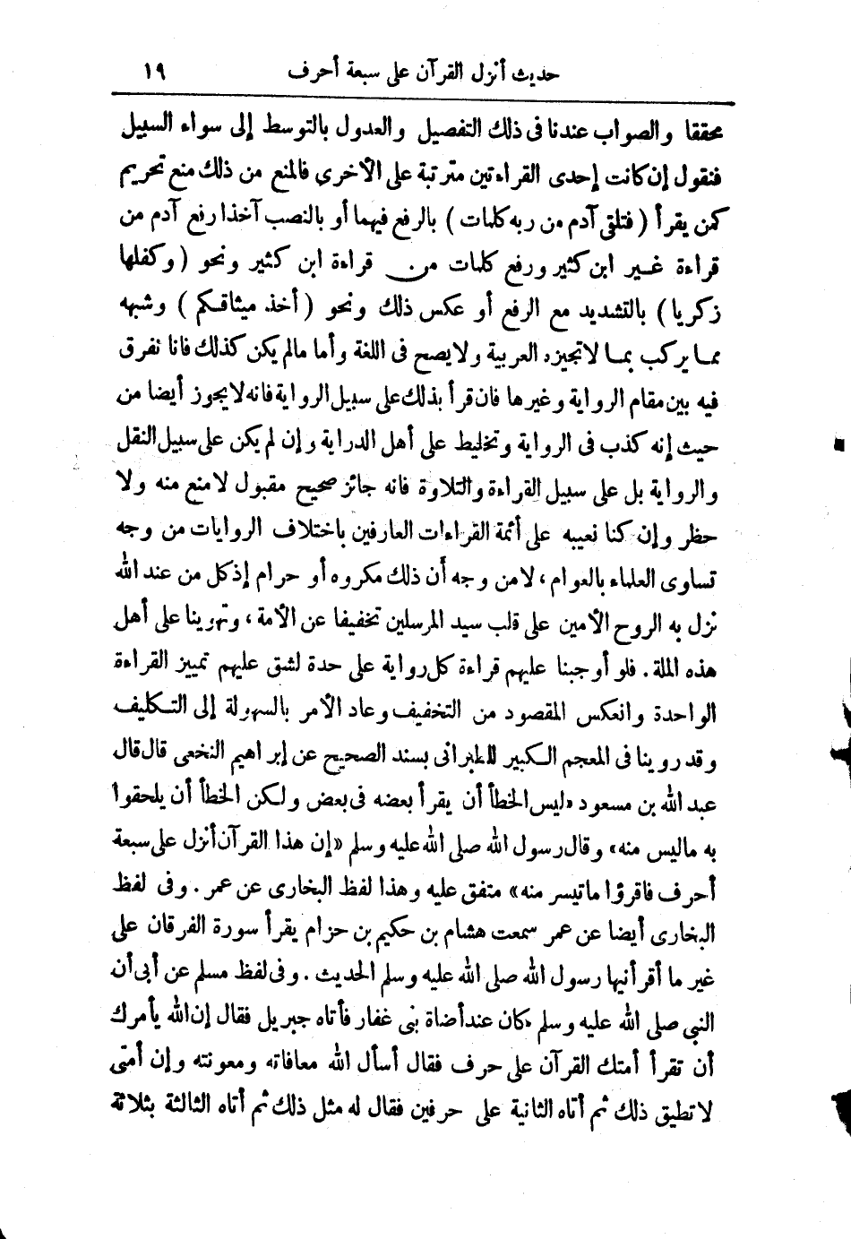 وَقَالَ رَسُولُ اللَّهِ - صَلَّى اللَّهُ عَلَيْهِ وَسَلَّمَ -: إِنَّ هَذَا الْقُرْآنَ أُنْزِلَ عَلَى سَبْعَةِ أَحْرُفٍ، فَاقْرَءُوا مَا تَيَسَّرَ مِنْهُ، مُتَّفَقٌ عَلَيْهِ وَهَذَا لَفْظُ الْبُخَارِّيِّ عَنْ عُمَرَ، وَفِي لَفْظِ الْبُخَارِيِّ أَيْضًا عَنْ عُمَرَ: سَمِعْتُ هِشَامَ بْنَ حَكِيمِ بْنِ حِزَامٍ يَقْرَأُ سُورَةَ الْفُرْقَانِ عَلَى غَيْرِ مَا أَقْرَأَنِيهَا رَسُولُ اللَّهِ - صَلَّى اللَّهُ عَلَيْهِ وَسَلَّمَ - الْحَدِيثَ.