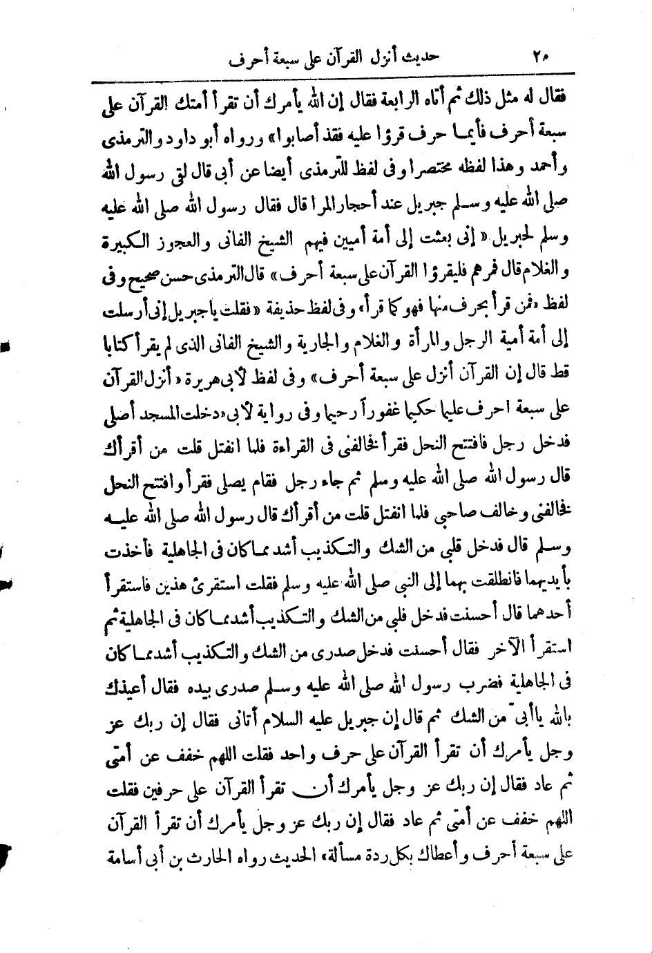 فَقَالَ لَهُ مِثْلَ ذَلِكَ، ثُمَّ أَتَاهُ الرَّابِعَةَ فَقَالَ: إِنَّ اللَّهَ يَأْمُرُكَ أَنْ تَقْرَأَ أُمَّتُكَ الْقُرْآنَ عَلَى سَبْعَةِ أَحْرُفٍ، فَأَيُّمَا حَرْفٍ قَرَءُوا عَلَيْهِ فَقَدْ أَصَابُوا وَرَوَاهُ أَبُو دَاوُدَ وَالتِّرْمِذِيُّ وَأَحْمَدُ وَهَذَا لَفْظُهُ مُخْتَصَرًا، وَفِي لَفْظٍ لِلتِّرْمِذِيِّ أَيْضًا عَنْ أُبَيٍّ قَالَ: لَقِيَ رَسُولُ اللَّهِ - صَلَّى اللَّهُ عَلَيْهِ وَسَلَّمَ - جِبْرِيلَ عِنْدَ أَحْجَارِ الْمِرَا قَالَ: فَقَالَ رَسُولُ اللَّهِ - صَلَّى اللَّهُ عَلَيْهِ وَسَلَّمَ - لِجِبْرِيلَ إِنِّي بُعِثْتُ إِلَى أُمَّةِ أُمِّيِّينَ فِيهِمُ الشَّيْخُ الْفَانِي وَالْعَجُوزُ الْكَبِيرَةُ وَالْغُلَامُ، قَالَ: فَمُرْهُمْ فَلْيَقْرَءُوا الْقُرْآنَ عَلَى سَبْعَةِ أَحْرُفٍ قَالَ التِّرْمِذِيُّ: حَسَنٌ صَحِيحٌ. وَفِي لَفْظٍ: فَمَنْ قَرَأَ بِحَرْفٍ مِنْهَا فَهُوَ كَمَا قَرَأَ، وَفِي لَفْظِ حُذَيْفَةَ: فَقُلْتُ: يَا جِبْرِيلُ، إِنِّي أُرْسِلْتُ إِلَى أُمَّةٍ أُمِّيَّةٍ الرَّجُلِ وَالْمَرْأَةِ وَالْغُلَامِ وَالْجَارِيَةِ وَالشَّيْخِ الْفَانِي الَّذِي لَمْ يَقْرَأْ كِتَابًا قَطُّ، قَالَ: إِنَّ الْقُرْآنَ أُنْزِلَ عَلَى سَبْعَةِ أَحْرُفٍ. وَفِي لَفْظٍ لِأَبِي هُرَيْرَةَ: أُنْزِلَ الْقُرْآنُ عَلَى سَبْعَةِ أَحْرُفٍ عَلِيمًا حَكِيمًا غَفُورًا رَحِيمًا، وَفِي رِوَايَةٍ لِأُبَيٍّ: " دَخَلْتُ الْمَسْجِدَ أُصَلِّي فَدَخَلَ رَجُلٌ فَافْتَتَحَ النَّحْلَ فَخَالَفَنِي فِي الْقِرَاءَةِ، فَلَمَّا انْفَتَلَ قُلْتُ: مَنْ أَقْرَأَكَ؟ قَالَ: رَسُولُ اللَّهِ - صَلَّى اللَّهُ عَلَيْهِ وَسَلَّمَ -، ثُمَّ جَاءَ رَجُلٌ يُصَلِّي فَقَرَأَ وَافْتَتَحَ النَّحْلَ فَخَالَفَنِي وَخَالَفَ صَاحِبِي، فَلَمَّا انْفَتَلَ قُلْتُ: مَنْ أَقْرَأَكَ؟ قَالَ رَسُولُ اللَّهِ - صَلَّى اللَّهُ عَلَيْهِ وَسَلَّمَ -، قَالَ: فَدَخَلَ قَلْبِي مِنَ الشَّكِّ وَالتَّكْذِيبِ أَشَدَّ مِمَّا كَانَ فِي الْجَاهِلِيَّةِ، فَأَخَذْتُ بِأَيْدِيهِمَا إِلَى النَّبِيِّ - صَلَّى اللَّهُ عَلَيْهِ وَسَلَّمَ - فَقُلْتُ: اسْتَقْرِئْ هَذَيْنِ فَاسْتَقْرَأَ أَحَدَهُمَا، قَالَ: أَحْسَنْتَ. فَدَخَلَ قَلْبِي مِنَ الشَّكِّ وَالتَّكْذِيبِ أَشَدَّ مِمَّا كَانَ فِي الْجَاهِلِيَّةِ، ثُمَّ اسْتَقْرَأَ الْآخَرَ فَقَالَ: أَحْسَنْتَ. فَدَخَلَ صَدْرِي مِنَ الشَّكِّ وَالتَّكْذِيبِ أَشَدَّ مِمَّا كَانَ فِي الْجَاهِلِيَّةِ، فَضَرَبَ رَسُولُ اللَّهِ - صَلَّى اللَّهُ عَلَيْهِ وَسَلَّمَ - صَدْرِي فَقَالَ: أُعِيذُكَ بِاللَّهِ يَا أُبَيُّ مِنَ الشَّكِّ، ثُمَّ قَالَ: جِبْرِيلُ - عَلَيْهِ السَّلَامُ - أَتَانِي فَقَالَ: إِنَّ رَبَّكَ - عَزَّ وَجَلَّ - يَأْمُرُكَ أَنْ تَقْرَأَ الْقُرْآنَ عَلَى حَرْفٍ وَاحِدٍ، فَقُلْتُ: اللَّهُمَّ خَفِّفْ عَنْ أُمَّتِي فَقَالَ: إِنَّ رَبَّكَ - عَزَّ وَجَلَّ - يَأْمُرُكَ أَنْ تَقْرَأَ الْقُرْآنَ عَلَى حَرْفَيْنِ، فَقُلْتُ: اللَّهُمَّ خَفِّفْ عَنْ أُمَّتِي، ثُمَّ عَادَ فَقَالَ: إِنَّ رَبَّكَ - عَزَّ وَجَلَّ - يَأْمُرُكَ أَنْ تَقْرَأَ الْقُرْآنَ عَلَى سَبْعَةِ أَحْرُفٍ وَأَعْطَاكَ بِكُلِّ رَدَّةٍ مَسْأَلَةً " الْحَدِيثَ رَوَاهُ الْحَارِثُ بْنُ أَبِي أُسَامَةَ