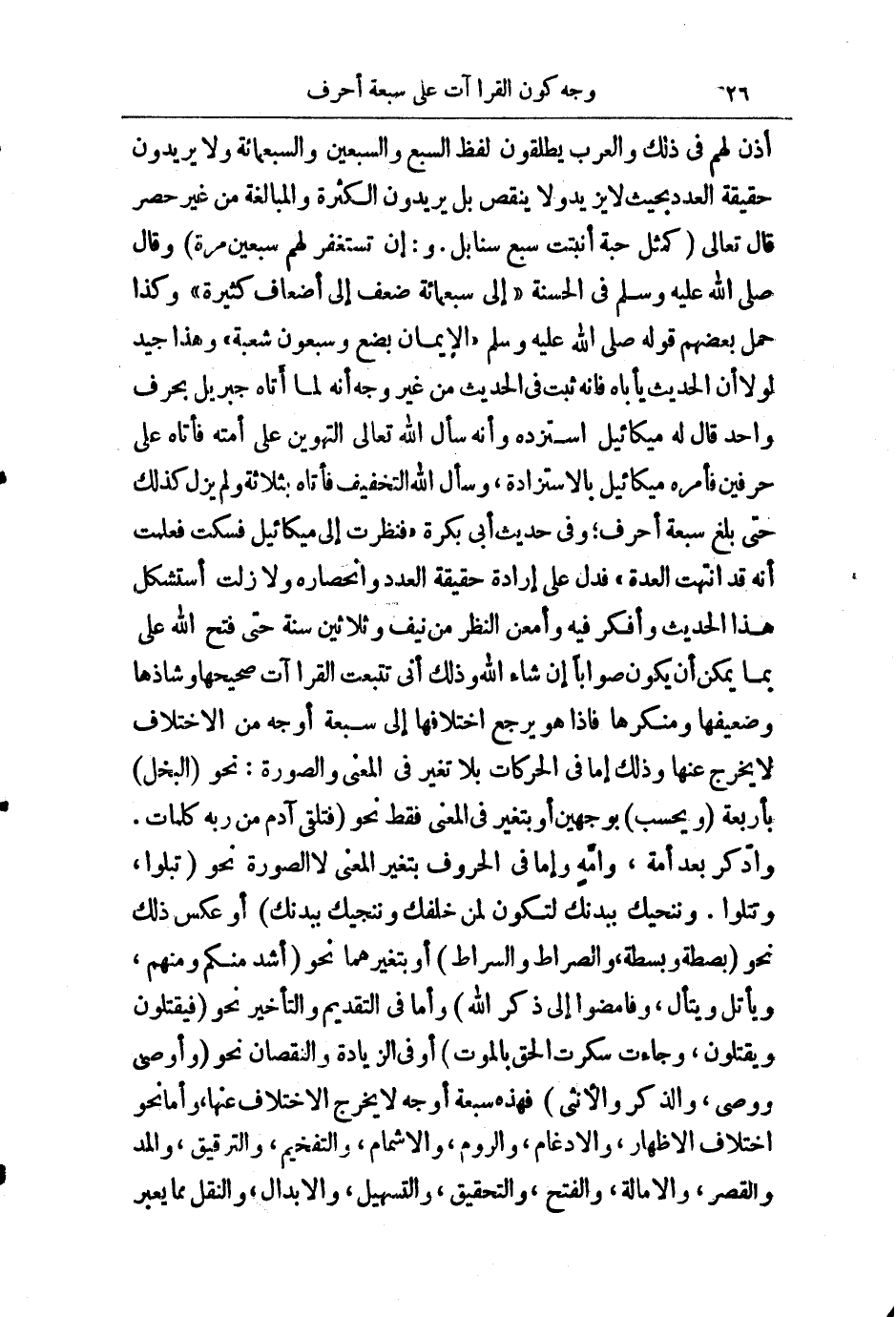 أَذِنَ لَهُمْ فِي ذَلِكَ وَالْعَرَبُ يُطْلِقُونَ لَفْظَ السَّبْعِ وَالسَّبْعِينَ وَالسَّبْعِمِائَةَ وَلَا يُرِيدُونَ حَقِيقَةَ الْعَدَدِ بِحَيْثُ لَا يَزِيدُ وَلَا يَنْقُصُ، بَلْ يُرِيدُونَ الْكَثْرَةَ وَالْمُبَالَغَةَ مِنْ غَيْرِ حَصْرٍ، قَالَ - تَعَالَى -: كَمَثَلِ حَبَّةٍ أَنْبَتَتْ سَبْعَ سَنَابِلَ، وَإِنْ تَسْتَغْفِرْ لَهُمْ سَبْعِينَ مَرَّةً، وَقَالَ - صَلَّى اللَّهُ عَلَيْهِ وَسَلَّمَ - فِي الْحَسَنَةِ: إِلَى سَبْعِمِائَةِ ضِعْفٍ إِلَى أَضْعَافٍ كَثِيرَةٍ، وَكَذَا حَمَلَ بَعْضُهُمْ قَوْلَهُ - صَلَّى اللَّهُ عَلَيْهِ وَسَلَّمَ -: الْإِيمَانُ بِضْعٌ وَسَبْعُونَ شُعْبَةً، وَهَذَا جَيِّدٌ لَوْلَا أَنَّ الْحَدِيثَ يَأْبَاهُ، فَإِنَّهُ ثَبَتَ فِي الْحَدِيثِ مِنْ غَيْرِ وَجْهٍ أَنَّهُ لَمَّا أَتَاهُ جِبْرِيلُ بِحَرْفٍ وَاحِدٍ قَالَ لَهُ مِيكَائِيلُ: اسْتَزِدْهُ. وَإِنَّهُ سَأَلَ اللَّهَ تَعَالَى التَّهْوِينَ عَلَى أُمَّتِهِ فَأَتَاهُ عَلَى حَرْفَيْنِ فَأَمَرَهُ مِيكَائِيلُ بِالِاسْتِزَادَةِ، وَسَأَلَ اللَّهَ التَّخْفِيفَ فَأَتَاهُ بِثَلَاثَةٍ وَلَمْ يَزَلْ كَذَلِكَ حَتَّى بَلَغَ سَبْعَةَ أَحْرُفٍ. وَفِي حَدِيثِ أَبِي بَكْرَةَ: فَنَظَرْتُ إِلَى مِيكَائِيلَ فَسَكَتَ فَعَلِمْتُ أَنَّهُ قَدِ انْتَهَتِ الْعِدَّةُ فَدَلَّ عَلَى إِرَادَةِ حَقِيقَةِ الْعَدَدِ وَانْحِصَارِهِ وَلَا زِلْتُ أَسْتَشْكِلُ هَذَا الْحَدِيثَ وَأُفَكِّرُ فِيهِ وَأُمْعِنُ النَّظَرَ مِنْ نَيِّفٍ وَثَلَاثِينَ سَنَةً حَتَّى فَتَحَ اللَّهُ عَلَيَّ بِمَا يُمْكِنُ أَنْ يَكُونَ صَوَابًا إِنْ شَاءَ اللَّهُ، وَذَلِكَ أَنِّي تَتَبَّعْتُ الْقِرَاءَاتِ صَحِيحَهَا وَشَاذَّهَا وَضَعِيفَهَا وَمُنْكَرَهَا، فَإِذَا هُوَ يَرْجِعُ اخْتِلَافُهَا إِلَى سَبْعَةِ أَوْجُهٍ مِنَ الِاخْتِلَافِ لَا يَخْرُجُ عَنْهَا، وَذَلِكَ إِمَّا فِي الْحَرَكَاتِ بِلَا تَغْيِيرٍ فِي الْمَعْنَى وَالصُّورَةِ: نَحْوَ (الْبُخْلِ) بِأَرْبَعَةٍ (وَيَحْسَبُ) بِوَجْهَيْنِ، أَوْ بِتَغَيُّرٍ فِي الْمَعْنَى فَقَطْ نَحْوَ فَتَلَقَّى آدَمُ مِنْ رَبِّهِ كَلِمَاتٍ، وَادَّكَرَ بَعْدَ أُمَّةٍ، وَ (أَمَهٍ) ، وَإِمَّا فِي الْحُرُوفِ بِتَغَيُّرِ الْمَعْنَى لَا الصُّورَةِ نَحْوَ (تَبْلُوا وَتَتْلُوا) وَ (نُنَحِّيكَ بِبَدَنِكَ لِتَكُونَ لِمَنْ خَلْفَكَ) وَنُنَجِّيكَ بِبَدَنِكَ، أَوْ عَكْسِ ذَلِكَ نَحْوَ (بَصْطَةً وَبَسْطَةً) وَ (الصِّرَاطَ وَالسِّرَاطَ) ، أَوْ بِتَغَيُّرِهِمَا نَحْوَ (أَشَدَّ مِنْكُمْ، وَمِنْهُمْ) وَ (يَأْتَلِ وَيَتَأَلَّ) وَ (فَامْضُوا إِلَى ذِكْرِ اللَّهِ) ، وَإِمَّا فِي التَّقْدِيمِ وَالتَّأْخِيرِ نَحْوَ (فَيَقْتُلُونَ وَيُقْتَلُونَ) (وَجَاءَتْ سَكْرَتُ الْحَقِّ بِالْمَوْتِ) ، أَوْ فِي الزِّيَادَةِ وَالنُّقْصَانِ نَحْوَ (وَأَوْصَى وَوَصَّى) وَ (الذَّكَرَ وَالْأُنْثَى) فَهَذِهِ سَبْعَةُ أَوْجُهٍ لَا يَخْرُجُ الِاخْتِلَافُ عَنْهَا، وَأَمَّا نَحْوُ اخْتِلَافِ الْإِظْهَارِ، وَالْإِدْغَامِ، وَالرَّوْمِ، وَالْإِشْمَامِ، وَالتَّفْخِيمِ، وَالتَّرْقِيقِ، وَالْمَدِّ، وَالْقَصْرِ، وَالْإِمَالَةِ، وَالْفَتْحِ، وَالتَّحْقِيقِ، وَالتَّسْهِيلِ، وَالْإِبْدَالِ، وَالنَّقْلِ مِمَّا يُعَبَّرُ