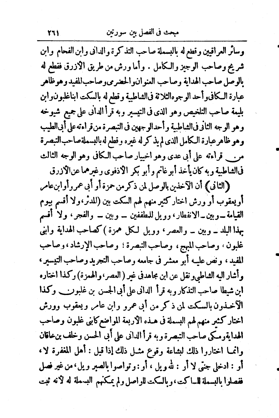 (الثَّانِي) أَنَّ الْآخِذِينَ بِالْوَصْلِ لِمَنْ ذَكَرَ مِنْ حَمْزَةَ وَأَبِي عَمْرٍو، وَابْنِ عَامِرٍ، أَوْ يَعْقُوبَ، أَوْ وَرْشٍ اخْتَارَ كَثِيرٌ مِنْهُمْ لَهُمُ السَّكْتَ بَيْنَ (الْمُدَّثِّرُ، وَلَا أُقْسِمُ بِيَوْمِ الْقِيَامَةِ - وَبَيْنَ - الِانْفِطَارِ وَوَيْلٌ لِلْمُصَلِّينَ - وَبَيْنَ وَالْفَجْرِ، وَلَا أُقْسِمُ بِهَذَا الْبَلَدِ - وَبَيْنَ وَالْعَصْرِ، وَوَيْلٌ لِكُلِّ هُمَزَةٍ) كَصَاحِبِ " الْهِدَايَةِ " وَابْنَيْ غَلْبُونَ، وَصَاحِبِ " الْمُبْهِجِ " وَصَاحِبِ " التَّبْصِرَةِ "، وَصَاحِبِ " الْإِرْشَادِ "، وَصَاحِبِ " الْمُفِيدِ "، وَنَصَّ عَلَيْهِ أَبُو مَعْشَرٍ فِي " جَامِعِهِ " وَصَاحِبُ " التَّجْرِيدِ " وَصَاحِبُ " التَّيْسِيرِ "، وَأَشَارَ إِلَيْهِ الشَّاطِبِيُّ وَنَقَلَ عَنِ ابْنِ مُجَاهِدٍ فِي غَيْرِ (وَالْعَصْرِ، وَالْهُمَزَةِ) ، وَكَذَا اخْتَارَهُ ابْنُ شَيْطَا صَاحِبُ " التَّذْكَارِ "، وَبِهِ قَرَأَ الدَّانِيُّ عَلَى أَبِي الْحَسَنِ بْنِ غَلْبُونَ، وَكَذَا الْآخِذُونَ بِالسَّكْتِ لِمَنْ ذَكَرَ مِنْ أَبِي عَمْرٍو، وَابْنِ عَامِرٍ، وَيَعْقُوبَ، وَوَرْشٍ، اخْتَارَ كَثِيرٌ مِنْهُمْ لَهُمُ الْبَسْمَلَةَ فِي هَذِهِ الْأَرْبَعَةِ الْمَوَاضِعِ كَابْنَيْ غَلْبُونَ، وَصَاحِبِ " الْهِدَايَةِ "، وَمَكِّيٍّ، وَصَاحِبِ " التَّبْصِرَةِ "، وَبِهِ قَرَأَ الدَّانِيُّ عَلَى أَبِي الْحَسَنِ، وَخَلَفِ بْنِ خَاقَانَ، وَإِنَّمَا اخْتَارُوا ذَلِكَ لِبَشَاعَةِ وُقُوعِ مِثْلِ ذَلِكَ إِذَا قِيلَ: (أَهْلُ الْمَغْفِرَةِ لَا) أَوِ: (ادْخُلِي جَنَّتِي لَا) أَوْ: (لِلَّهِ وَيْلٌ) أَوْ: (وَتَوَاصَوْا بِالصَّبْرِ وَيْلٌ) مِنْ غَيْرِ فَصْلٍ، فَفَصَلُوا بِالْبَسْمَلَةِ لِلسَّاكِتِ، وَبِالسَّكْتِ لِلْوَاصِلِ، وَلَمْ يُمْكِنْهُمُ الْبَسْمَلَةُ لَهُ ; لِأَنَّهُ ثَبَتَ