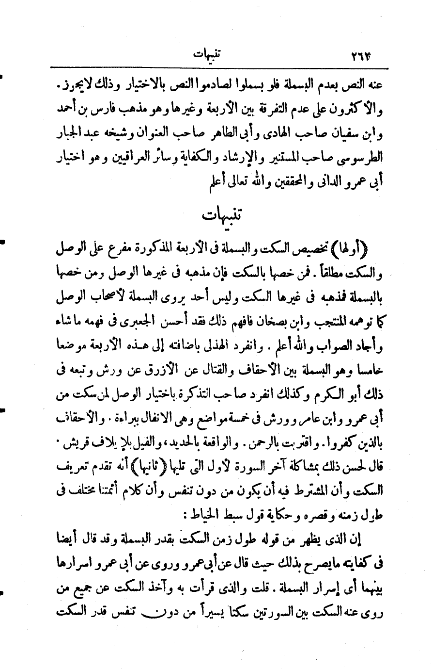 (أَوَّلُهَا) تَخْصِيصُ السَّكْتِ وَالْبَسْمَلَةِ فِي الْأَرْبَعَةِ الْمَذْكُورَةِ مُفَرَّعٌ عَلَى الْوَصْلِ وَالسَّكْتِ مُطْلَقًا. فَمَنْ خَصَّهَا بِالسَّكْتِ، فَإِنَّ مَذْهَبَهُ فِي غَيْرِهَا الْوَصْلُ، وَمَنْ خَصَّهَا بِالْبَسْمَلَةِ فَمَذْهَبُهُ فِي غَيْرِهَا السَّكْتُ وَلَيْسَ أَحَدٌ يَرْوِي الْبَسْمَلَةَ لِأَصْحَابِ الْوَصْلِ كَمَا تَوَهَّمَهُ الْمُنْتَجَبُ، وَابْنُ بُصْخَانَ، فَافْهَمْ ذَلِكَ فَقَدْ أَحْسَنَ الْجَعْبَرِيُّ فِي فَهْمِهِ مَا شَاءَ وَأَجَادَ الصَّوَابَ، وَاللَّهُ أَعْلَمُ.