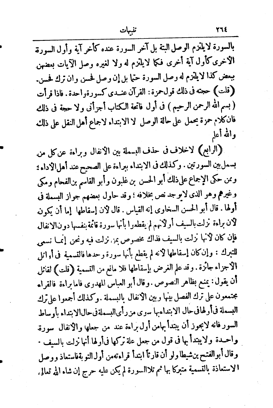 (الرَّابِعُ) لَا خِلَافَ فِي حَذْفِ الْبَسْمَلَةِ بَيْنَ الْأَنْفَالِ وَبَرَاءَةَ، عَنْ كُلِّ مَنْ بَسْمَلَ بَيْنَ السُّورَتَيْنِ. وَكَذَلِكَ فِي الِابْتِدَاءِ بِبَرَاءَةَ عَلَى الصَّحِيحِ عِنْدَ أَهْلِ الْأَدَاءِ، وَمِمَّنْ حَكَى بِالْإِجْمَاعِ عَلَى ذَلِكَ أَبُو الْحَسَنِ بْنُ غَلْبُونَ، وَابْنُ الْقَاسِمِ بْنُ الْفَحَّامِ، وَمَكِّيٌّ، وَغَيْرُهُمْ، وَهُوَ الَّذِي لَا يُوجَدُ نَصٌّ بِخِلَافِهِ، وَقَدْ حَاوَلَ بَعْضُهُمْ جَوَازَ الْبَسْمَلَةِ فِي أَوَّلِهَا. قَالَ أَبُو الْحَسَنِ السَّخَاوِيُّ: إِنَّهُ الْقِيَاسُ، قَالَ: لِأَنَّ إِسْقَاطَهَا إِمَّا أَنْ يَكُونَ لِأَنَّ بَرَاءَةَ نَزَلَتْ بِالسَّيْفِ، أَوْ لِأَنَّهُمْ لَمْ يَقْطَعُوا بِأَنَّهَا سُورَةٌ قَائِمَةٌ بِنَفْسِهَا دُونَ الْأَنْفَالِ، فَإِنْ كَانَ لِأَنَّهَا نَزَلَتْ بِالسَّيْفِ فَذَاكَ مَخْصُوصٌ بِمَنْ نَزَلَتْ فِيهِ، وَنَحْنُ إِنَّمَا نُسَمِّي لِلتَّبَرُّكِ، وَإِنْ كَانَ إِسْقَاطُهَا لِأَنَّهُ لَمْ يُقْطَعْ بِأَنَّهَا سُورَةٌ وَحْدَهَا، فَالتَّسْمِيَةُ فِي أَوَائِلِ الْأَجْزَاءِ جَائِزَةٌ. وَقَدْ عُلِمَ الْغَرَضُ بِإِسْقَاطِهَا، فَلَا مَانِعَ مِنَ التَّسْمِيَةِ.