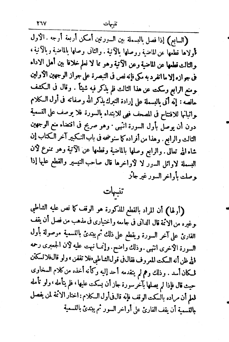 (السَّابِعُ) إِذَا فَصَلَ بِالْبَسْمَلَةِ بَيْنَ السُّورَتَيْنِ أَمْكَنَ أَرْبَعَةَ أَوْجُهٍ: الْأَوَّلُ أَوْلَاهَا قَطْعُهَا عَنِ الْمَاضِيَةِ وَوَصْلُهَا بِالْآتِيَةِ، وَالثَّانِي وَصْلُهَا بِالْمَاضِيَةِ وَبِالْآتِيَةِ، وَالثَّالِثُ قَطْعُهَا عَنِ الْمَاضِيَةِ وَعَنِ الْآتِيَةِ، وَهُوَ مِمَّا لَا نَعْلَمُ خِلَافًا بَيْنَ أَهْلِ الْأَدَاءِ فِي جَوَازِهِ إِلَّا مَا انْفَرَدَ بِهِ مَكِّيٌّ، فَإِنَّهُ نَصَّ فِي " التَّبْصِرَةِ " عَلَى جَوَازِ الْوَجْهَيْنِ الْأَوَّلَيْنِ وَمَنْعِ الرَّابِعِ، وَسَكَتَ عَنْ هَذَا الثَّالِثِ فَلَمْ يَذْكُرْ فِيهِ شَيْئًا، وَقَالَ فِي " الْكَشْفِ " مَا نَصُّهُ: إِنَّهُ أَتَى بِالْبَسْمَلَةِ عَلَى إِرَادَةِ التَّبَرُّكِ بِذِكْرِ اللَّهِ وَصِفَاتِهِ فِي أَوَّلِ الْكَلَامِ وَإِثْبَاتِهَا لِلِافْتِتَاحِ فِي الْمُصْحَفِ، فَهِيَ لِلِابْتِدَاءِ بِالسُّورَةِ، فَلَا يُوصَفُ عَلَى التَّسْمِيَةِ دُونَ أَنْ يُوصَلَ بِأَوَّلِ السُّورَةِ. انْتَهَى، وَهُوَ صَرِيحٌ فِي اقْتِضَاءِ مَنْعِ الْوَجْهَيْنِ الثَّالِثِ وَالرَّابِعِ. وَهَذَا مِنْ أَفْرَادِهِ كَمَا سَنُوَضِّحُهُ فِي بَابِ التَّكْبِيرِ آخِرَ الْكِتَابِ، إِنْ شَاءَ اللَّهُ تَعَالَى. وَالرَّابِعُ وَصْلُهَا بِالْمَاضِيَةِ وَقَطْعُهَا عَنِ الْآتِيَةِ، وَهُوَ مَمْنُوعٌ ; لِأَنَّ الْبَسْمَلَةَ لِأَوَائِلِ السُّوَرِ لَا لِأَوَاخِرِهَا، قَالَ: صَاحِبُ " التَّيْسِيرِ ": وَالْقَطْعُ عَلَيْهَا إِذَا وُصِلَتْ بِأَوَاخِرِ السُّوَرِ غَيْرُ جَائِزٍ.