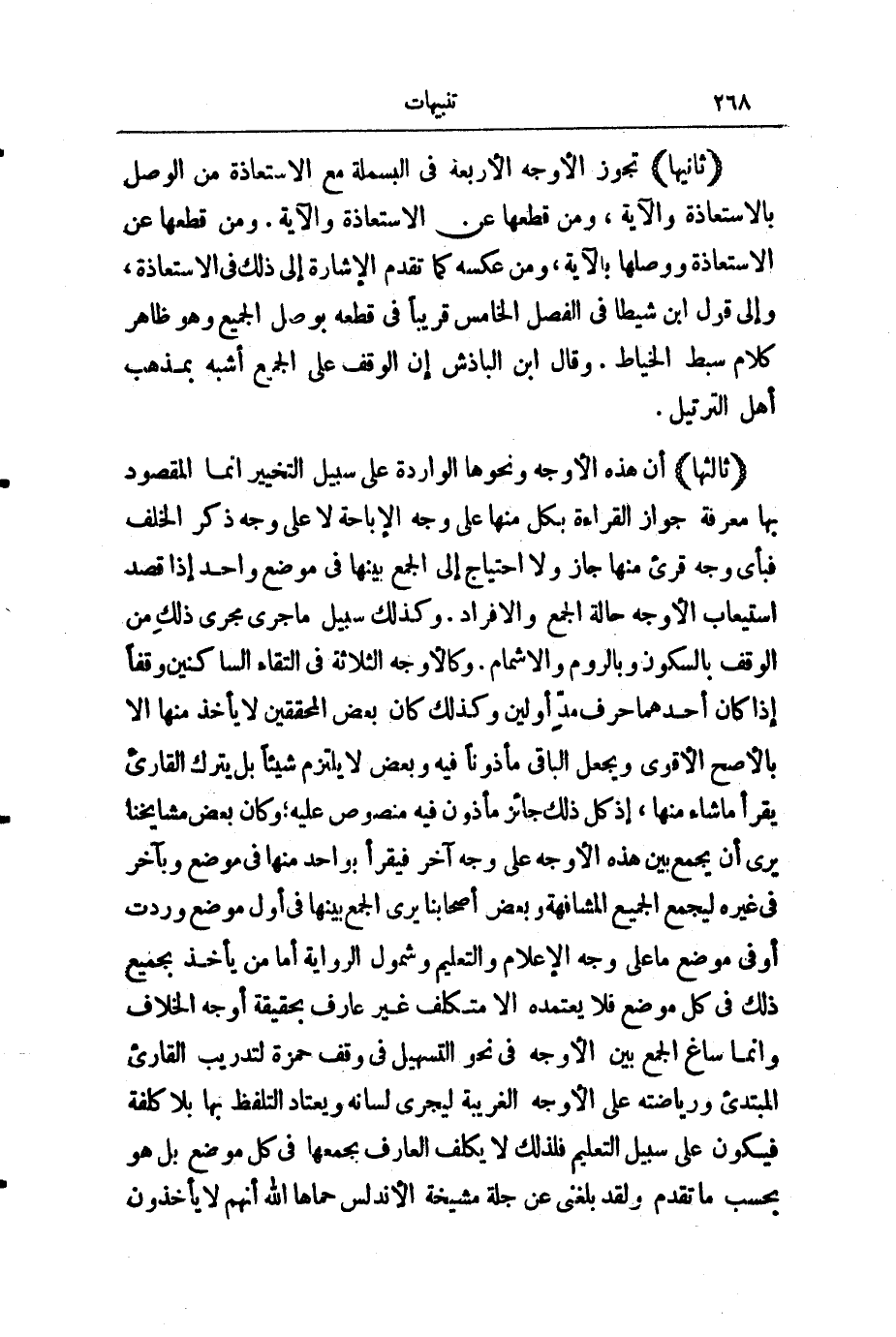 (ثَالِثُهَا) إِنَّ هَذِهِ الْأَوْجُهَ وَنَحْوَهَا الْوَارِدَةَ عَلَى سَبِيلِ التَّخْيِيرِ، إِنَّمَا الْمَقْصُودُ بِهَا مَعْرِفَةُ جَوَازِ الْقِرَاءَةِ بِكُلٍّ مِنْهَا عَلَى وَجْهِ الْإِبَاحَةِ لَا عَلَى وَجْهِ ذِكْرِ الْخُلْفِ، فَبِأَيِّ وَجْهٍ قُرِئَ مِنْهَا جَازَ، وَلَا احْتِيَاجَ إِلَى الْجَمْعِ بَيْنَهَا فِي مَوْضِعٍ وَاحِدٍ إِذَا قُصِدَ اسْتِيعَابُ الْأَوْجُهِ حَالَةَ الْجَمْعِ وَالْإِفْرَادِ. وَكَذَلِكَ سَبِيلُ مَا جَرَى مَجْرَى ذَلِكَ مِنَ الْوَقْفِ بِالسُّكُونِ وَبِالرَّوْمِ وَالْإِشْمَامِ، وَكَالْأَوْجُهِ الثَّلَاثَةِ فِي الْتِقَاءِ السَّاكِنَيْنِ وَقْفًا إِذَا كَانَ أَحَدُهُمَا حَرْفَ مَدٍّ أَوْ لِينٍ، وَكَذَلِكَ كَانَ بَعْضُ الْمُحَقِّقِينَ لَا يَأْخُذُ مِنْهَا إِلَّا بِالْأَصَحِّ الْأَقْوَى، وَيَجْعَلُ الْبَاقِي مَأْذُونًا فِيهِ، وَبَعْضٌ لَا يَلْتَزِمُ شَيْئًا، بَلْ يَتْرُكُ الْقَارِئَ يَقْرَأُ مَا شَاءَ مِنْهَا، إِذْ كُلُّ ذَلِكَ جَائِزٌ مَأْذُونٌ فِيهِ مَنْصُوصٌ عَلَيْهِ، وَكَانَ بَعْضُ مَشَايِخِنَا يَرَى أَنْ يَجْمَعَ بَيْنَ هَذِهِ الْأَوْجُهِ عَلَى وَجْهٍ آخَرَ، فَيَقْرَأُ بِوَاحِدٍ مِنْهَا فِي مَوْضِعٍ وَبِآخَرَ فِي غَيْرِهِ؛ لِيَجْمَعَ الْجَمِيعَ الْمُشَافَهَةُ، وَبَعْضُ أَصْحَابِنَا يَرَى الْجَمْعَ بَيْنَهَا وَبَيْنَ أَوَّلِ مَوْضِعٍ وَرَدَتْ، أَوْ فِي مَوْضِعٍ مَا عَلَى وَجْهِ الْإِعْلَامِ وَالتَّعْلِيمِ وَشُمُولِ الرِّوَايَةِ، أَمَّا مَنْ يَأْخُذُ بِجَمِيعِ ذَلِكَ فِي كُلِّ مَوْضِعٍ فَلَا يَعْتَمِدُهُ إِلَّا مُتَكَلِّفٌ غَيْرُ عَارِفٍ بِحَقِيقَةِ أَوْجُهِ الْخِلَافِ، وَإِنَّمَا سَاغَ الْجَمْعُ بَيْنَ الْأَوْجُهِ فِي نَحْوِ التَّسْهِيلِ فِي وَقْفِ حَمْزَةَ لِتَدْرِيبِ الْقَارِئِ الْمُبْتَدِئِ وَرِيَاضَتِهِ عَلَى الْأَوْجُهِ الْغَرِيبَةِ لِيَجْرِيَ لِسَانُهُ وَيَعْتَادَ التَّلَفُّظَ بِهَا بِلَا كُلْفَةٍ، فَيَكُونُ عَلَى سَبِيلِ التَّعْلِيمِ ; فَلِذَلِكَ لَا يُكَلَّفُ الْعَارِفُ بِجَمْعِهَا فِي كُلِّ مَوْضِعٍ، بَلْ هُوَ بِحَسَبِ مَا تَقَدَّمَ، وَلَقَدْ بَلَغَنِي عَنْ جُلَّةِ مَشْيَخَةِ الْأَنْدَلُسِ - حَمَاهَا اللَّهُ - أَنَّهُمْ لَا يَأْخُذُونَ