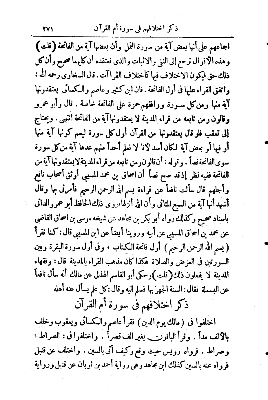 (قُلْتُ) : وَهَذِهِ الْأَقْوَالُ تَرْجِعُ إِلَى النَّفْيِ وَالْإِثْبَاتِ، وَالَّذِي نَعْتَقِدُهُ أَنَّ كِلَيْهُمَا صَحِيحٌ، وَأَنَّ كُلَّ ذَلِكَ حَقٌّ، فَيَكُونُ الِاخْتِلَافُ فِيهِمَا كَاخْتِلَافِ الْقِرَاءَاتِ. قَالَ السَّخَاوِيُّ - رَحِمَهُ اللَّهُ -: وَاتَّفَقَ الْقُرَّاءُ عَلَيْهَا فِي أَوَّلِ الْفَاتِحَةِ، فَإِنَّ ابْنَ كَثِيرٍ، وَعَاصِمًا، وَالْكِسَائِيَّ يَعْتَقِدُونَهَا آيَةً مِنْهَا وَمِنْ كُلِّ سُورَةٍ، وَوَافَقَهُمْ حَمْزَةُ عَلَى الْفَاتِحَةِ خَاصَّةً. قَالَ: وَأَبُو عَمْرٍو، وَقَالُونُ، وَمَنْ تَابَعَهُ مِنْ قُرَّاءِ الْمَدِينَةِ لَا يَعْتَقِدُونَهَا آيَةً مِنَ الْفَاتِحَةِ. انْتَهَى. وَيُحْتَاجُ إِلَى تَعَقُّبٍ، فَلَوْ قَالَ: يَعْتَقِدُونَهَا مِنَ الْقُرْآنِ أَوَّلَ كُلِّ سُورَةٍ لِيَعُمَّ كَوْنَهَا آيَةً مِنْهَا أَوْ فِيهَا، أَوْ بَعْضَ آيَةٍ - لَكَانَ أَسَدَّ ; لِأَنَّا لَا نَعْلَمُ أَحَدًا مِنْهُمْ عَدَّهَا آيَةً مِنْ كُلِّ سُورَةٍ سِوَى الْفَاتِحَةِ نَصًّا، وَقَوْلُهُ: إِنَّ قَالُونَ وَمَنْ تَابَعَهُ مِنْ قُرَّاءِ الْمَدِينَةِ لَا يَعْتَقِدُونَهَا آيَةً مِنَ الْفَاتِحَةِ فَفِيهِ نَظَرٌ، إِذْ قَدْ صَحَّ نَصًّا أَنَّ إِسْحَاقَ بْنَ مُحَمَّدٍ الْمُسَيَّبِيَّ أَوْثَقَ أَصْحَابِ نَافِعٍ وَأَجَلَّهُمْ، قَالَ: سَأَلْتُ نَافِعًا، عَنْ قِرَاءَةِ بِسْمِ اللَّهِ الرَّحْمَنِ الرَّحِيمِ فَأَمَرَنِي بِهَا، وَقَالَ: أَشْهَدُ أَنَّهَا آيَةٌ مِنَ السَّبْعِ الْمَثَانِي، وَأَنَّ اللَّهَ أَنْزَلَهَا. رَوَى ذَلِكَ الْحَافِظُ أَبُو عَمْرٍو الدَّانِيُّ بِإِسْنَادٍ صَحِيحٍ، وَكَذَلِكَ رَوَاهُ أَبُو بَكْرِ بْنُ مُجَاهِدٍ، عَنْ شَيْخِهِ مُوسَى بْنِ إِسْحَاقَ الْقَاضِي عَمِّ مُحَمَّدِ بْنِ إِسْحَاقَ الْمُسَيَّبِيِّ، عَنْ أَبِيهِ، وَرُوِّينَا أَيْضًا عَنِ الْمُسَيَّبِيِّ قَالَ: كُنَّا نَقْرَأُ (بِسْمِ اللَّهِ الرَّحْمَنِ الرَّحِيمِ) أَوَّلَ فَاتِحَةِ الْكِتَابِ، وَفِي أَوَّلِ سُورَةِ الْبَقَرَةِ، وَبَيْنَ السُّورَتَيْنِ فِي الْعَرْضِ وَالصَّلَاةِ، هَكَذَا كَانَ مَذْهَبُ الْقُرَّاءِ بِالْمَدِينَةِ قَالَ: وَفُقَهَاءُ الْمَدِينَةِ لَا يَفْعَلُونَ ذَلِكَ.