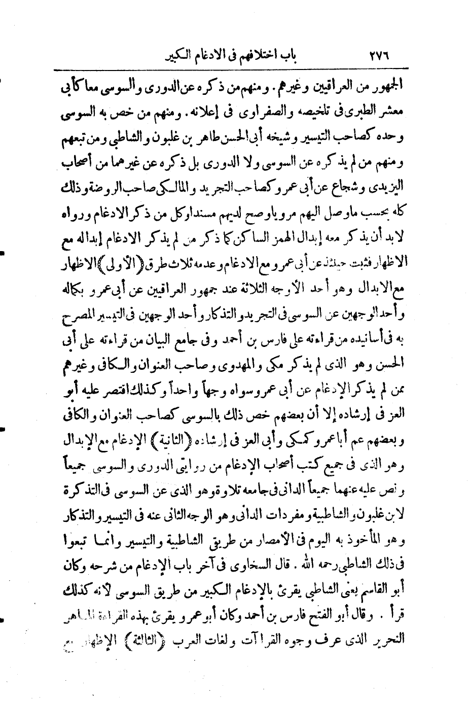 الْجُمْهُورُ مِنَ الْعِرَاقِيِّينَ وَغَيْرِهِمْ، وَمِنْهُمْ مَنْ ذَكَرَهُ عَنِ الدُّورِيِّ وَالسُّوسِيِّ مَعًا كَأَبِي مَعْشَرٍ الطَّبَرِيِّ فِي تَلْخِيصِهِ، وَالصَّفْرَاوِيِّ فِي إِعْلَانِهِ، وَمِنْهُمْ مَنْ خَصَّ بِهِ السُّوسِيَّ وَحْدَهُ كَصَاحِبِ " التَّيْسِيرِ "، وَشَيْخِهِ أَبِي الْحَسَنِ طَاهِرِ بْنِ غَلْبُونَ، وَالشَّاطِبِيِّ، وَمَنْ تَبِعَهُمْ، وَمِنْهُمْ مَنْ لَمْ يَذْكُرْهُ عَنِ السُّوسِيِّ، وَلَا الدُّورِيِّ، بَلْ ذَكَرَهُ عَنْ غَيْرِهِمَا مِنْ أَصْحَابِ الْيَزِيدِيِّ وَشُجَاعٍ، عَنْ أَبِي عَمْرٍو كَصَاحِبِ " التَّجْرِيدِ " وَالْمَالِكِيِّ صَاحِبِ " الرَّوْضَةِ "، وَذَلِكَ كُلُّهُ بِحَسَبِ مَا وَصَلَ إِلَيْهِمْ مَرْوِيًّا، وَصَحَّ لَدَيْهِمْ مُسْنَدًا، وَكُلُّ مَنْ ذَكَرَ الْإِدْغَامَ وَرَوَاهُ لَا بُدَّ أَنْ يَذْكُرَ مَعَهُ إِبْدَالَ الْهَمْزِ السَّاكِنِ كَمَا ذَكَرَ مَنْ لَمْ يَذْكُرِ الْإِدْغَامَ إِبْدَالَهُ مَعَ الْإِظْهَارِ، فَثَبَتَ حِينَئِذٍ عَنْ أَبِي عَمْرٍو مَعَ الْإِدْغَامِ وَعَدَمِهِ ثَلَاثُ طُرُقٍ (الْأُولَى) الْإِظْهَارُ مَعَ الْإِبْدَالِ، وَهُوَ أَحَدُ الْأَوْجُهِ الثَّلَاثَةِ عِنْدَ جُمْهُورِ الْعِرَاقِيِّينَ، عَنْ أَبِي عَمْرٍو بِكَمَالِهِ، وَأَحَدُ الْوَجْهَيْنِ عَنِ السُّوسِيِّ فِي " التَّجْرِيدِ " " وَالتَّذْكَارِ " وَأَحَدُ الْوَجْهَيْنِ فِي " التَّيْسِيرِ " الْمُصَرَّحِ بِهِ فِي أَسَانِيدِهِ مِنْ قِرَاءَتِهِ عَلَى فَارِسِ بْنِ أَحْمَدَ وَفِي " جَامِعِ الْبَيَانِ " مِنْ قِرَاءَتِهِ عَلَى أَبِي الْحَسَنِ، وَهُوَ الَّذِي لَمْ يَذْكُرْ مَكِّيٌّ وَالْمَهْدَوِيُّ وَصَاحِبُ " الْعُنْوَانِ " وَ " الْكَافِي "، وَغَيْرُهُمْ مِمَّنْ لَمْ يَذْكُرِ الْإِدْغَامَ عَنْ أَبِي عَمْرٍو سِوَاهُ وَجْهًا وَاحِدًا، وَكَذَلِكَ اقْتَصَرَ عَلَيْهِ أَبُو الْعِزِّ فِي إِرْشَادِهِ، إِلَّا أَنَّ بَعْضَهُمْ خَصَّ ذَلِكَ بِالسُّوسِيِّ كَصَاحِبِ " الْعُنْوَانِ " وَ " الْكَافِي " وَبَعْضَهُمْ عَمَّ أَبَا عَمْرٍو كَمَكِّيٍّ وَأَبِي الْعِزِّ فِي إِرْشَادِهِ (الثَّانِيَةُ) الْإِدْغَامُ مَعَ الْإِبْدَالِ، وَهُوَ الَّذِي فِي جَمِيعِ كُتُبِ أَصْحَابِ الْإِدْغَامِ مِنْ رِوَايَتَيِ الدُّورِيِّ، وَالسُّوسِيِّ جَمِيعًا، وَنَصَّ عَلَيْهِ عَنْهُمَا جَمِيعًا الدَّانِيُّ فِي جَامِعِهِ تِلَاوَةً، وَهُوَ الَّذِي عَنِ السُّوسِيِّ فِي " التَّذْكِرَةِ " لِابْنِ غَلْبُونَ وَ " الشَّاطِبِيَّةِ " وَمُفْرَدَاتِ الدَّانِيِّ، وَهُوَ الْوَجْهُ الثَّانِي عَنْهُ فِي " التَّيْسِيرِ " وَ " التَّذْكَارُ "، وَهُوَ الْمَأْخُوذُ بِهِ الْيَوْمَ فِي الْأَمْصَارِ مِنْ طَرِيقِ " الشَّاطِبِيَّةِ " " وَالتَّيْسِيرِ "، وَإِنَّمَا تَبِعُوا فِي ذَلِكَ الشَّاطِبِيَّ، رَحِمَهُ اللَّهُ.
