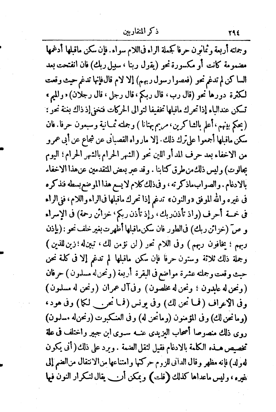 وَجُمْلَتُهُ أَرْبَعَةٌ وَثَمَانُونَ حَرْفًا، كَجُمْلَةِ الرَّاءِ فِي اللَّامِ سَوَاءً. فَإِنْ سُكِّنَ مَا قَبْلَهَا أَدْغَمَهَا - مَضْمُومَةً كَانَتْ أَوْمَكْسُورَةً - نَحْوُ يَقُولُ رَبَّنَا، سَبِيلِ رَبِّكَ فَإِنِ انْفَتَحَتْ بَعْدَ السَّاكِنِ لَمْ تُدْغَمْ نَحْوُ فَعَصَوْا رَسُولَ رَبِّهِمْ إِلَّا لَامَ " قَالَ "، فَإِنَّهَا تُدْغَمُ حَيْثُ وَقَعَتْ ; لِكَثْرَةِ دَوْرِهَا نَحْوُ قَالَ رَبِّ، قَالَ رَبُّكُمْ، وَقَالَ رَجُلٌ، قَالَ رَجُلَانِ. " وَالْمِيمُ " تُسَكَّنُ عِنْدَ الْبَاءِ إِذَا تَحَرَّكَ مَا قَبْلَهَا تَخْفِيفًا لِتَوَالِي الْحَرَكَاتِ، فَتُخْفَى إِذْ ذَاكَ بِغُنَّةٍ نَحْوُ: يَحْكُمُ بَيْنَهُمْ، بِأَعْلَمَ بِالشَّاكِرِينَ، مَرْيَمَ بُهْتَانًا وَجُمْلَتُهُ ثَمَانِيَةٌ وَسَبْعُونَ حَرْفًا. فَإِنْ سُكِّنَ مَا قَبْلَهَا أَجْمَعُوا عَلَى تَرْكِ ذَلِكَ. إِلَّا مَا رَوَاهُ الْقَصَبَانِيُّ، عَنْ شُجَاعٍ، عَنْ أَبِي عَمْرٍو مِنَ الْإِخْفَاءِ بَعْدَ حَرْفِ الْمَدِّ أَوِ اللِّينِ نَحْوُ الشَّهْرُ الْحَرَامُ بِالشَّهْرِ الْحَرَامِ، الْيَوْمَ بِجَالُوتَ وَلَيْسَ ذَلِكَ مِنْ طُرُقِ كِتَابِنَا. وَقَدْ عَبَّرَ بَعْضُ الْمُتَقَدِّمِينَ عَنْ هَذَا الْإِخْفَاءِ بِالْإِدْغَامِ، وَالصَّوَابُ مَا ذَكَرْتُهُ، وَفِي ذَلِكَ كَلَامٌ لَا يَسَعُ هَذَا الْمَوْضِعَ بَسْطُهُ، فَنَذْكُرُهُ فِي غَيْرِهِ، وَاللَّهُ الْمُوَفِّقُ.