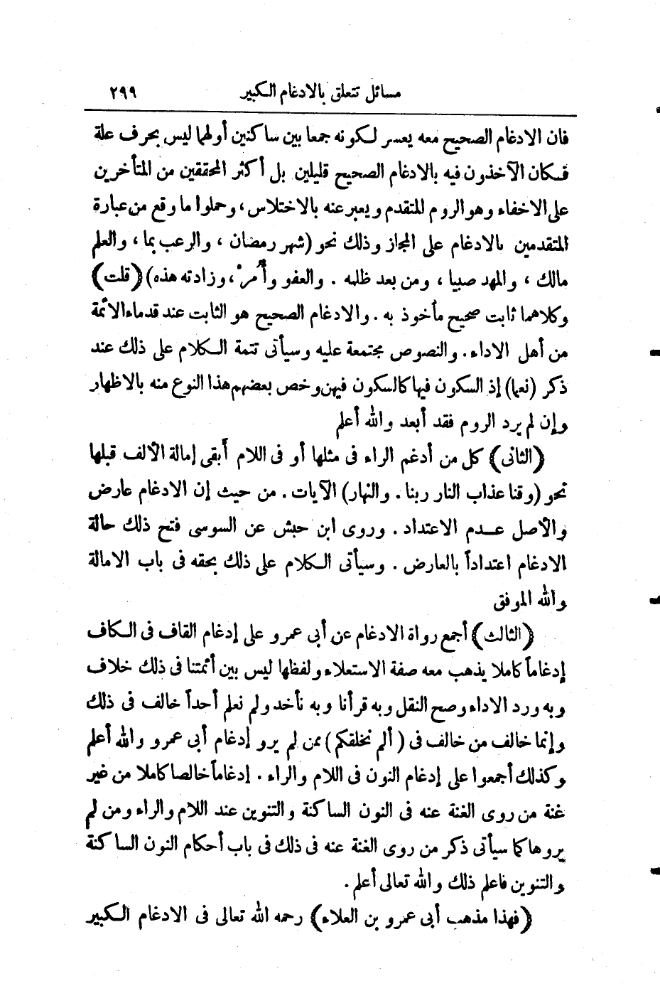 (الثَّالِثُ) أَجْمَعَ رُوَاةُ الْإِدْغَامِ، عَنْ أَبِي عَمْرٍو، عَلَى إِدْغَامِ الْقَافِ فِي الْكَافِ إِدْغَامًا كَامِلًا يُذْهِبُ مَعَهُ صِفَةَ الِاسْتِعْلَاءِ وَلَفْظَهَا، لَيْسَ بَيْنَ أَئِمَّتِنَا فِي ذَلِكَ خِلَافٌ، وَبِهِ وَرَدَ الْأَدَاءُ وَصَحَّ النَّقْلُ، وَبِهِ قَرَأْنَا وَبِهِ نَأْخُذُ، وَلَمْ نَعْلَمْ أَحَدًا خَالَفَ فِي ذَلِكَ، وَإِنَّمَا خَالَفَ مَنْ خَالَفَ فِي أَلَمْ نَخْلُقْكُمْ مِمَّنْ لَمْ يَرَوْا إِدْغَامَ أَبِي عَمْرٍو، وَاللَّهُ أَعْلَمُ. وَكَذَلِكَ أَجْمَعُوا عَلَى إِدْغَامِ النُّونِ فِي اللَّامِ وَالرَّاءِ إِدْغَامًا خَالِصًا كَامِلًا مِنْ غَيْرِ غُنَّةِ مَنْ رَوَى الْغُنَّةَ عَنْهُ فِي النُّونِ السَّاكِنَةِ وَالتَّنْوِينِ عِنْدَ اللَّامِ وَالرَّاءِ وَمَنْ لَمْ يَرْوِهَا، كَمَا سَيَأْتِي ذِكْرُ مَنْ رَوَى الْغُنَّةَ عَنْهُ فِي ذَلِكَ فِي بَابِ أَحْكَامِ النُّونِ السَّاكِنَةِ وَالتَّنْوِينِ، فَاعْلَمْ ذَلِكَ، وَاللَّهُ تَعَالَى أَعْلَمُ.