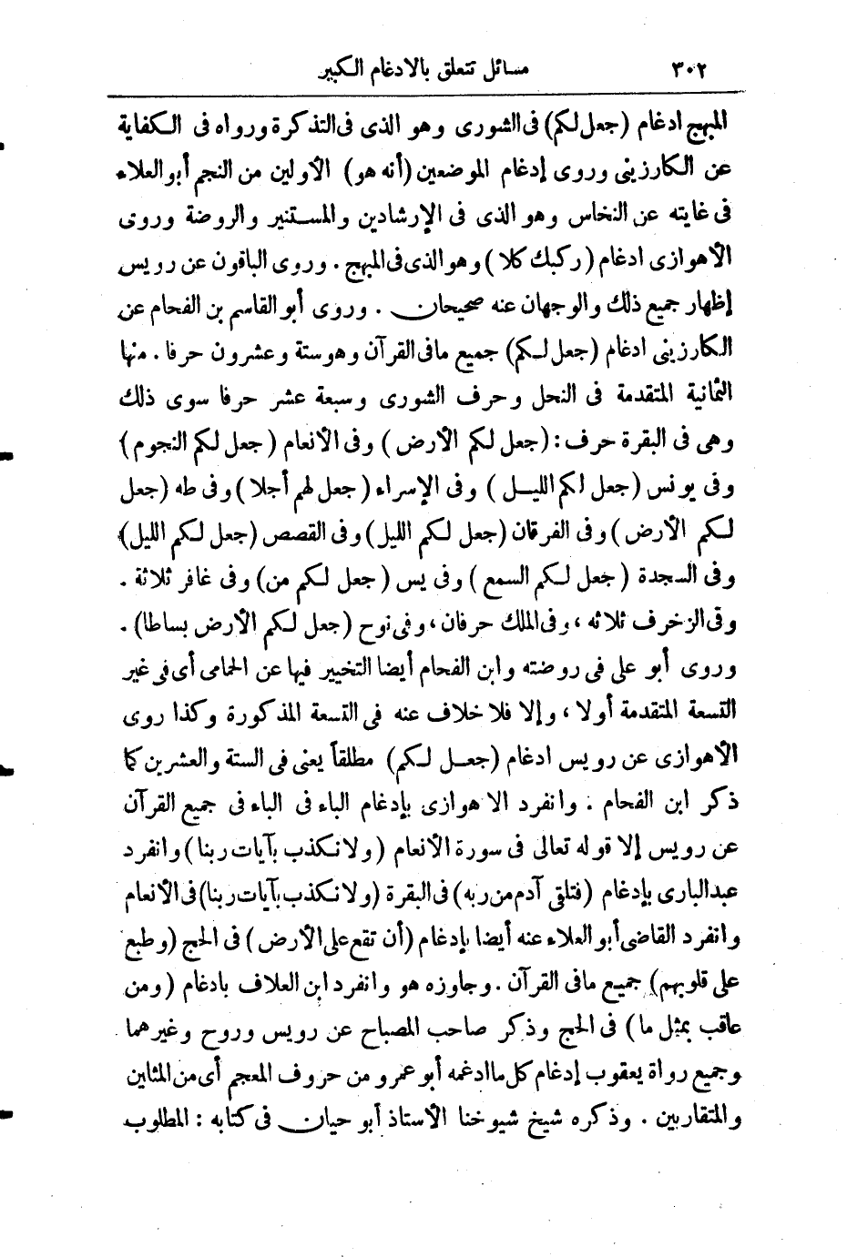 " الْمُبْهِجِ " إِدْغَامَ جَعَلَ لَكُمُ فِي الشُّورَى، وَهُوَ الَّذِي فِي " التَّذْكِرَةِ "، وَرَوَاهُ فِي " الْكِفَايَةِ " عَنِ الْكَارَزِينِيِّ، وَرَوَى إِدْغَامَ الْمَوْضِعَيْنِ إِنَّهُ هُوَ الْأَوَّلَيْنِ مِنَ النَّجْمِ أَبُو الْعَلَاءِ فِي غَايَتِهِ عَنِ النَّخَّاسِ، وَهُوَ الَّذِي فِي الْإِرْشَادَيْنِ وَ " الْمُسْتَنِيرِ " وَ " الرَّوْضَةِ "، وَرَوَى الْأَهْوَازِيُّ إِدْغَامَ رَكَّبَكَ كَلَّا، وَهُوَ الَّذِي فِي " الْمُبْهِجِ ". وَرَوَى الْبَاقُونَ عَنْ رُوَيْسٍ إِظْهَارَ جَمِيعِ ذَلِكَ، وَالْوَجْهَانِ عَنْهُ صَحِيحَانِ، وَرَوَى أَبُو الْقَاسِمِ بْنُ الْفَحَّامِ عَنِ الْكَارَزِينِيِّ إِدْغَامَ جَعَلَ لَكُمُ جَمِيعَ مَا فِي الْقُرْآنِ، وَهُوَ سِتَّةٌ وَعِشْرُونَ حَرْفًا. مِنْهَا الثَّمَانِيَةُ الْمُتَقَدِّمَةُ فِي النَّحْلِ، وَحَرْفُ الشُّورَى، وَسَبْعَةَ عَشَرَ حَرْفًا سِوَى ذَلِكَ، وَهِيَ فِي الْبَقَرَةِ حَرْفُ: جَعَلَ لَكُمُ الْأَرْضَ، وَفِي الْأَنْعَامِ جَعَلَ لَكُمُ النُّجُومَ، وَفِي يُونُسَ جَعَلَ لَكُمُ اللَّيْلَ، وَفِي الْإِسْرَاءِ وَجَعَلَ لَهُمْ أَجَلًا، وَفِي طه جَعَلَ لَكُمُ الْأَرْضَ، وَفِي الْفُرْقَانِ جَعَلَ لَكُمُ اللَّيْلَ، وَفِي الْقَصَصِ جَعَلَ لَكُمُ اللَّيْلَ، وَفِي السَّجْدَةِ وَجَعَلَ لَكُمُ السَّمْعَ، وَفِي يس جَعَلَ لَكُمْ مِنْ، وَفِي غَافِرٍ ثَلَاثَةٌ، وَفِي الزُّخْرُفِ ثَلَاثَةٌ، وَفِي الْمُلْكِ حَرْفَانِ، وَفِي نُوحٍ جَعَلَ لَكُمُ الْأَرْضَ بِسَاطًا، وَرَوَى أَبُو عَلِيٍّ فِي رَوْضَتِهِ، وَابْنُ الْفَحَّامِ أَيْضًا التَّخْيِيرَ فِيهَا عَنِ الْحَمَّامِيِّ، أَيْ فِي غَيْرِ التِّسْعَةِ الْمُتَقَدِّمَةِ أَوَّلًا، وَإِلَّا فَلَا خِلَافَ عَنْهُ فِي التِّسْعَةِ الْمَذْكُورَةِ، وَكَذَا رَوَى الْأَهْوَازِيُّ، عَنْ رُوَيْسٍ إِدْغَامَ " جَعَلَ لَكُمْ " مُطْلَقًا يَعْنِي فِي السِّتَّةِ وَالْعِشْرِينَ كَمَا ذَكَرَ ابْنُ الْفَحَّامِ، وَانْفَرَدَ الْأَهْوَازِيُّ بِإِدْغَامِ الْبَاءِ فِي الْبَاءِ فِي جَمِيعِ الْقُرْآنِ، عَنْ رُوَيْسٍ إِلَّا قَوْلَهُ تَعَالَى فِي سُورَةِ الْأَنْعَامِ: " وَلَا نُكَذِّبَ بِآيَاتِ رَبِّنَا " وَانْفَرَدَ عَبْدُ الْبَارِي فِي إِدْغَامِ فَتَلَقَّى آدَمُ مِنْ رَبِّهِ فِي الْبَقَرَةِ وَلَا نُكَذِّبَ بِآيَاتِ رَبِّنَا فِي الْأَنْعَامِ، وَانْفَرَدَ الْقَاضِي أَبُو الْعَلَاءِ عَنْهُ أَيْضًا بِإِدْغَامِ أَنْ تَقَعَ عَلَى الْأَرْضِ فِي الْحَجِّ وَطُبِعَ عَلَى قُلُوبِهِمْ جَمِيعِ مَا فِي الْقُرْآنِ، وَجَاوَزَهُ هُوَ، وَانْفَرَدَ ابْنُ الْعَلَّافِ بِإِدْغَامِ " وَمَنْ عَاقَبَ بِمِثْلِ مَا " فِي الْحَجِّ، وَذَكَرَ صَاحِبُ " الْمِصْبَاحِ "، عَنْ رُوَيْسٍ وَرَوْحٍ وَغَيْرِهِمَا وَجَمِيعِ رُوَاةِ يَعْقُوبَ إِدْغَامَ كُلِّ مَا أَدْغَمَهُ أَبُو عَمْرٍو مِنْ حُرُوفِ الْمُعْجَمِ، أَيْ: مِنَ الْمِثْلَيْنِ وَالْمُتَقَارِبَيْنِ، وَذَكَرَهُ شَيْخُ شُيُوخِنَا الْأُسْتَاذُ أَبُو حَيَّانَ فِي كِتَابِهِ الْمَطْلُوبِ