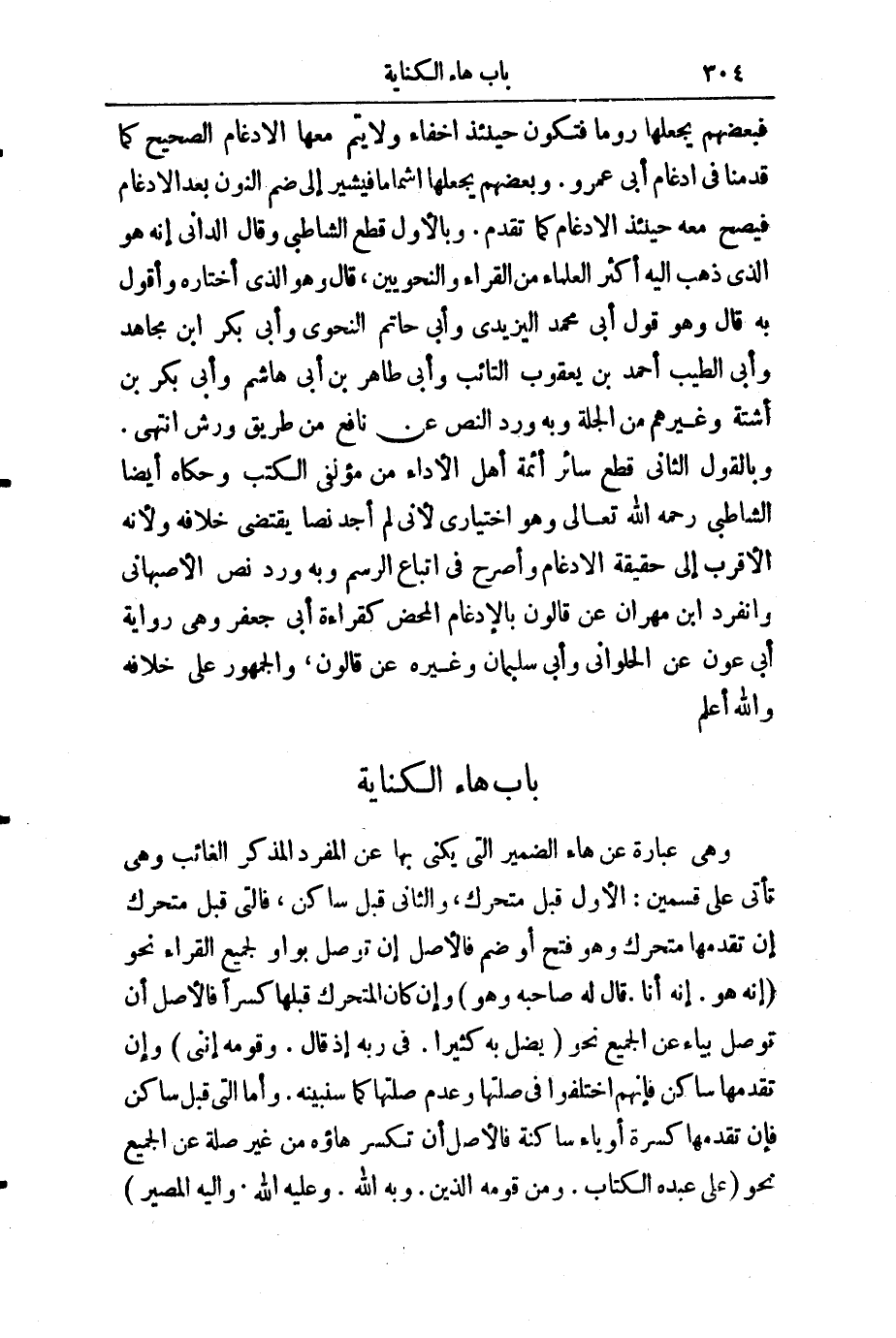 وَهِيَ عِبَارَةٌ عَنْ هَاءِ الضَّمِيرِ الَّتِي يُكَنَّى بِهَا الْمُفْرَدُ الْمُذَكَّرُ الْغَائِبُ وَهِيَ تَأْتِي عَلَى قِسْمَيْنِ: الْأَوَّلُ قَبْلَ مُتَحَرِّكٍ، وَالثَّانِي قَبْلَ سَاكِنٍ، فَالَّتِي قَبْلَ مُتَحَرِّكٍ إِنْ تَقَدَّمَهَا مُتَحَرِّكٌ وَهُوَ فَتْحٌ أَوْ ضَمٌّ فَالْأَصْلُ أَنْ تُوصَلَ بِوَاوٍ لِجَمِيعِ الْقُرَّاءِ نَحْوُ إِنَّهُ هُوَ، إِنَّهُ أَنَا، قَالَ لَهُ صَاحِبُهُ وَهُوَ، وَإِنْ كَانَ الْمُتَحَرِّكُ قَبْلَهَا كَسْرًا فَالْأَصْلُ أَنْ تُوصَلَ بِيَاءٍ عَنِ الْجَمِيعِ نَحْوُ يُضِلُّ بِهِ كَثِيرًا، فِي رَبِّهِ أَنْ آتَاهُ، وَقَوْمِهِ إِنَّنِي، وَإِنْ تَقَدَّمَهَا سَاكِنٌ فَإِنَّهُمُ اخْتَلَفُوا فِي صِلَتِهَا وَعَدَمِ صِلَتِهَا كَمَا سَنُبَيِّنُهُ، وَأَمَّا الَّتِي قَبْلَ سَاكِنٍ، فَإِنْ تَقَدَّمَهَا كَسْرَةٌ أَوْ يَاءٌ سَاكِنَةٌ، فَالْأَصْلُ أَنْ تُكْسَرَ هَاؤُهُ مِنْ غَيْرِ صِلَةٍ عَنِ الْجَمِيعِ نَحْوُ عَلَى عَبْدِهِ الْكِتَابَ، وَمِنْ قَوْمِهِ الَّذِينَ، وَبِهِ اللَّهُ، وَ (عَلَيْهِ اللَّهَ) ، وَإِلَيْهِ الْمَصِيرُ
