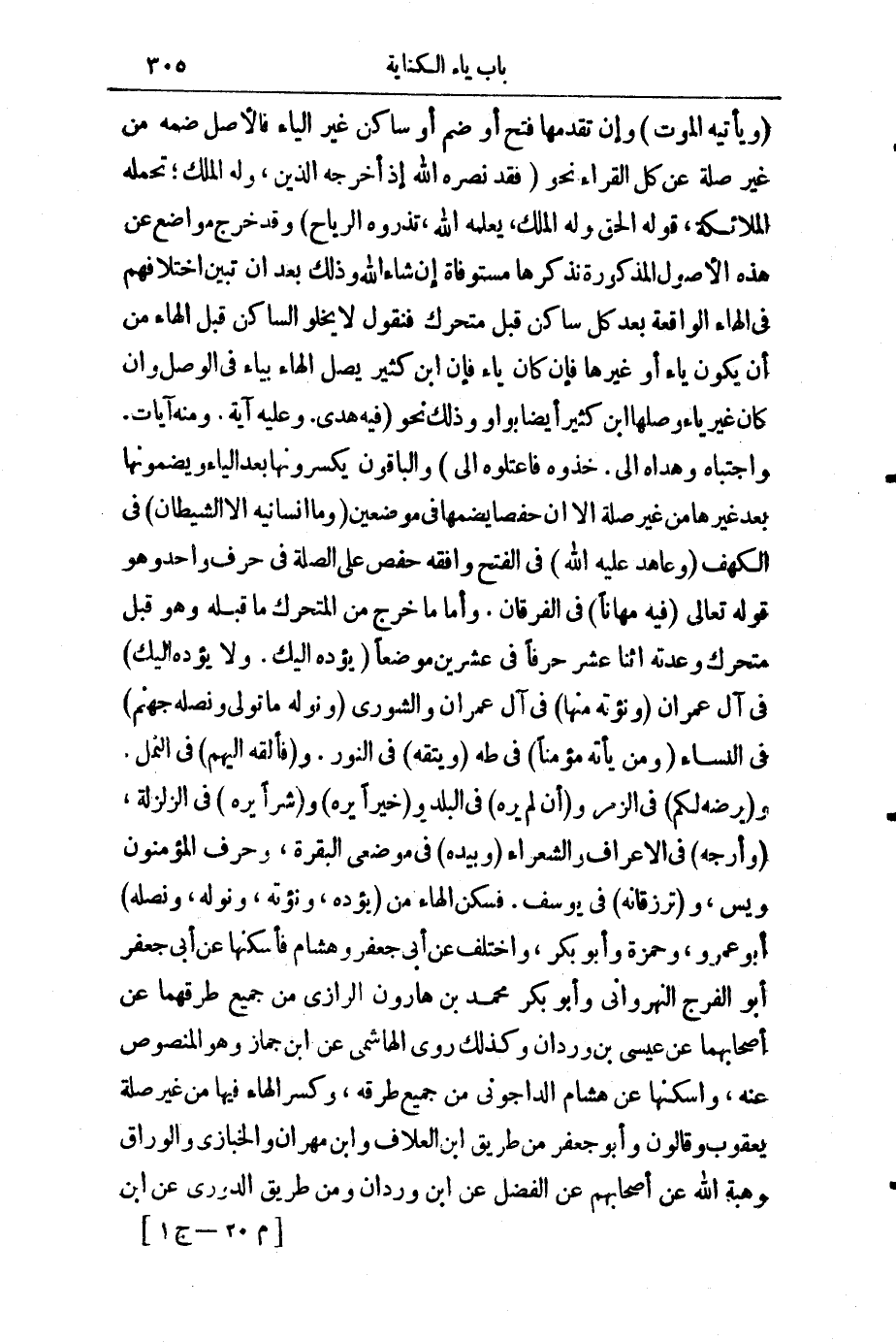 وَقَدْ خَرَجَ مَوَاضِعُ مِنْ هَذِهِ الْأُصُولِ الْمَذْكُورَةِ، نَذْكُرُهَا مُسْتَوْفَاةً إِنْ شَاءَ اللَّهُ، وَذَلِكَ بَعْدَ أَنْ نُبَيِّنَ اخْتِلَافَهُمْ فِي الْهَاءِ الْوَاقِعَةِ بَعْدَ كُلِّ سَاكِنٍ قَبْلَ مُتَحَرِّكٍ، فَنَقُولُ: لَا يَخْلُو السَّاكِنُ قَبْلَ الْهَاءِ مِنْ أَنْ يَكُونَ يَاءً، أَوْ غَيْرَهَا، فَإِنْ كَانَ يَاءً، فَإِنَّ ابْنَ كَثِيرٍ يَصِلُ الْهَاءَ بِيَاءٍ فِي الْوَصْلِ، وَإِنْ كَانَ غَيْرَ يَاءٍ وَصَلَهَا ابْنُ كَثِيرٍ أَيْضًا بِوَاوٍ، وَذَلِكَ نَحْوُ فِيهِ هُدًى، وَعَلَيْهِ آيَةٌ، وَمِنْهُ آيَاتٌ، وَاجْتَبَاهُ وَهَدَاهُ إِلَى. خُذُوهُ فَاعْتِلُوهُ إِلَى وَالْبَاقُونَ يَكْسِرُونَهَا بَعْدَ الْيَاءِ، وَيَضُمُّونَهَا بَعْدَ غَيْرِهَا مِنْ غَيْرِ صِلَةٍ، إِلَّا أَنَّ حَفْصًا يَضُمُّهَا فِي مَوْضِعَيْنِ: وَمَا أَنْسَانِيهُ إِلَّا الشَّيْطَانُ فِي الْكَهْفِ، وَعَاهَدَ عَلَيْهُ اللَّهَ فِي الْفَتْحِ، وَافَقَهُ حَفْصٌ عَلَى الصِّلَةِ فِي حَرْفٍ وَاحِدٍ، وَهُوَ قَوْلُهُ تَعَالَى: فِيهِ مُهَانًا فِي الْفُرْقَانِ.