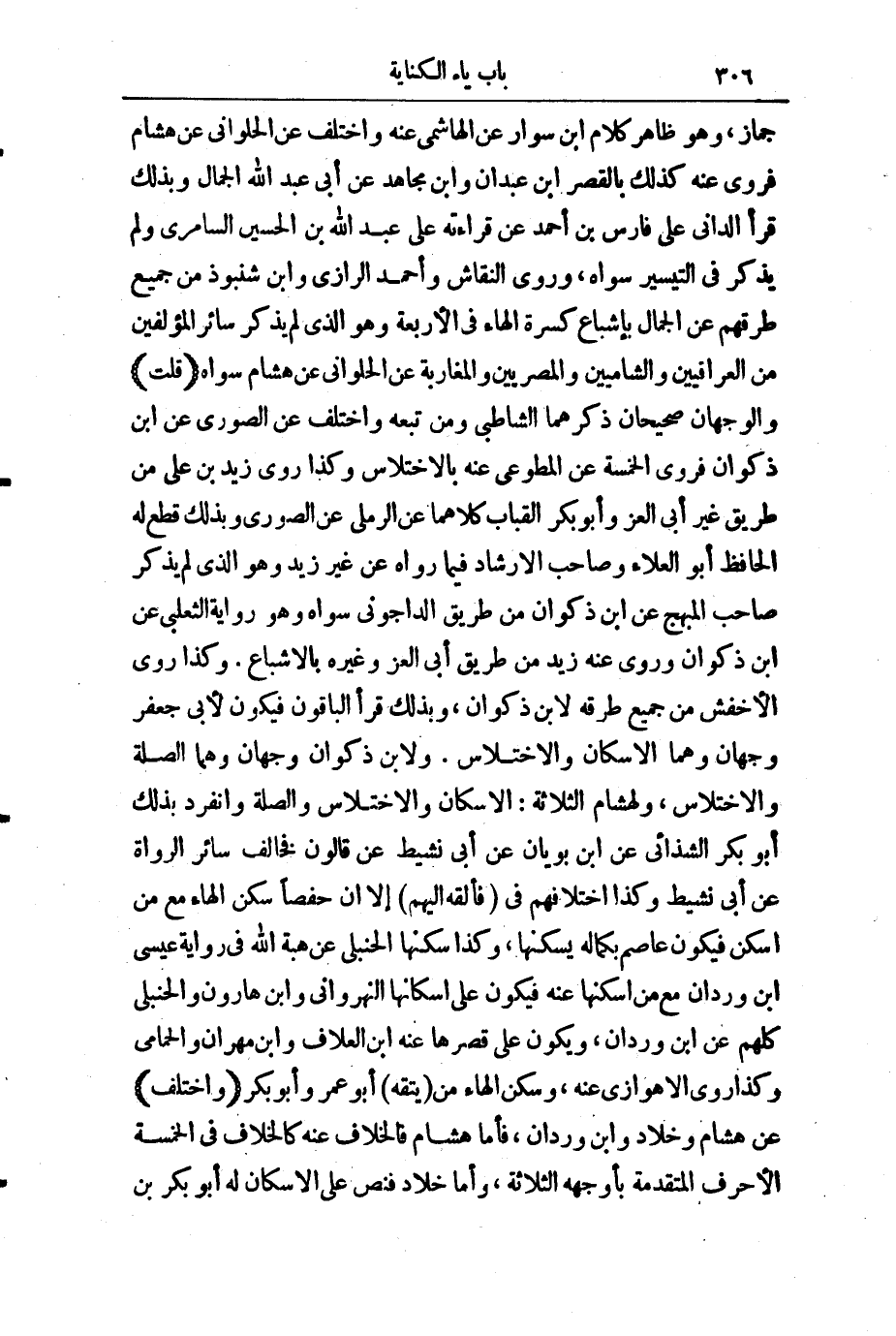 جَمَّازٍ، وَهُوَ ظَاهِرُ كَلَامِ ابْنِ سَوَّارٍ، عَنِ الْهَاشِمِيِّ عَنْهُ، وَاخْتُلِفَ عَنِ الْحُلْوَانِيِّ، عَنْ هِشَامٍ، فَرَوَى عَنْهُ كَذَلِكَ بِالْقَصْرِ ابْنُ عَبْدَانَ وَابْنُ مُجَاهِدٍ، عَنْ أَبِي عَبْدِ اللَّهِ الْجَمَّالِ، وَبِذَلِكَ قَرَأَ الدَّانِيُّ عَلَى فَارِسِ بْنِ أَحْمَدَ، عَنْ قِرَاءَتِهِ عَلَى عَبْدِ اللَّهِ بْنِ الْحُسَيْنِ السَّامَرِّيِّ، وَلَمْ يَذْكُرْ فِي " التَّيْسِيرِ " سِوَاهُ، وَرَوَى النَّقَّاشُ وَأَحْمَدُ الرَّازِيُّ، وَابْنُ شَنَبُوذَ مِنْ جَمِيعِ طُرُقِهِمْ عَنِ الْجَمَّالِ بِإِشْبَاعِ كَسْرَةِ الْهَاءِ فِي الْأَرْبَعَةِ، وَهُوَ الَّذِي لَمْ يَذْكُرْ سَائِرُ الْمُؤَلِّفِينَ مِنَ الْعِرَاقِيِّينَ وَالشَّامِيِّينَ وَالْمِصْرِيِّينَ وَالْمَغَارِبَةِ عَنِ الْحُلْوَانِيِّ، عَنْ هِشَامٍ سِوَاهُ.