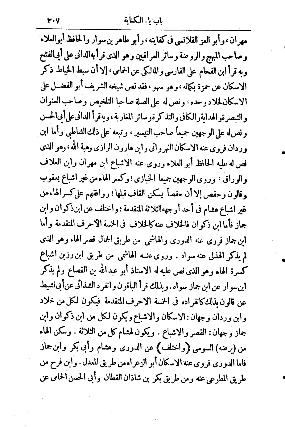 مِهْرَانَ وَأَبُو الْعِزِّ الْقَلَانِسِيُّ فِي كِفَايَتِهِ، وَأَبُو طَاهِرِ بْنُ سَوَّارٍ، وَالْحَافِظُ أَبُو الْعَلَاءِ، وَصَاحِبُ " الْمُبْهِجِ " وَ " الرَّوْضَةِ "، وَسَائِرُ الْعِرَاقِيِّينَ، وَهُوَ الَّذِي قَرَأَ بِهِ الدَّانِيُّ عَلَى أَبِي الْفَتْحِ، وَبِهِ قَرَأَ ابْنُ الْفَحَّامِ عَلَى الْفَارِسِيِّ، وَالْمَالِكِيِّ عَنِ الْحَمَّامِيِّ، إِلَّا أَنَّ سِبْطًا الْخَيَّاطَ ذَكَرَ الْإِسْكَانَ، عَنْ حَمْزَةَ بِكَمَالِهِ، وَهُوَ سَهْوٌ، فَقَدْ نَصَّ شَيْخُهُ الشَّرِيفُ أَبُو الْفَضْلِ عَلَى الْإِسْكَانِ لِخَلَّادٍ وَحْدَهُ، وَنَصَّ لَهُ عَلَى الصِّلَةِ صَاحِبَا " التَّلْخِيصِ " وَصَاحِبُ " الْعُنْوَانِ " وَ " التَّبْصِرَةِ " وَ " الْهِدَايَةِ " وَ " الْكَافِي " وَ " التَّذْكِرَةِ "، وَسَائِرُ الْمَغَارِبَةِ، وَبِهِ قَرَأَ الدَّانِيُّ عَلَى أَبِي الْحَسَنِ وَنَصَّ لَهُ عَلَى الْوَجْهَيْنِ جَمِيعًا صَاحِبُ " التَّيْسِيرِ "، وَتَبِعَهُ عَلَى ذَلِكَ الشَّاطِبِيُّ، وَأَمَّا ابْنُ وَرْدَانَ فَرَوَى عَنْهُ الْإِسْكَانَ النَّهْرَوَانِيُّ، وَابْنُ هَارُونَ الرَّازِيُّ، وَهِبَةُ اللَّهِ، وَهُوَ الَّذِي نَصَّ عَلَيْهِ الْحَافِظُ أَبُو الْعَلَاءِ، وَرَوَى عَنْهُ الْإِشْبَاعَ ابْنُ مِهْرَانَ وَابْنُ الْعَلَّافِ، وَالْوَرَّاقُ، وَرَوَى الْوَجْهَيْنِ جَمِيعًا الْخَبَّازِيُّ، وَكَسَرَ الْهَاءَ مِنْ غَيْرِ إِشْبَاعٍ يَعْقُوبُ وَقَالُونُ وَحَفْصٌ، إِلَّا أَنَّ حَفْصًا يُسَكِّنُ الْهَاءَ قَبْلَهَا، وَوَافَقَهُمْ عَلَى كَسْرِ الْهَاءِ مِنْ غَيْرِ إِشْبَاعٍ هِشَامٌ فِي أَحَدِ أَوْجُهِهِ الثَّلَاثَةِ الْمُتَقَدِّمَةِ، وَاخْتُلِفَ عَنِ ابْنِ ذَكْوَانَ وَابْنِ جَمَّازٍ، فَأَمَّا ابْنُ ذَكْوَانَ فَالْخِلَافُ عَنْهُ كَالْخِلَافِ فِي الْخَمْسَةِ الْأَحْرُفِ الْمُتَقَدَّمَةِ، وَأَمَّا ابْنُ جَمَّازٍ فَرَوَى عَنْهُ الدُّورِيُّ وَالْهَاشِمِيُّ مِنْ طَرِيقِ الْجَمَّالِ قَصْرَ الْهَاءِ، وَهُوَ الَّذِي لَمْ يَذْكُرِ الْهُذَلِيُّ عَنْهُ سِوَاهُ. وَرَوَى عَنْهُ الْهَاشِمِيُّ مِنْ طَرِيقِ ابْنِ رَزِينٍ إِشْبَاعَ كَسْرَةِ الْهَاءِ، وَهُوَ الَّذِي نَصَّ عَلَيْهِ لَهُ الْأُسْتَاذُ أَبُو عَبْدِ اللَّهِ بْنُ الْقَصَّاعِ، وَلَمْ يَذْكُرِ ابْنُ سَوَّارٍ عَنِ ابْنِ جَمَّازٍ سِوَاهُ، وَبِذَلِكَ قَرَأَ الْبَاقُونَ، وَانْفَرَدَ الشَّذَائِيُّ عَنْ أَبِي نَشِيطٍ، عَنْ قَالُونَ بِذَلِكَ، كَانْفِرَادِهِ فِي الْخَمْسَةِ الْأَحْرُفِ الْمُتَقَدِّمَةِ، فَيَكُونُ لِكُلٍّ مِنْ خَلَّادٍ وَابْنِ وَرْدَانَ وَجْهَانِ: الْإِسْكَانُ وَالْإِشْبَاعُ، وَيَكُونُ لِكُلٍّ مِنِ ابْنِ ذَكْوَانَ وَابْنِ جَمَّازٍ وَجْهَانِ: الْقَصْرُ وَالْإِشْبَاعُ، وَيَكُونُ لِهِشَامٍ كُلٌّ مِنَ الثَّلَاثَةِ.