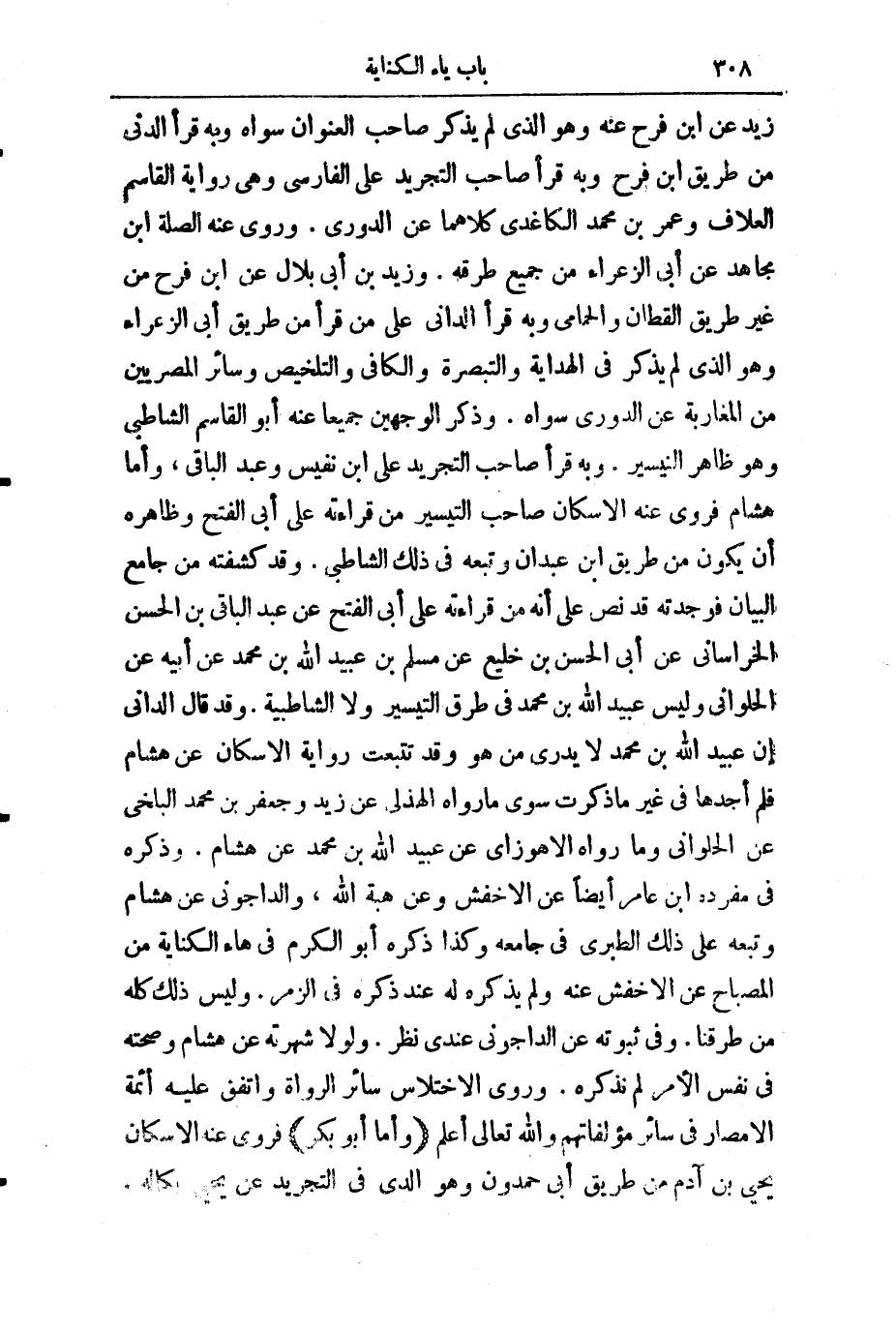 وَقَدْ كَشَفْتُهُ مِنْ " جَامِعِ الْبَيَانِ " فَوَجَدْتُهُ قَدْ نَصَّ عَلَى أَنَّهُ مِنْ قِرَاءَتِهِ عَلَى أَبِي الْفَتْحِ، عَنْ عَبْدِ الْبَاقِي بْنِ الْحَسَنِ الْخُرَاسَانِيِّ، عَنْ أَبِي الْحَسَنِ بْنِ خَلِيعٍ، عَنْ مُسْلِمِ بْنِ عُبَيْدِ اللَّهِ بْنِ مُحَمَّدٍ، عَنْ أَبِيهِ، عَنِ الْحُلْوَانِيِّ، وَلَيْسَ عُبَيْدُ اللَّهِ بْنُ مُحَمَّدٍ مِنْ طُرُقِ " التَّيْسِيرِ " وَلَا " الشَّاطِبِيَّةِ ". وَقَدْ قَالَ الدَّانِيُّ: إِنَّ عُبَيْدَ اللَّهِ بْنَ مُحَمَّدٍ لَا يُدْرَى مَنْ هُوَ، وَقَدْ تَتَبَّعْتُ رِوَايَةَ الْإِسْكَانِ عَنْ هِشَامٍ فَلَمْ أَجِدْهَا فِي غَيْرِ مَا ذَكَرْتُ سِوَى مَا رَوَاهُ الْهُذَلِيُّ، عَنْ زَيْدٍ وَجَعْفَرِ بْنِ مُحَمَّدٍ الْبَلْخِيِّ، عَنِ الْحُلْوَانِيِّ، وَمَا رَوَاهُ الْأَهْوَازِيُّ، عَنْ عُبَيْدِ اللَّهِ بْنِ مُحَمَّدٍ، عَنْ هِشَامٍ، وَذَكَرَهُ فِي مُفْرَدِهِ ابْنُ عَامِرٍ، عَنِ الْأَخْفَشِ، وَعَنْ هِبَةِ اللَّهِ، وَالدَّاجُونِيُّ، عَنْ هِشَامٍ، وَتَبِعَهُ عَلَى ذَلِكَ الطَّبَرِيُّ فِي جَامِعِهِ، وَكَذَا ذَكَرَهُ أَبُو الْكَرَمِ فِي هَاءِ الْكِنَايَةِ مِنَ " الْمِصْبَاحِ "، عَنِ الْأَخْفَشِ، عَنْهُ، وَلَمْ يَذْكُرْهُ لَهُ عِنْدَ ذِكْرِهِ فِي الزُّمَرِ، وَلَيْسَ ذَلِكَ كُلُّهُ مِنْ طُرُقِنَا، وَفِي ثُبُوتِهِ عَنِ الدَّاجُونِيِّ عِنْدِي نَظَرٌ، وَلَوْلَا شُهْرَتُهُ، عَنْ هِشَامٍ وَصِحَّتُهُ فِي نَفْسِ الْأَمْرِ لَمْ نَذْكُرْهُ. وَرَوَى الِاخْتِلَاسَ سَائِرُ الرُّوَاةِ، وَاتَّفَقَ عَلَيْهِ أَئِمَّةُ الْأَمْصَارِ فِي سَائِرِ مُؤَلَّفَاتِهِمْ، وَاللَّهُ تَعَالَى أَعْلَمُ.